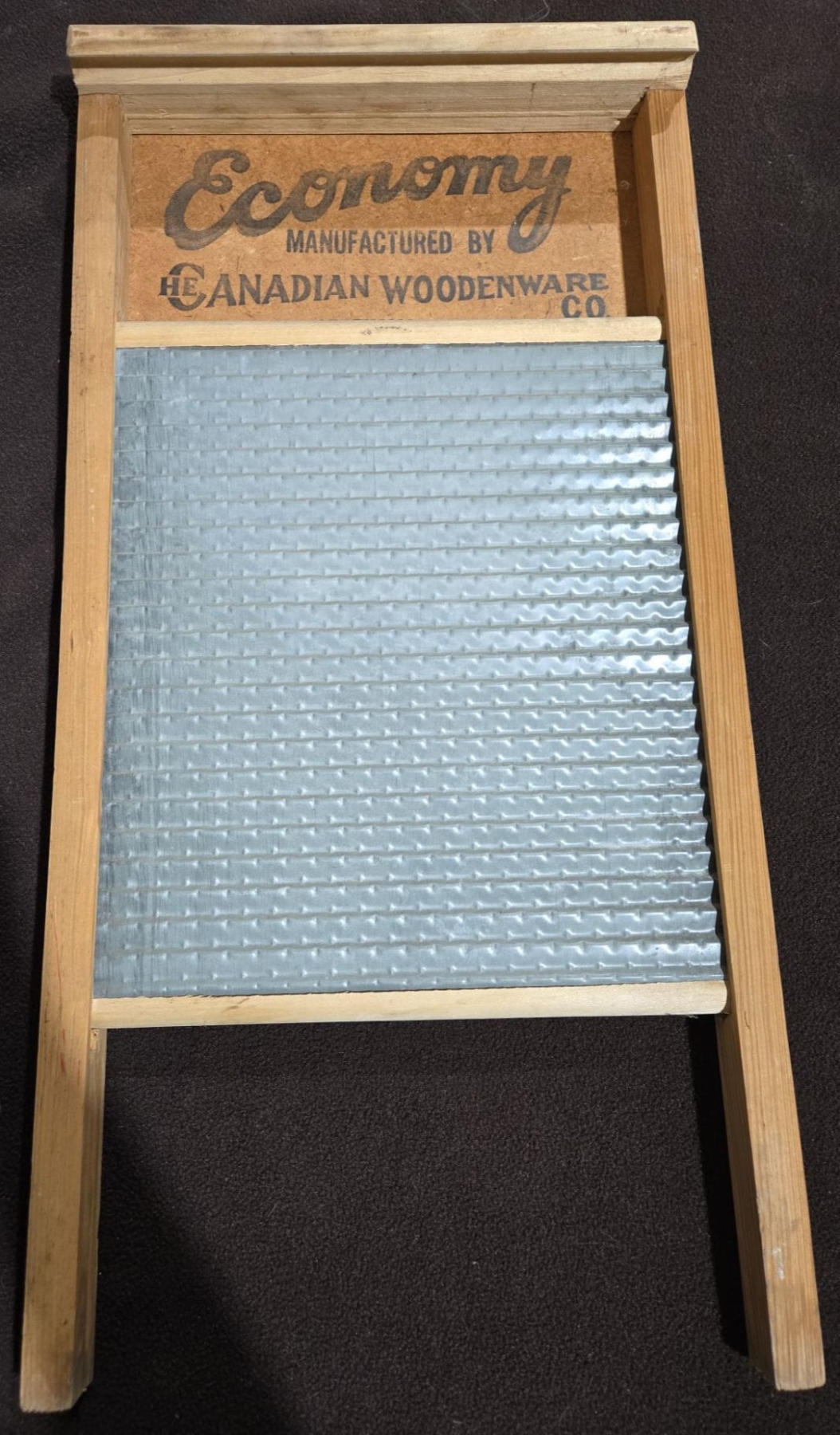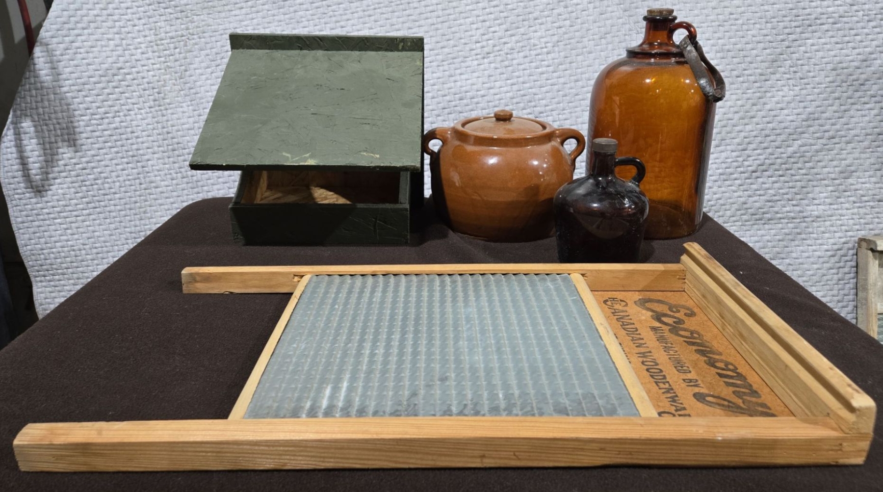 Economy Canadian Woodenware Co. Wash Board, 2 Brown Glass Jugs, Lidded Crock + Bird House