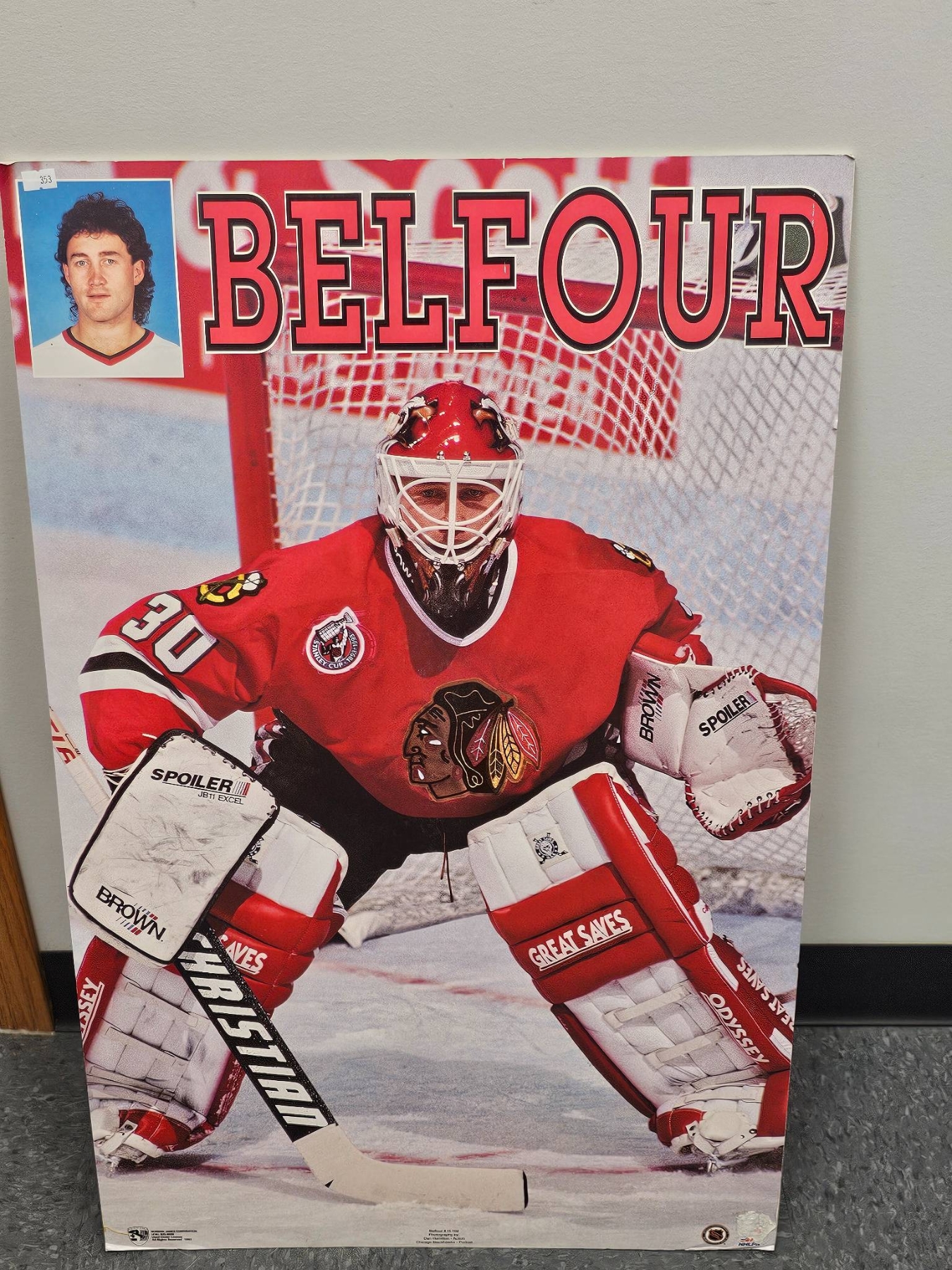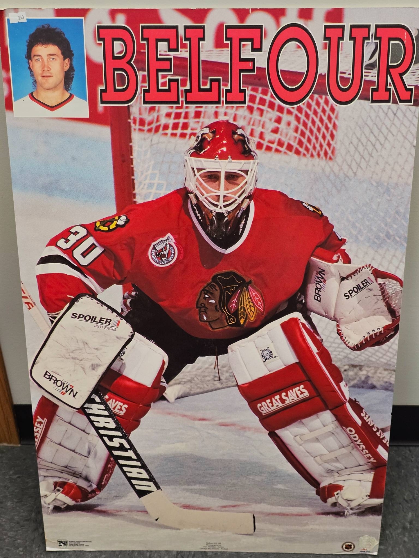 Ed Belfour poster featuring the legendary Chicago Blackhawks goaltender in action. Depicts Belfour in full gear with sharp details and a bold design that includes his name prominently displayed. Measures approximately 22 x 34 inches and is in good condition, showing minimal wear. A great collectible for hockey enthusiasts or Blackhawks fans.