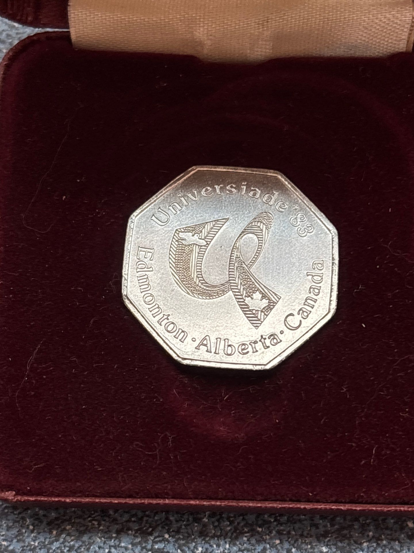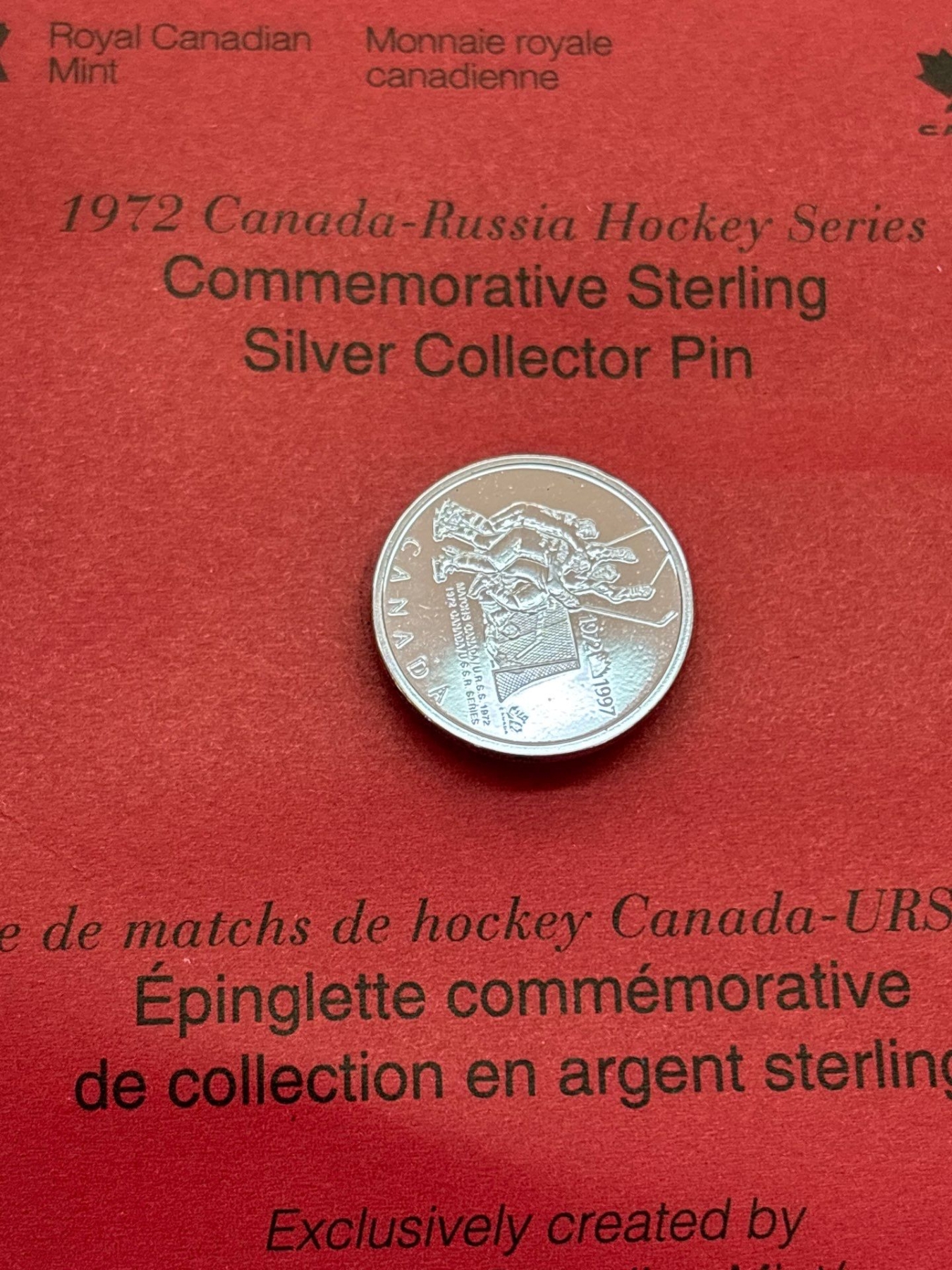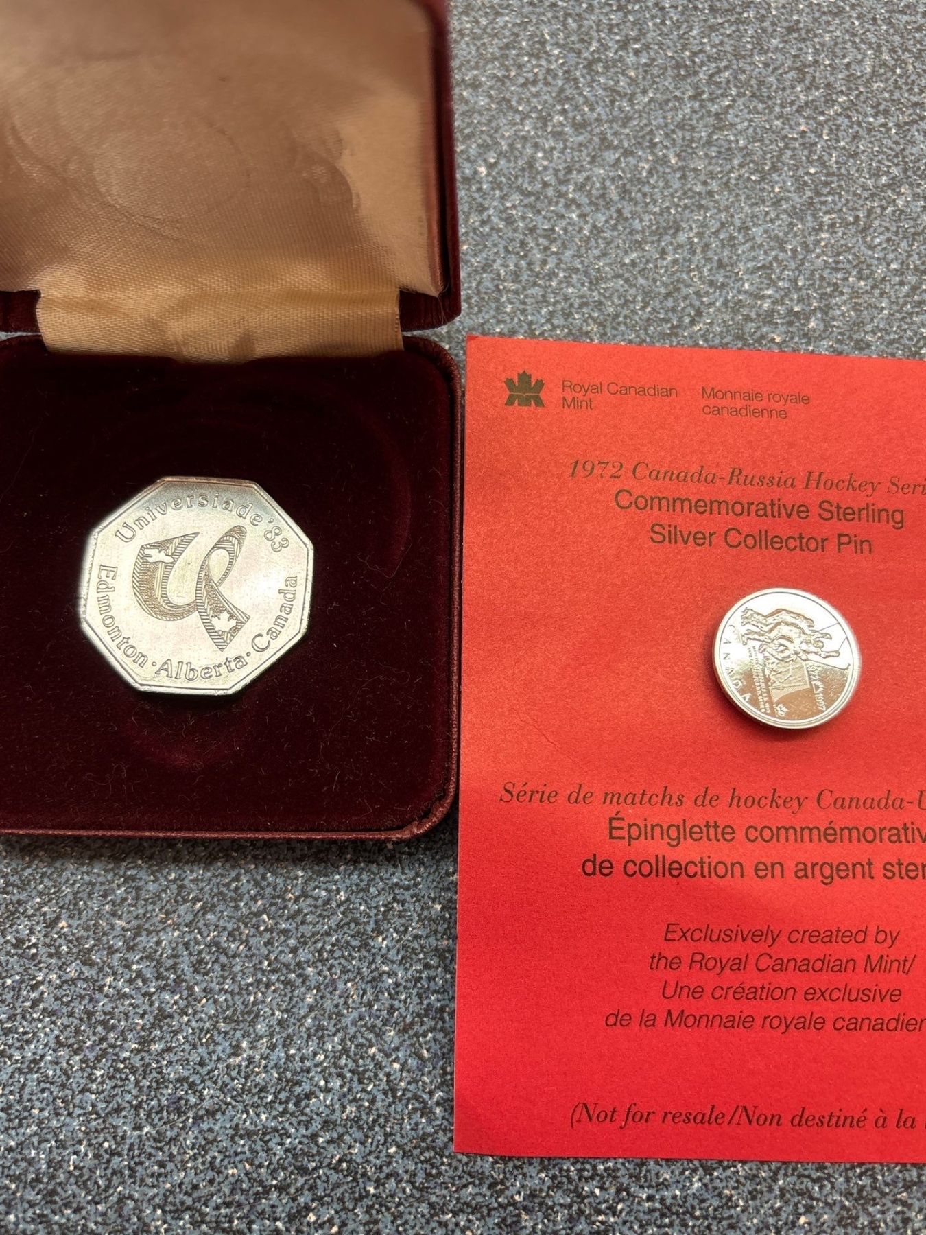 Edmonton AB CANADA 1983 Universiade '83 Appreciation Medal with 8-Sided Shape with a 1972 Canada and Russia, hockey series, commemorative sterling silver collector pin