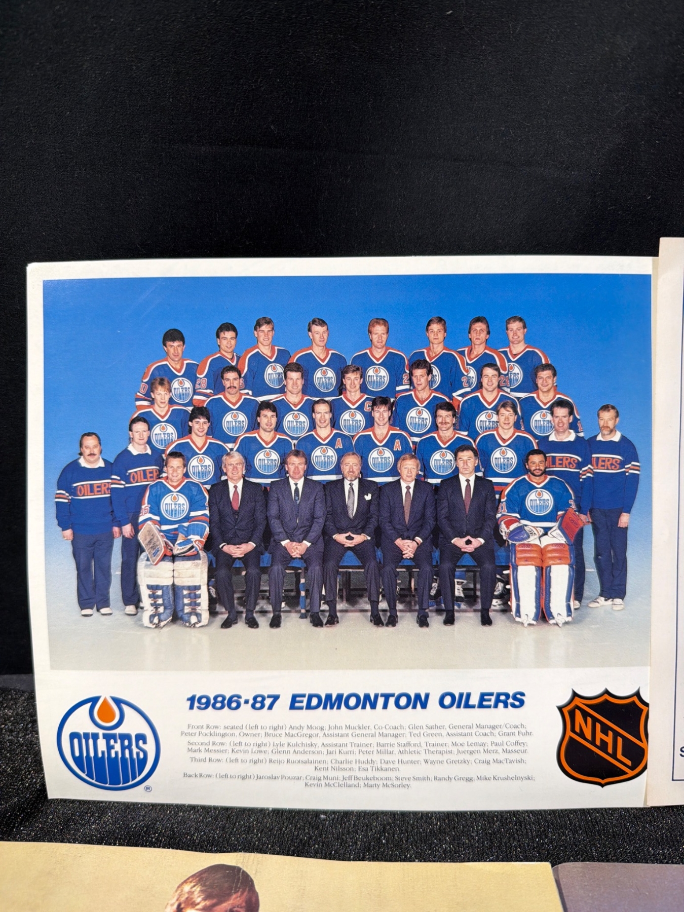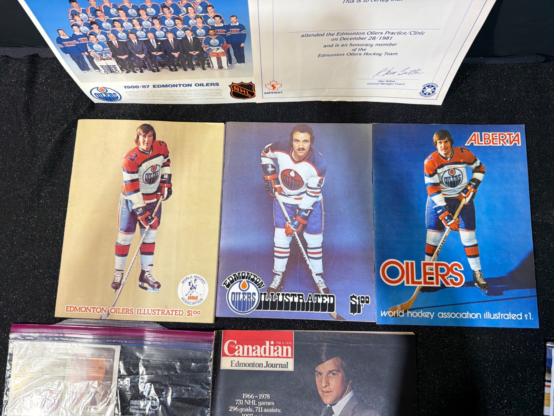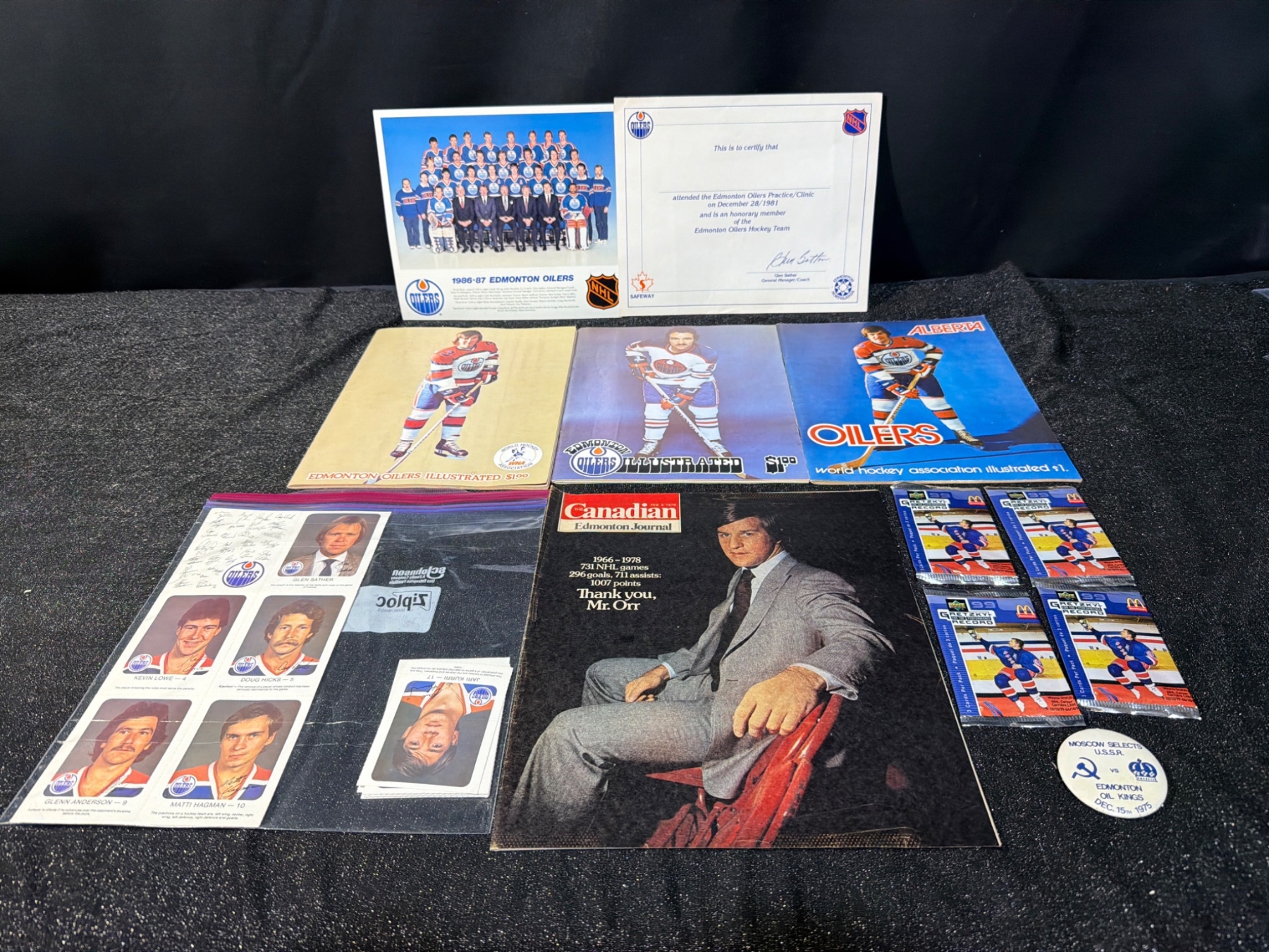 Unique Edmonton Oilers memorabilia lot, including four unopened Wayne Gretzky "Record 99" hockey card packs by McDonald's, team photos, and autographed items displayed in protective coverings. Assorted team-related materials, featuring a 1986-87 team photo, vintage magazines, and promotional items ideal for an Oilers fan or collector. Measurements not specified.