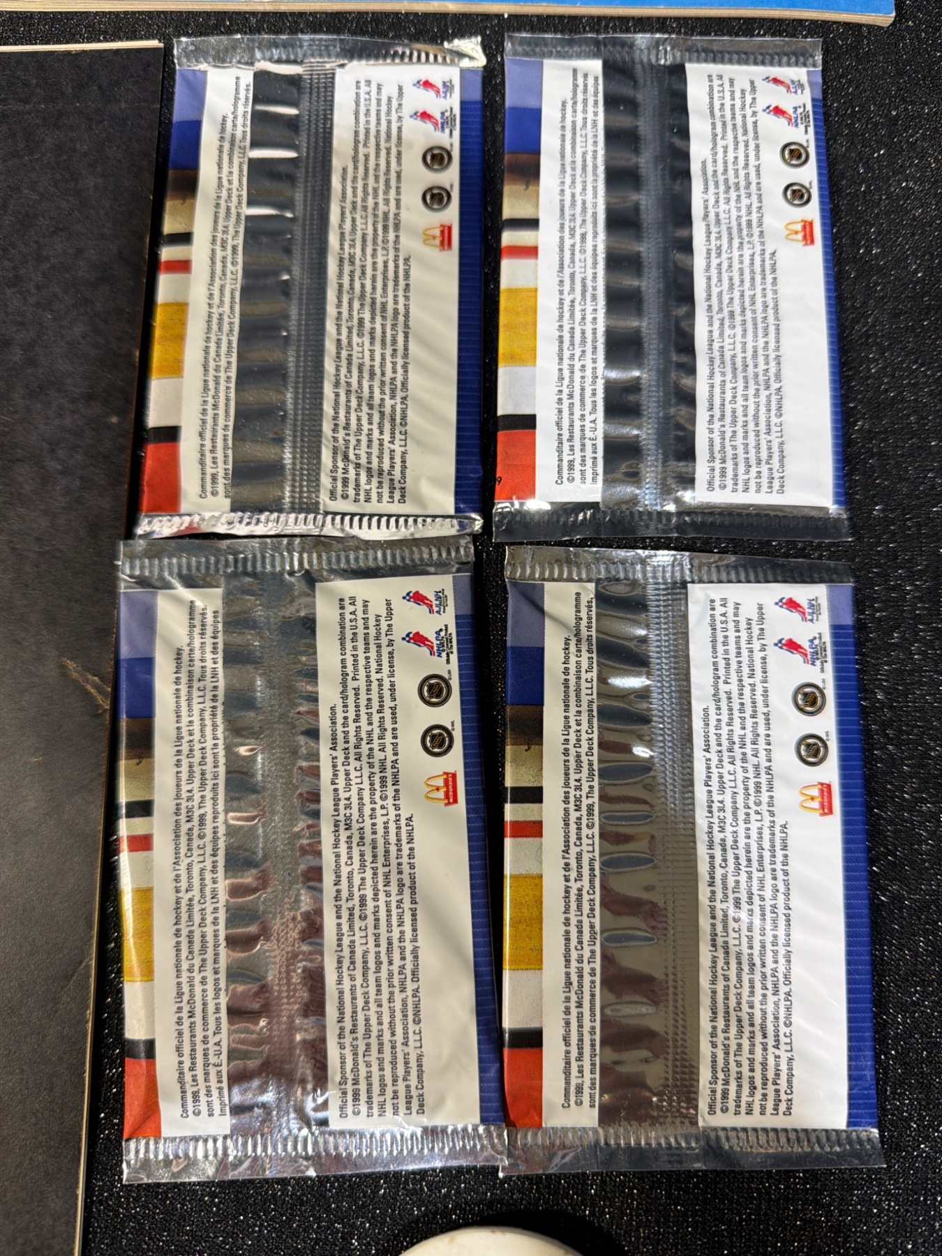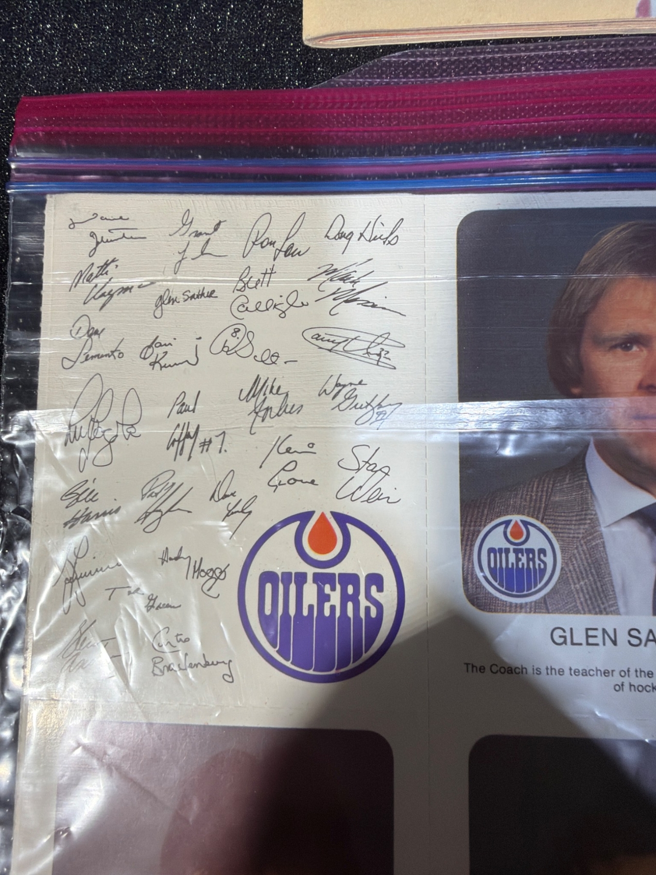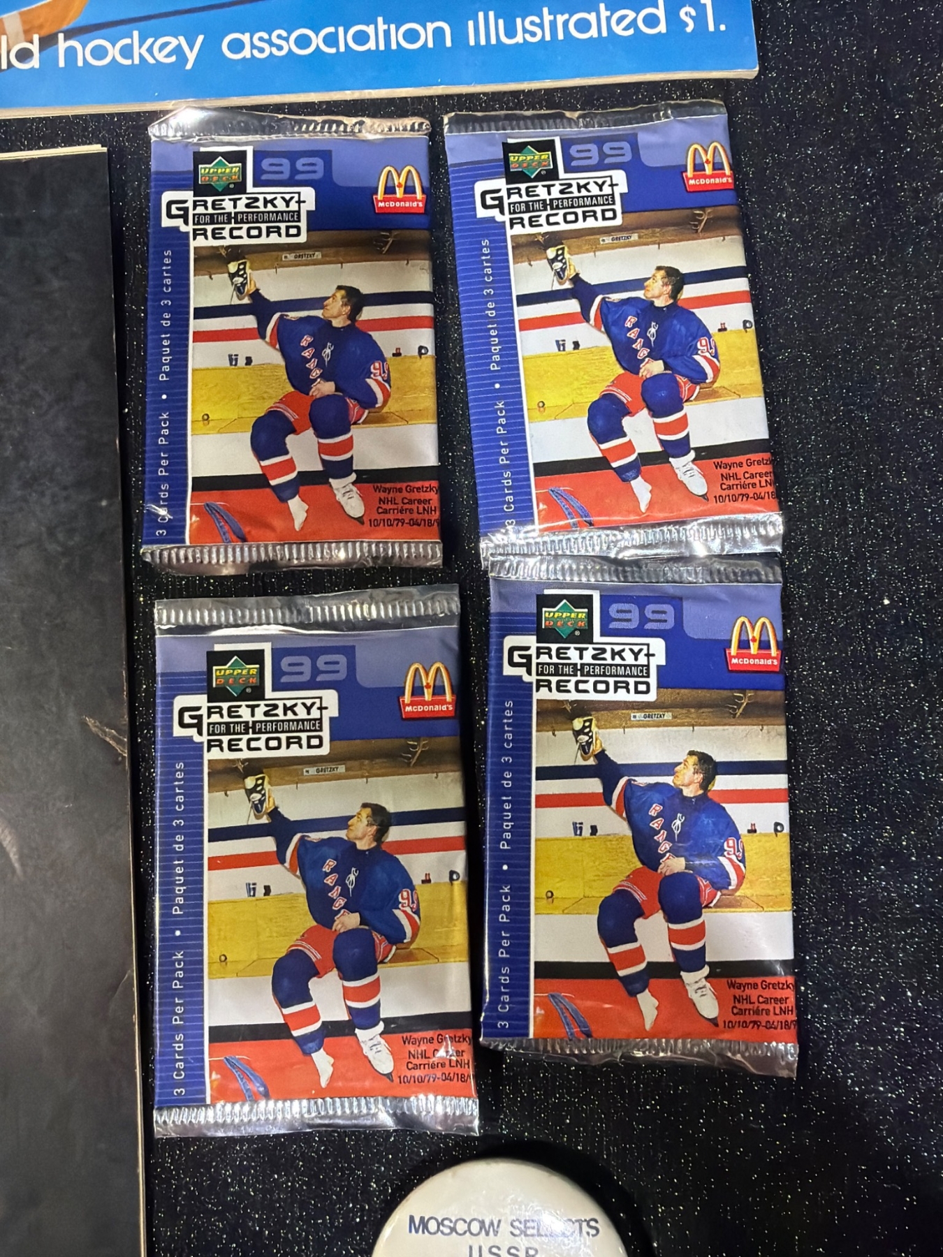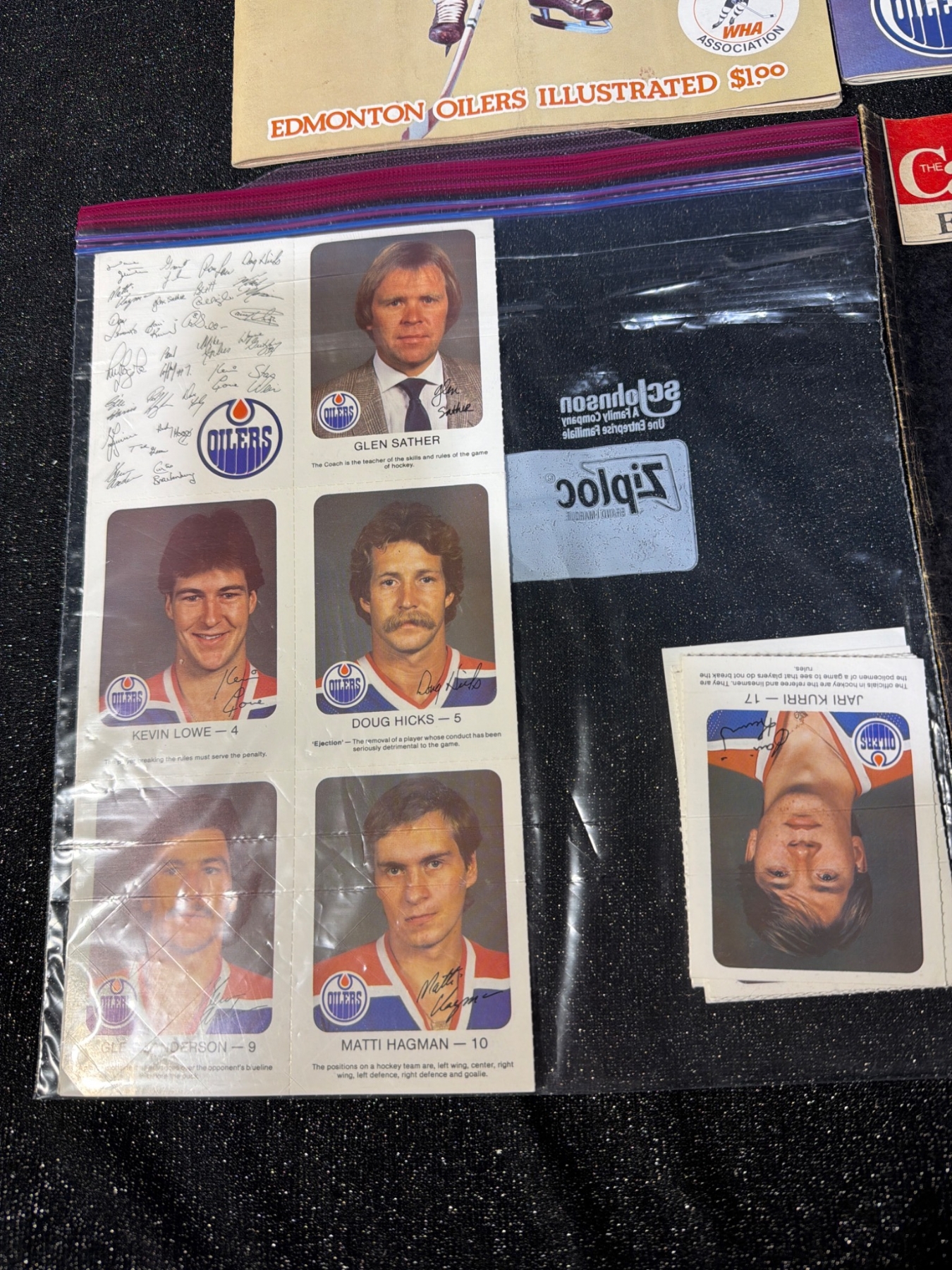 Unique Edmonton Oilers memorabilia lot, including four unopened Wayne Gretzky "Record 99" hockey card packs by McDonald's, team photos, and autographed items displayed in protective coverings. Assorted team-related materials, featuring a 1986-87 team photo, vintage magazines, and promotional items ideal for an Oilers fan or collector. Measurements not specified.