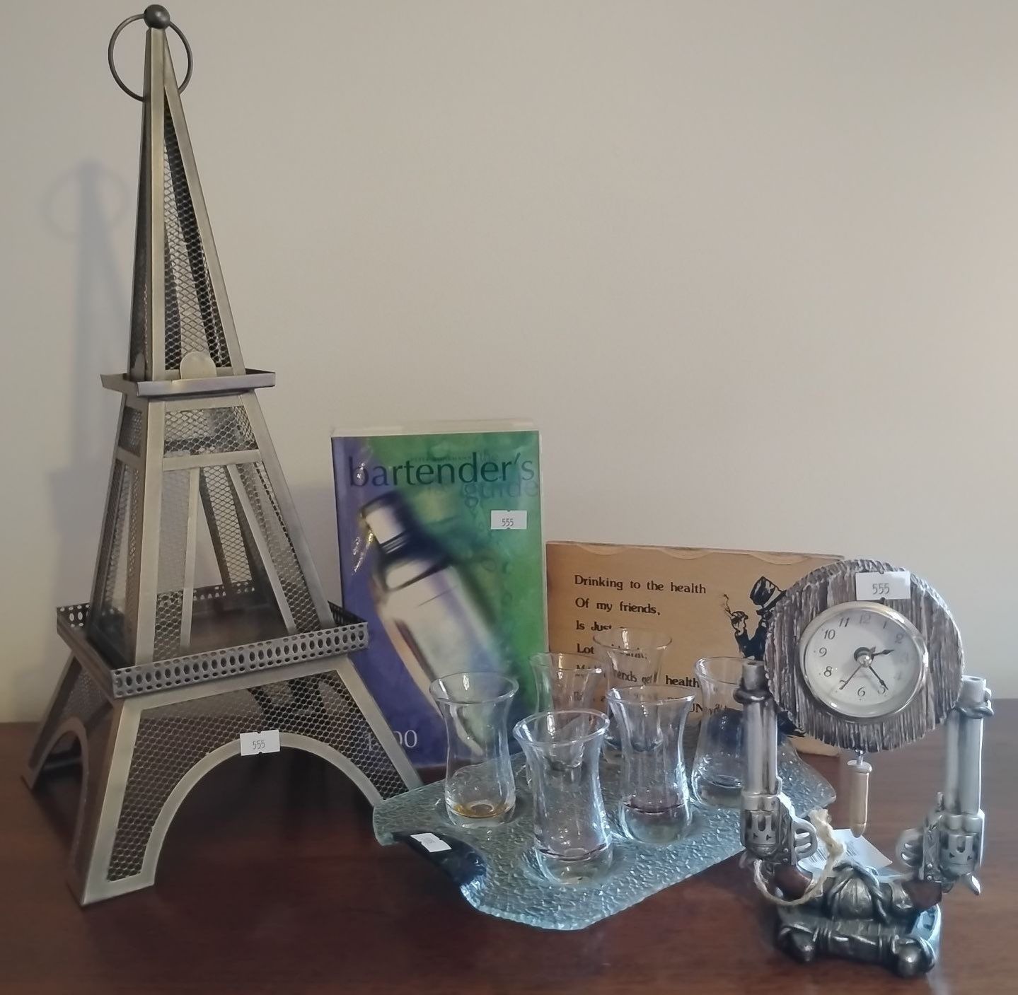Eiffell Tower Trinket Box 17T Bartenders Handbook Shot Glasses w/ Tray & More