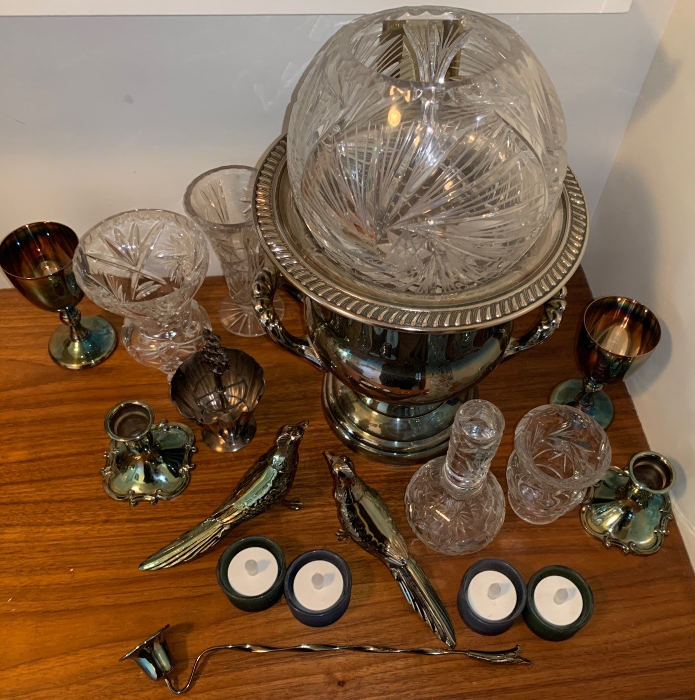 Elegant Iridescent Mud Puddle Effect Metal Servingware w/ Crystal Glassware Collection