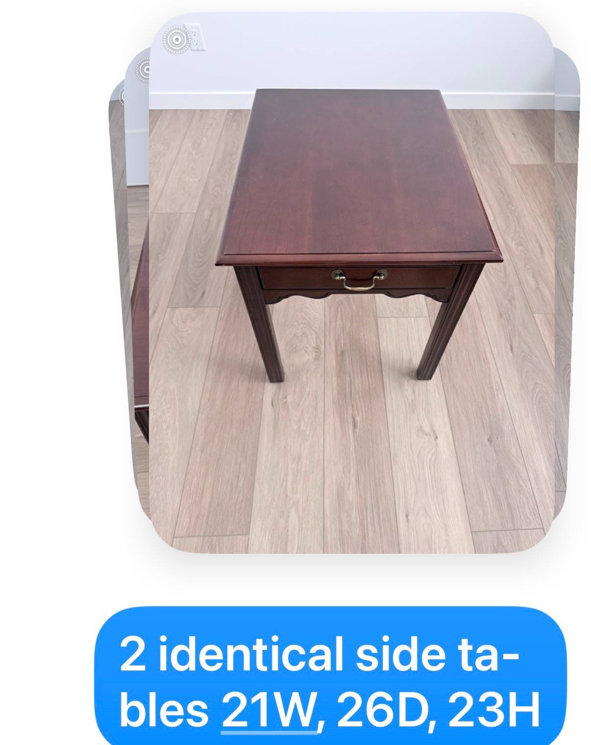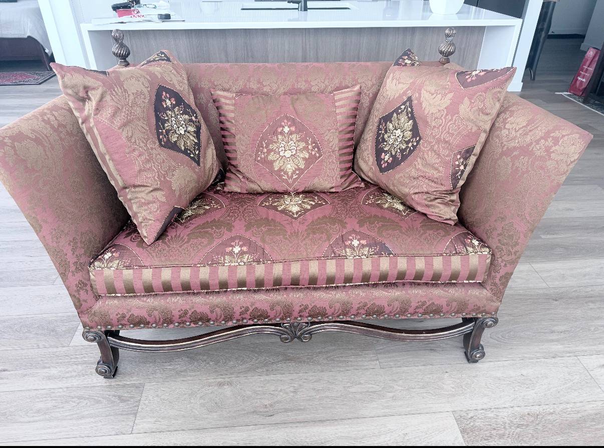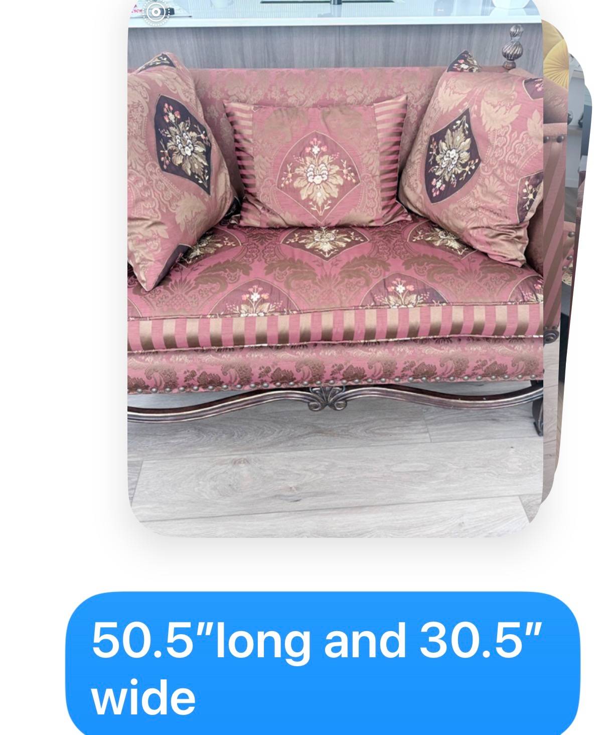 Combining comfort and classic design, this lot features a plush loveseat measuring 50.5‚" long and 30.5‚" wide, adorned with rich patterned upholstery and decorative throw pillows. The carved wooden frame adds a touch of timeless sophistication. Completing the set are two identical side tables, measuring 21‚Ä= W, 26‚Ä= D, and 23‚Ä= H, crafted from polished wood and equipped with drawers for additional storage.