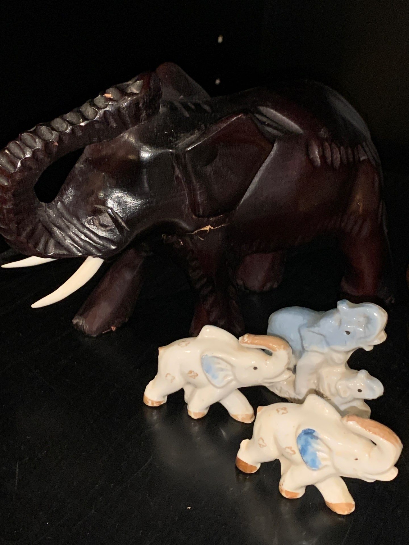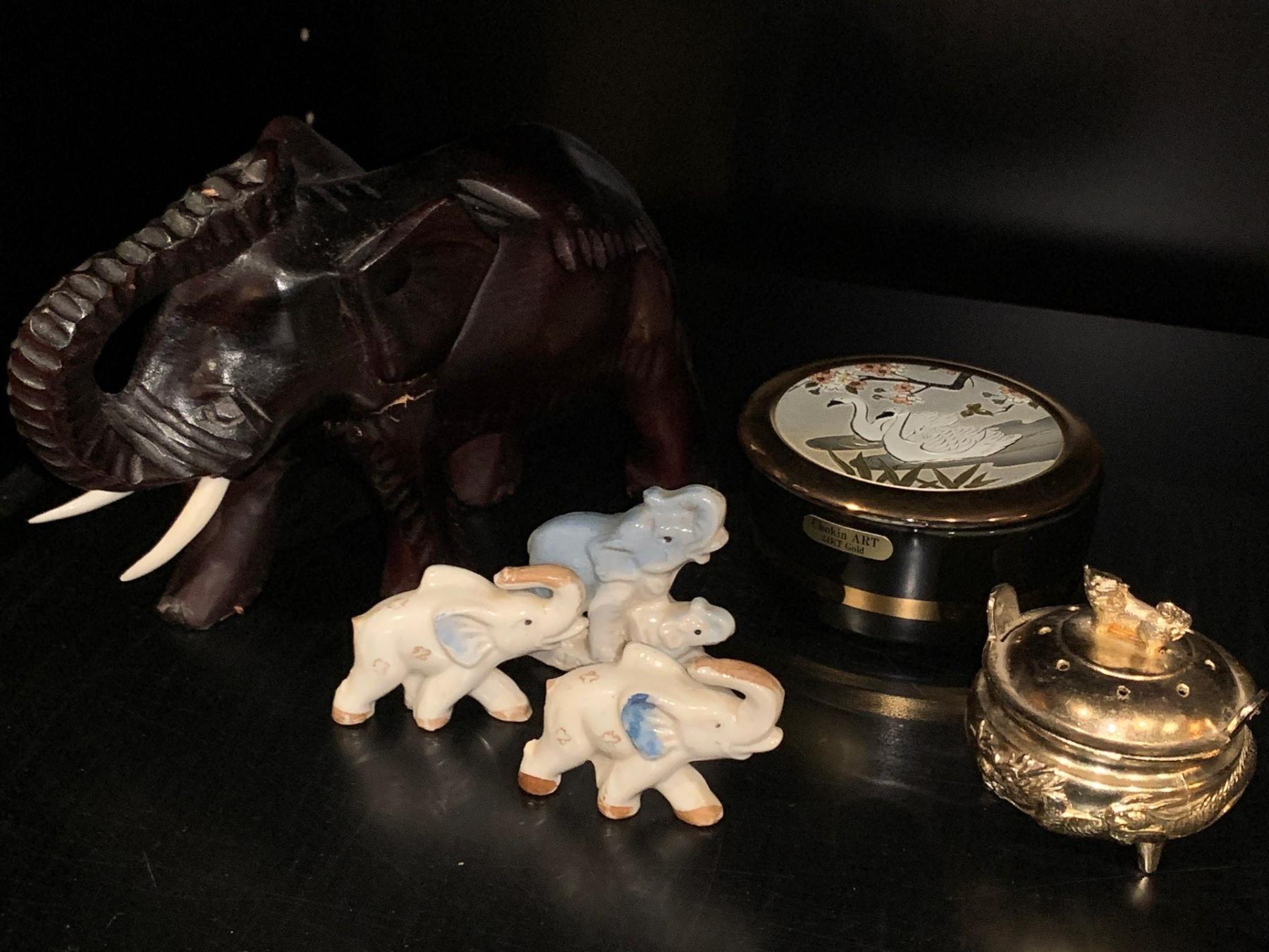 Elephant Decorative Figurines w/ Chokin Art 24kt Gold Trinket Box & Oriental Brass Trinket Holder