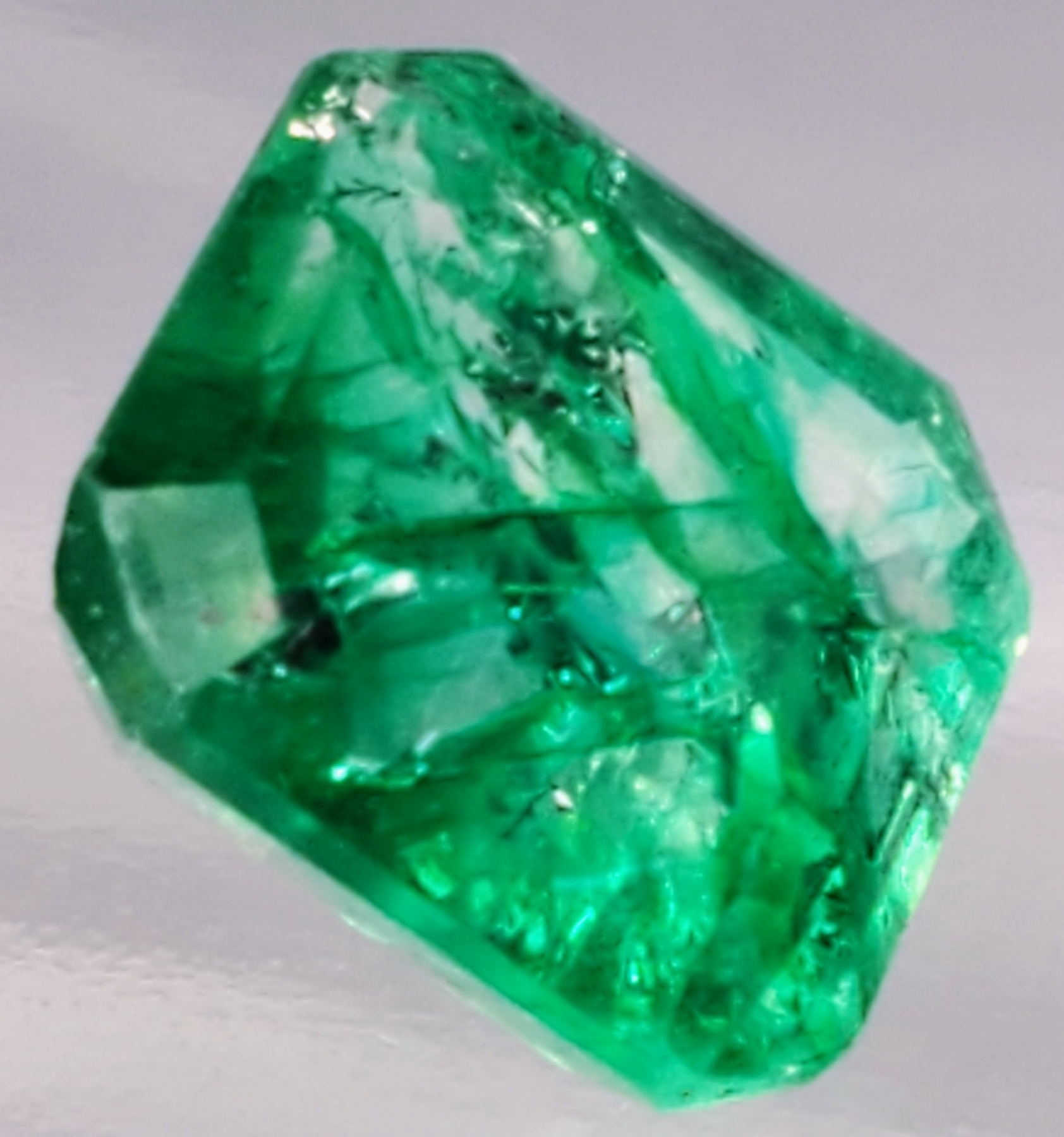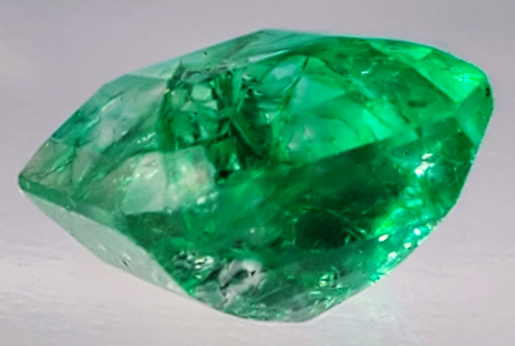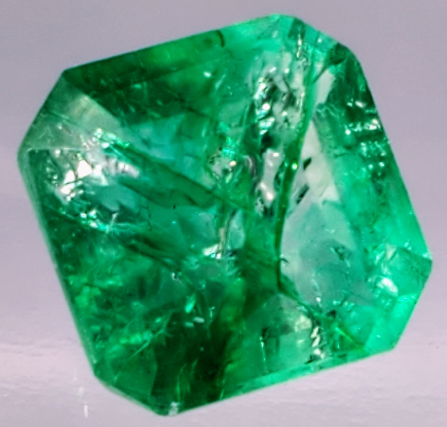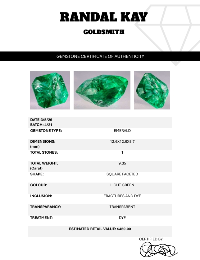 A 9.35-carat light-green emerald with square faceting, transparent body, and visible fractures. Dye treatment enhances color, offering bold presence at value pricing. Estimated retail price is $450.