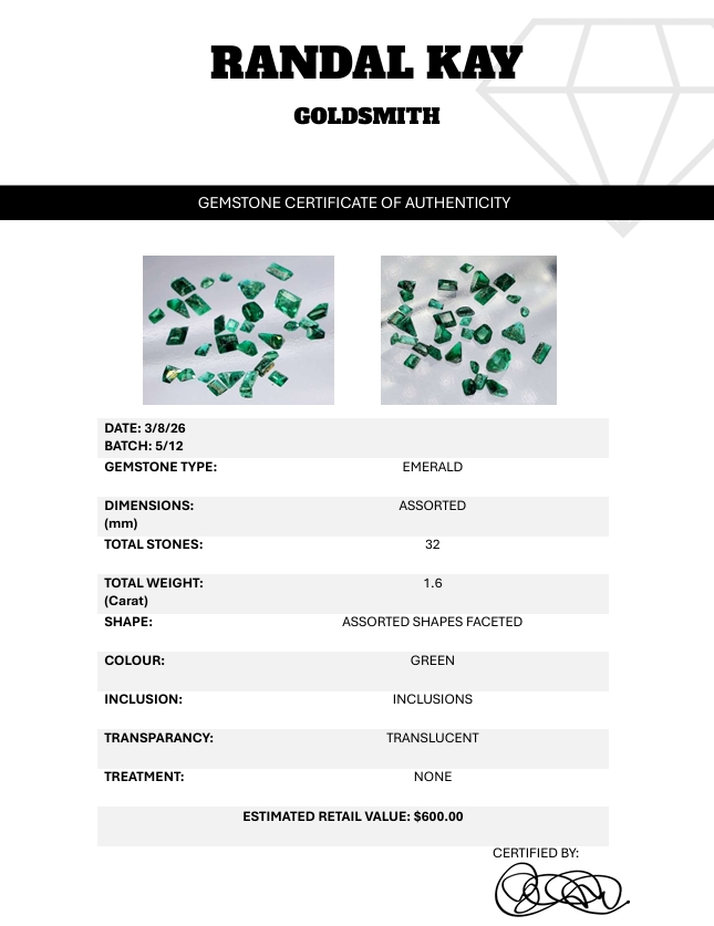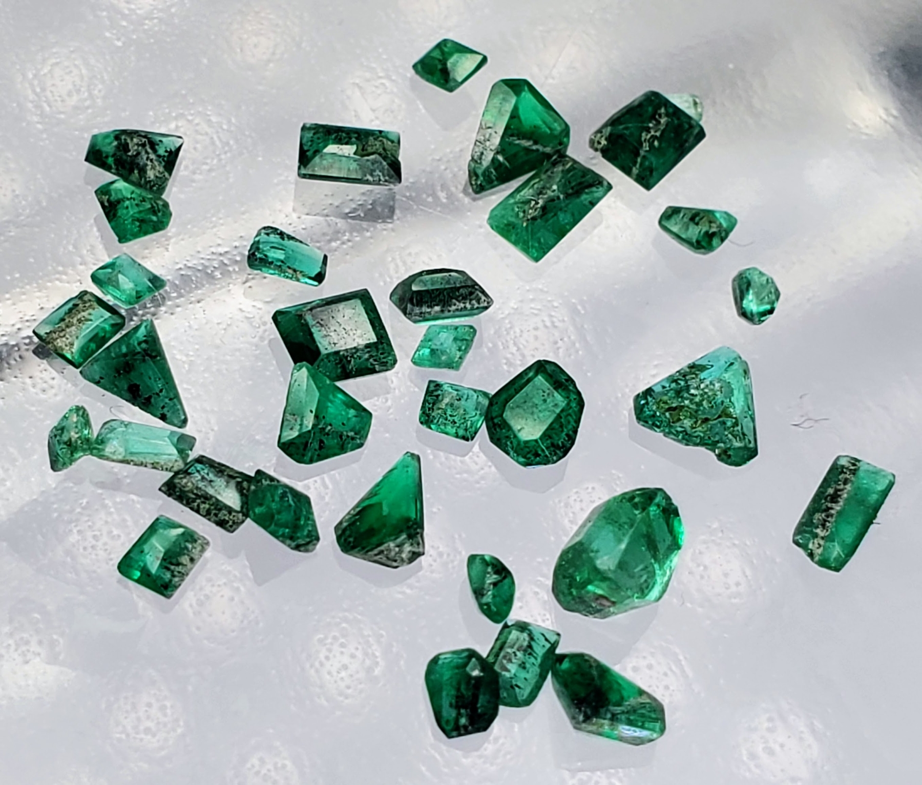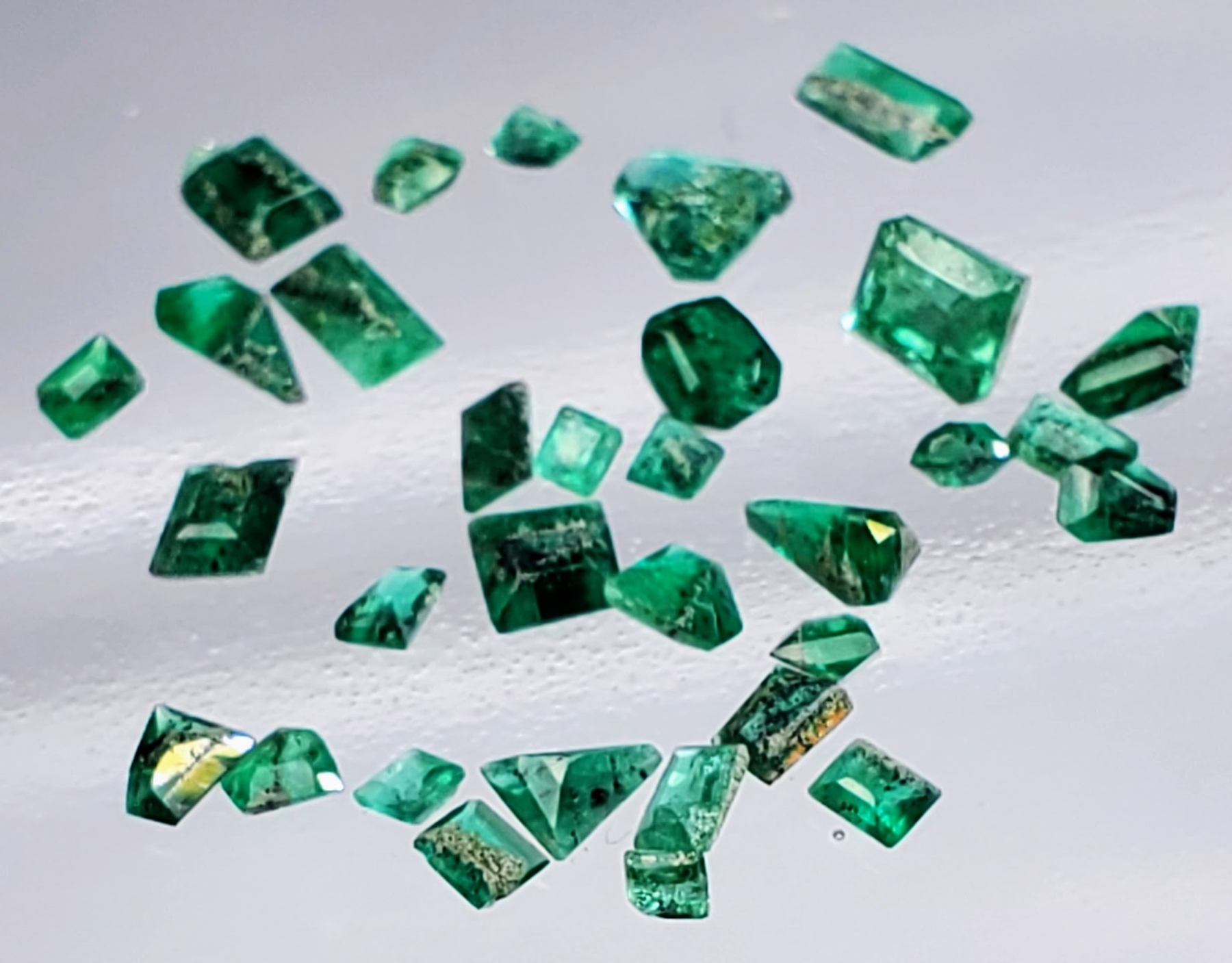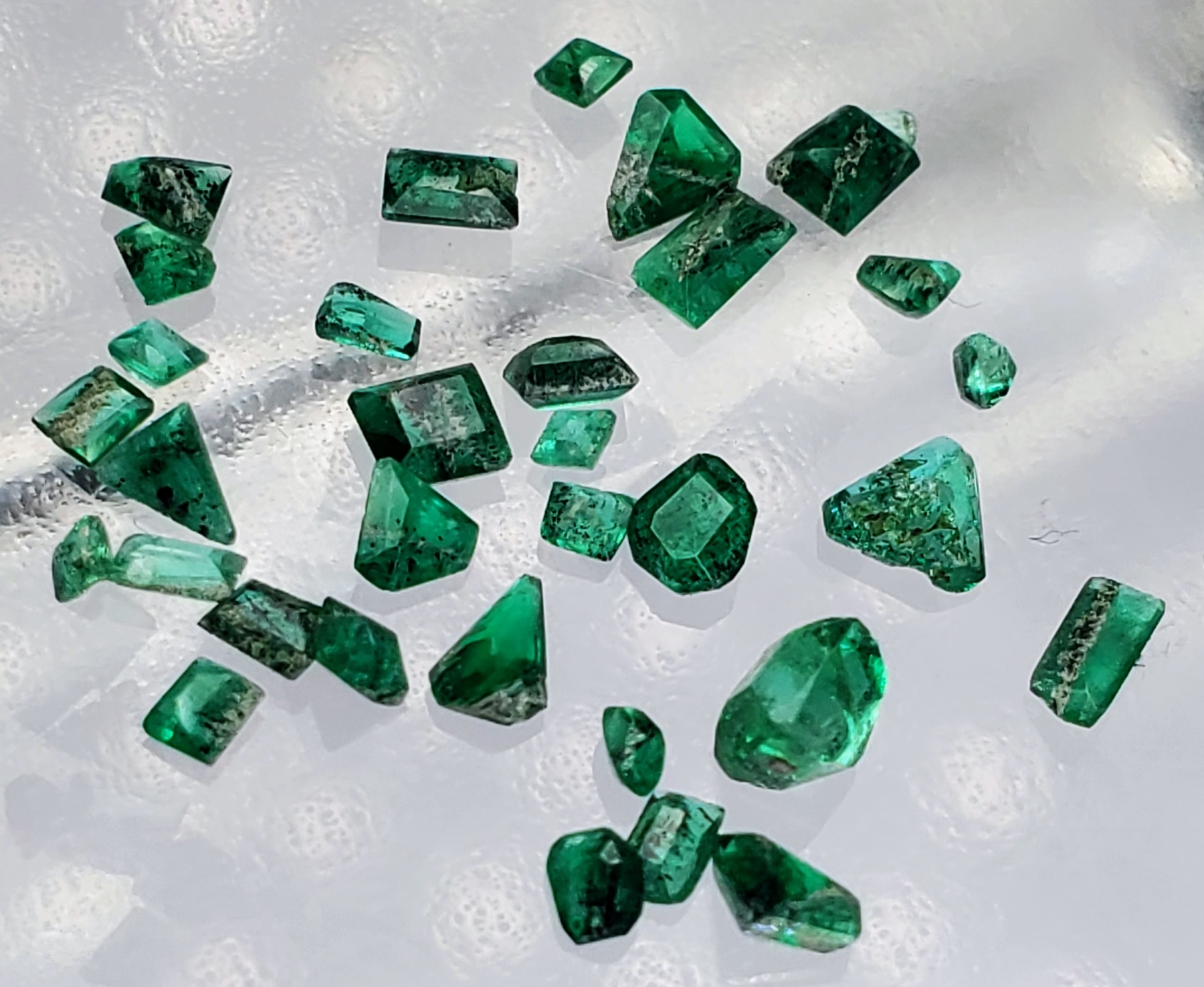 A 32-stone emerald parcel totaling 1.6 carats, featuring translucent green color, natural inclusions, and assorted faceted shapes. Untreated and ideal for small settings. Estimated retail price is $600.