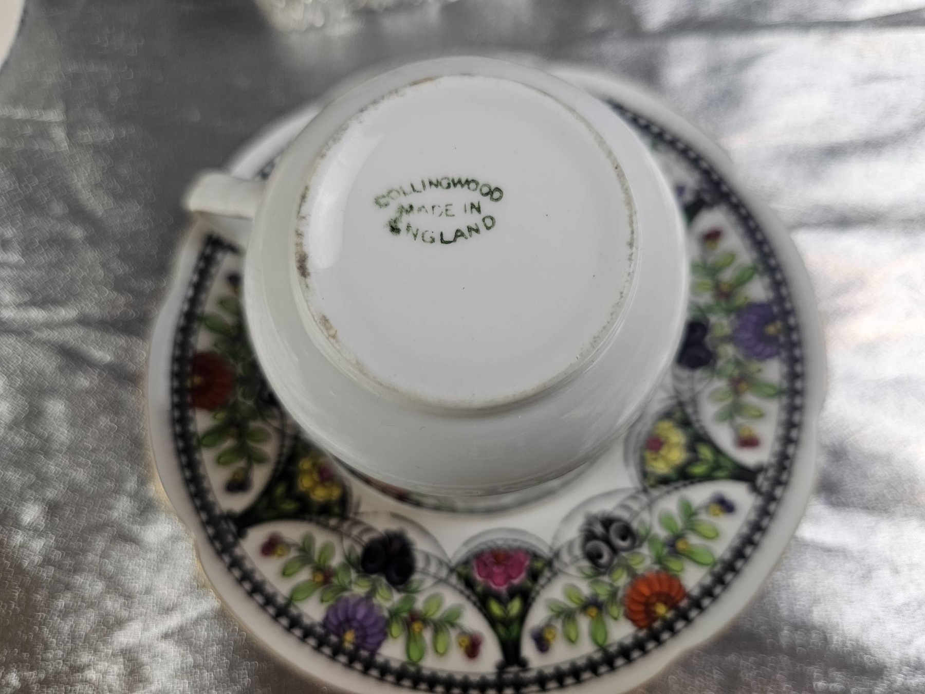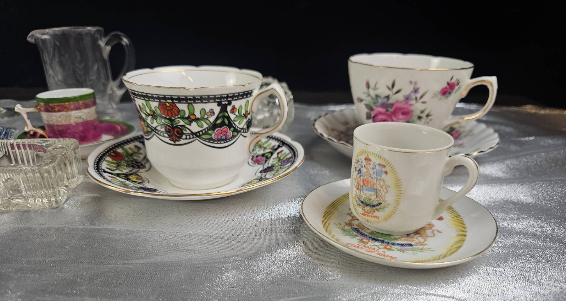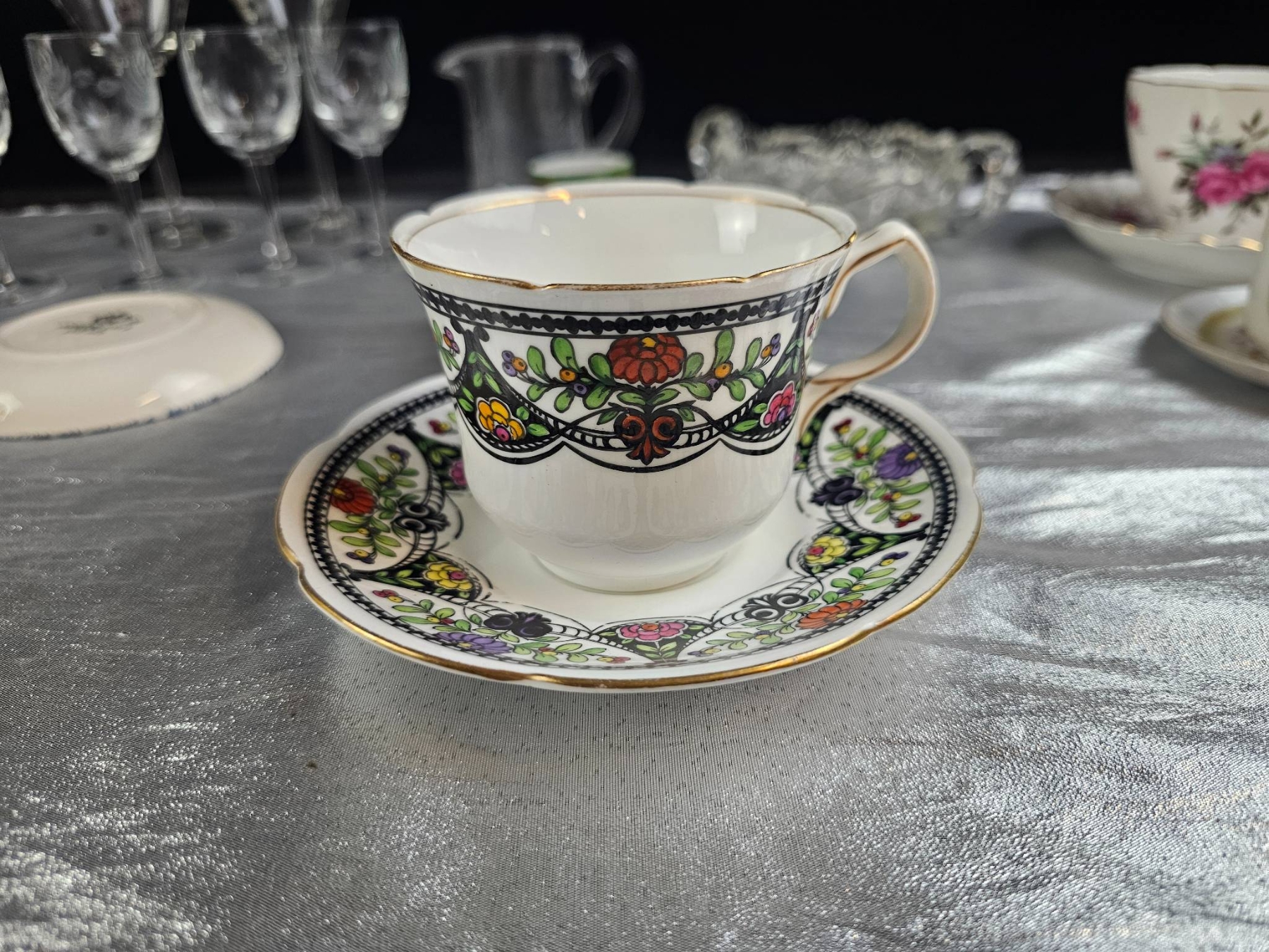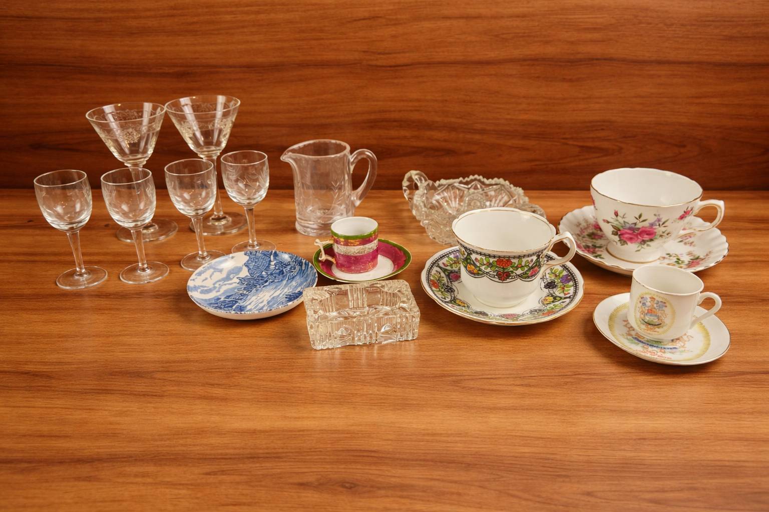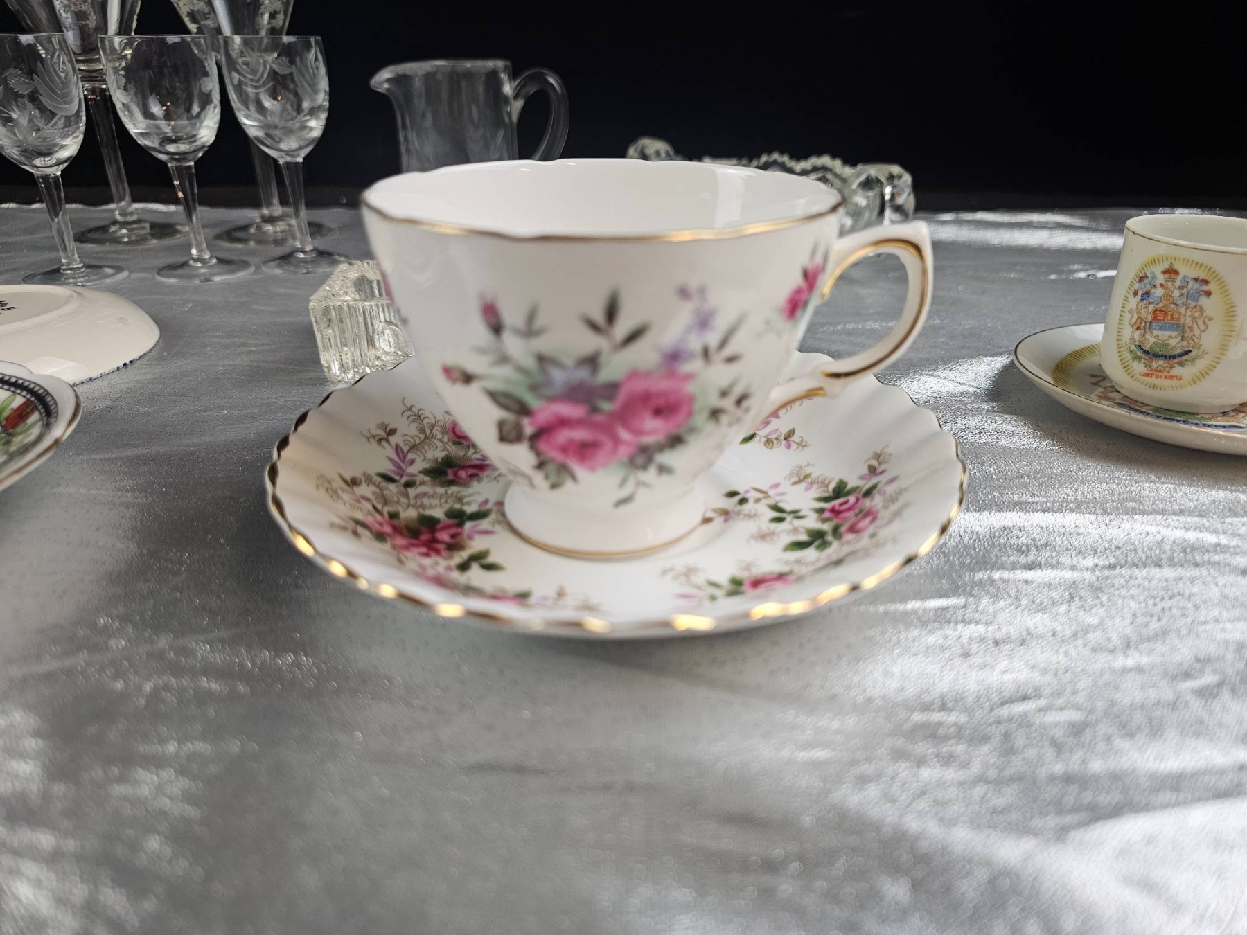 This lot features a diverse selection of teacups, saucers, and collectible glassware. Included are cups and saucers from distinguished brands such as Royal Albert, Collingwood, Queen Anne, and Johnson Brothers, with hallmark stamps verifying authenticity. Additionally, the set includes delicately etched stemmed glasses, a small jug, and a plate showcasing a charming countryside design, marked by Johnson Brothers. Items are in good condition without significant damage, making them ideal for collectors or enthusiasts.