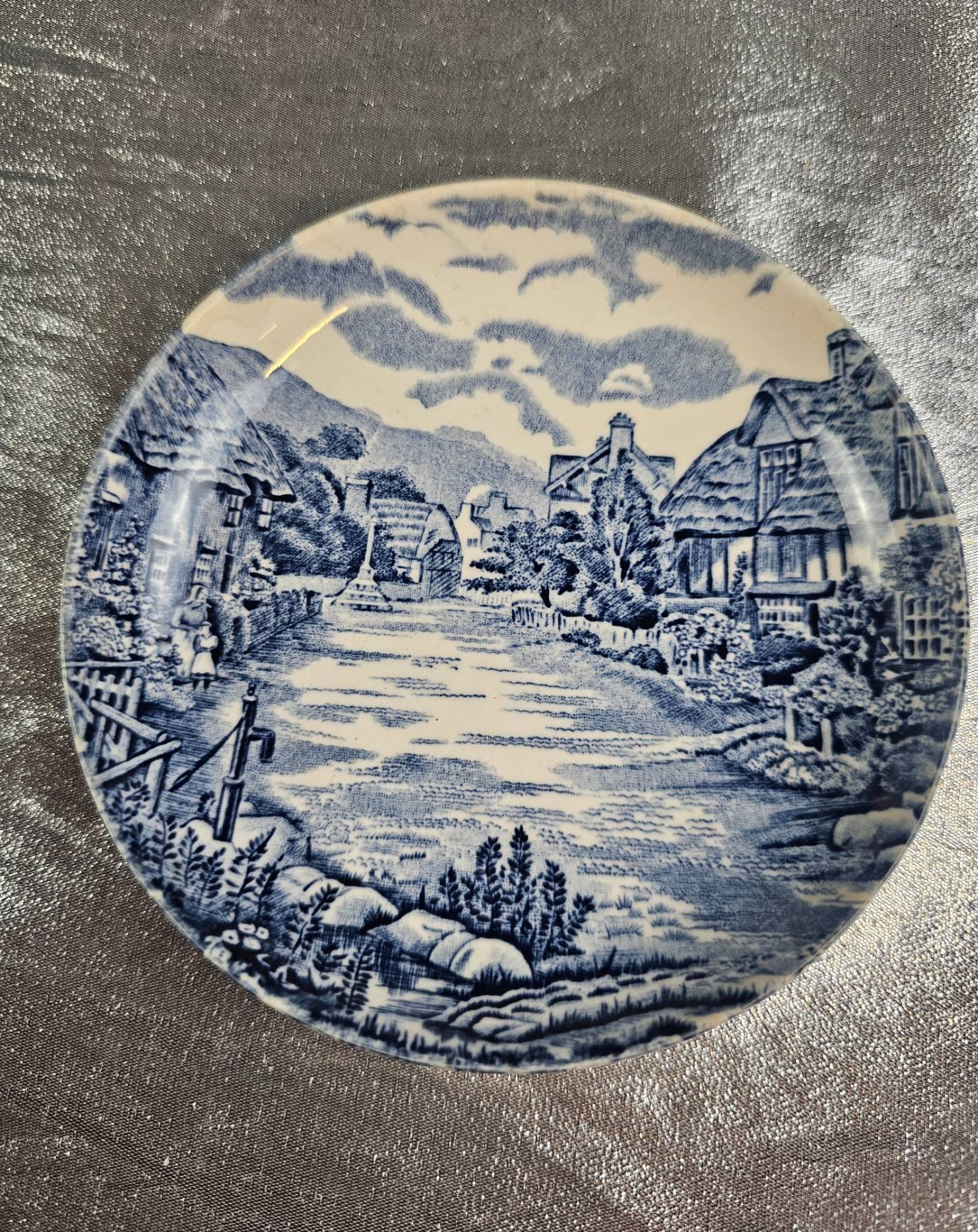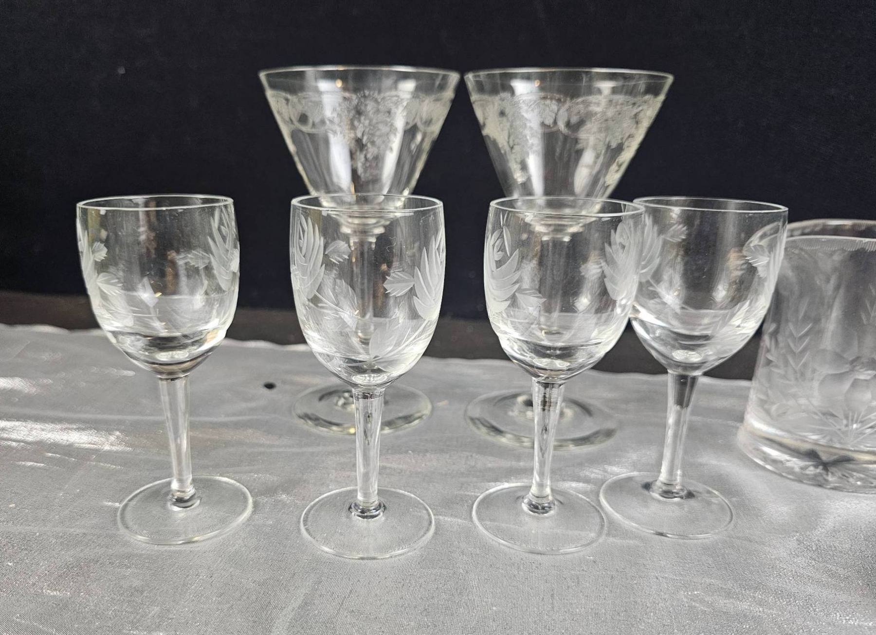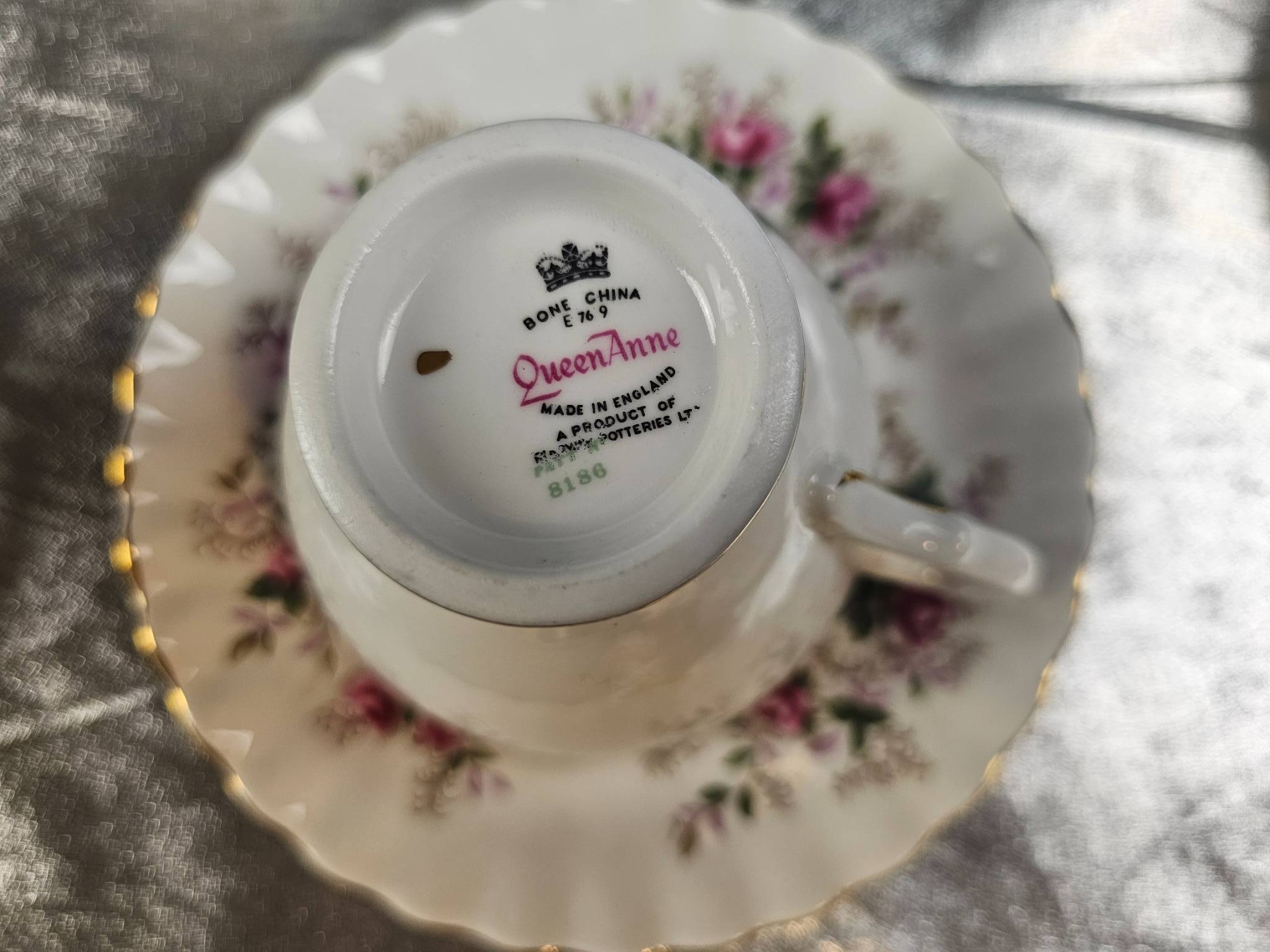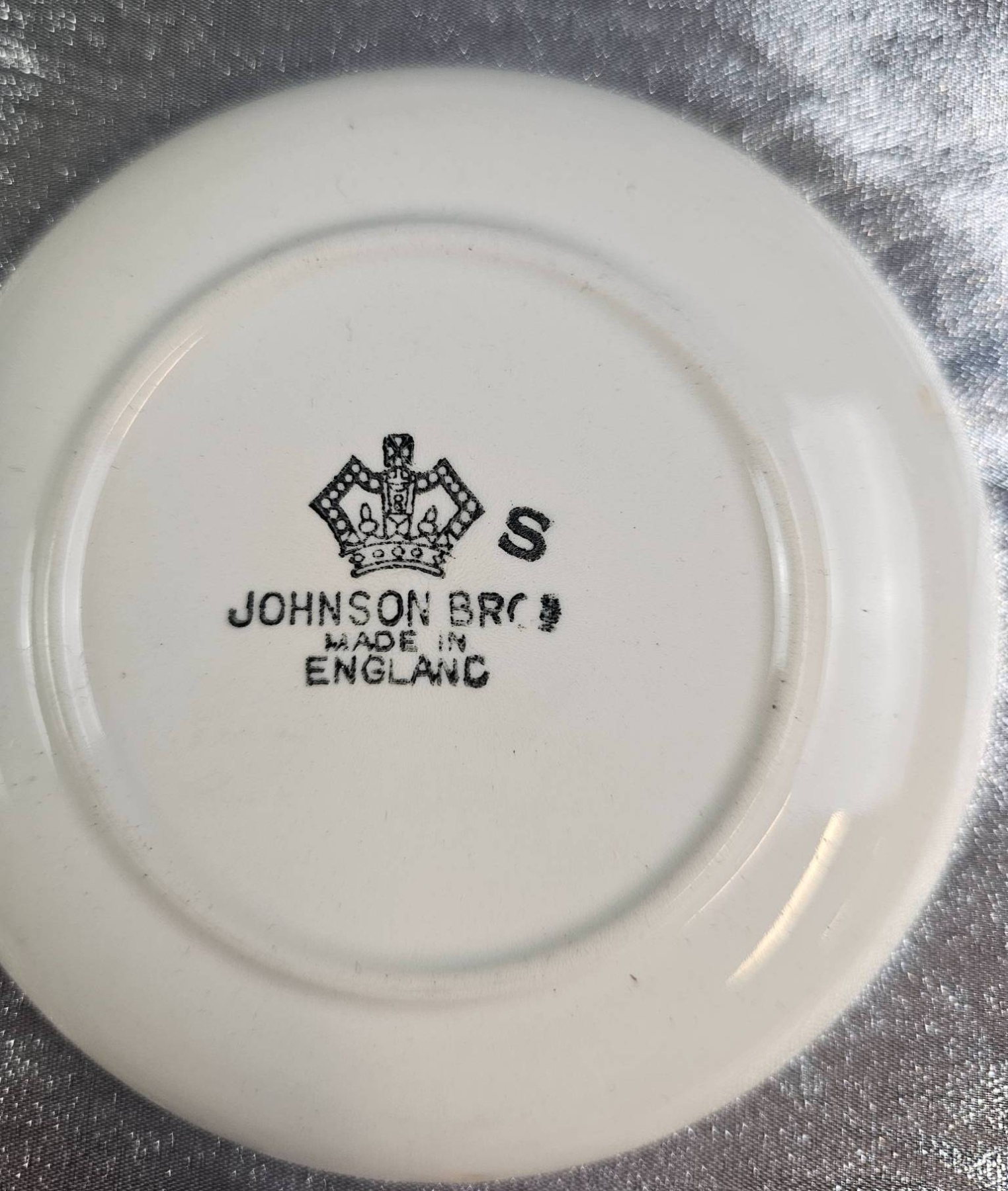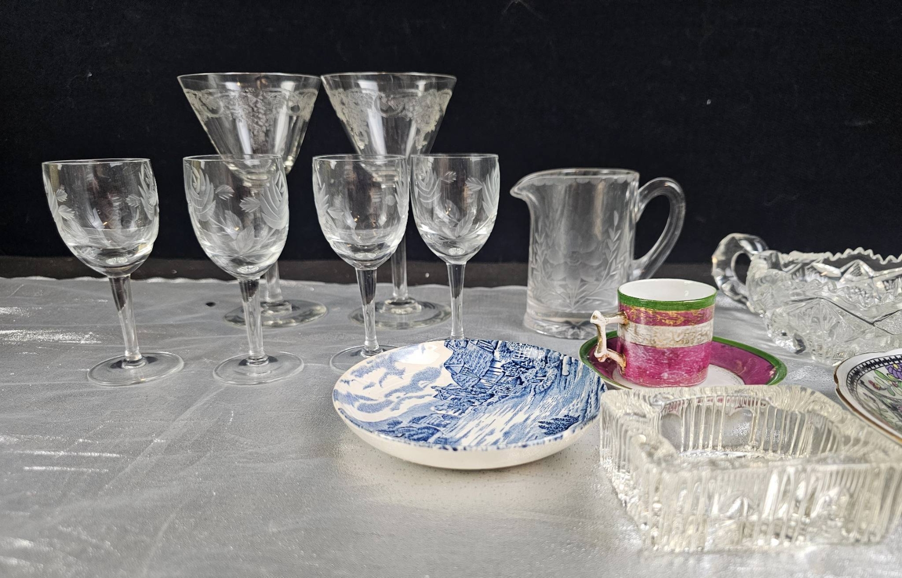 This lot features a diverse selection of teacups, saucers, and collectible glassware. Included are cups and saucers from distinguished brands such as Royal Albert, Collingwood, Queen Anne, and Johnson Brothers, with hallmark stamps verifying authenticity. Additionally, the set includes delicately etched stemmed glasses, a small jug, and a plate showcasing a charming countryside design, marked by Johnson Brothers. Items are in good condition without significant damage, making them ideal for collectors or enthusiasts.