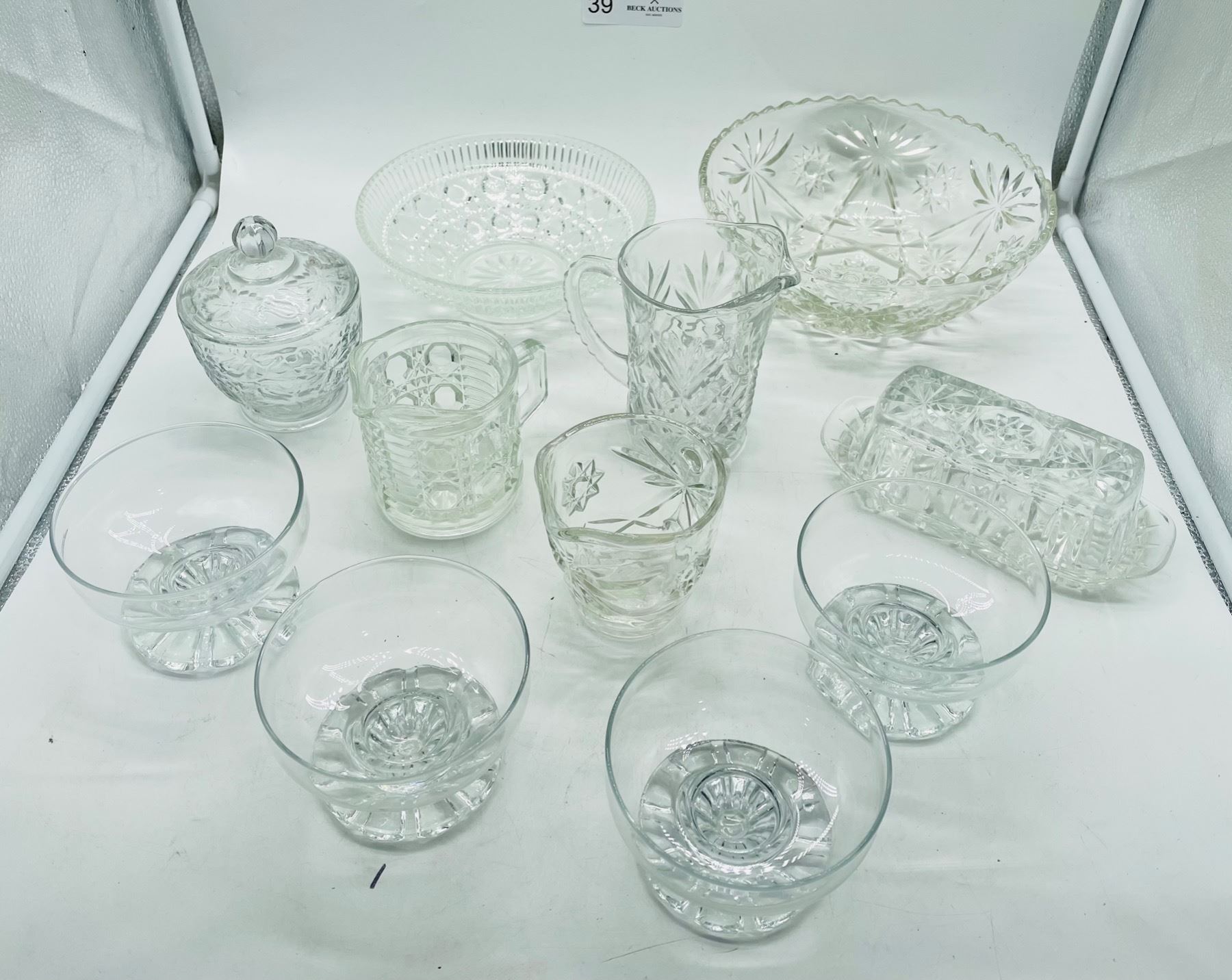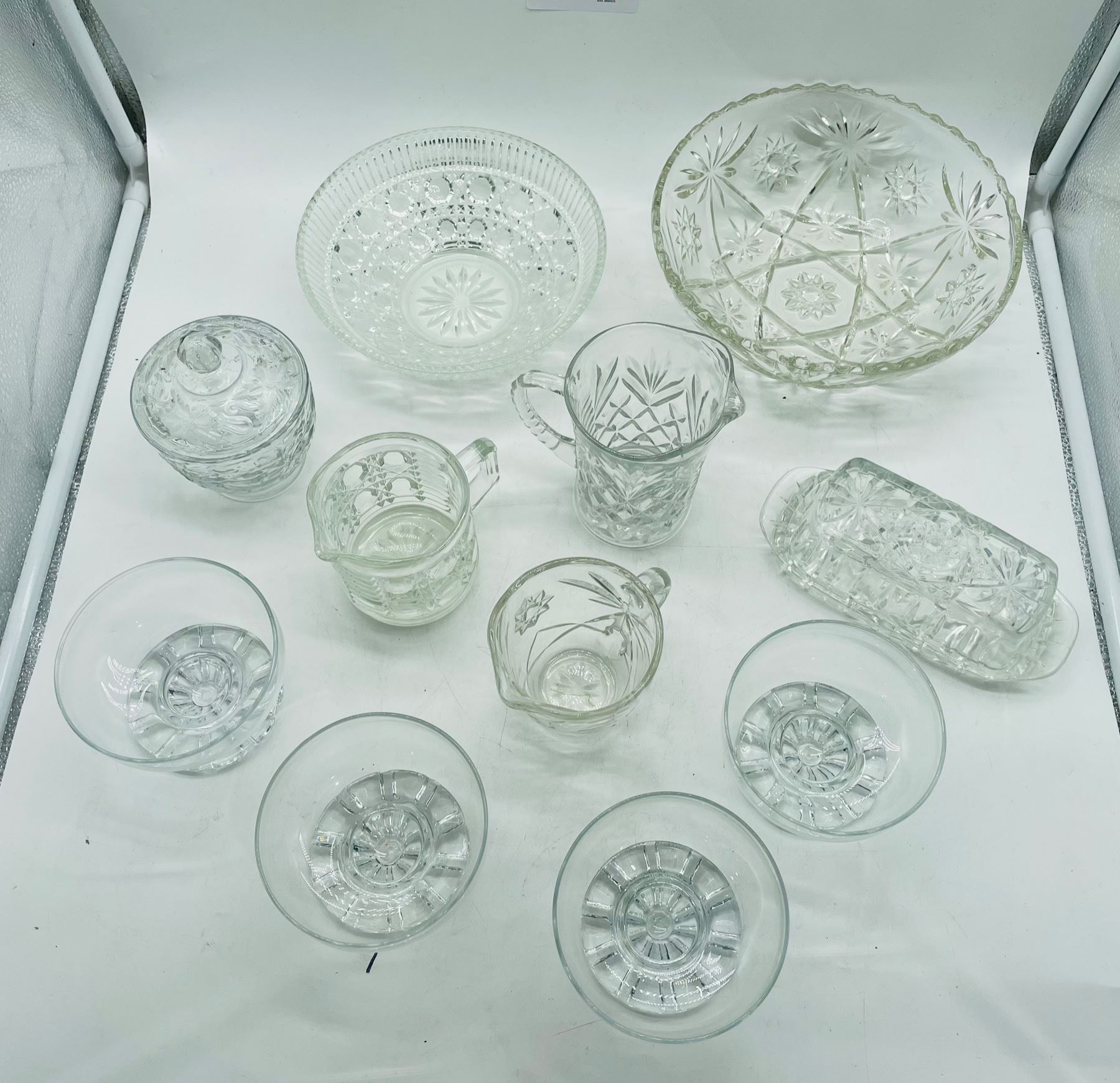 Lot of glassware including 2 x bowls, 4 x dessert bowls, 3 x creamers, 1 x lidded sugar, 1 x lidded butter. all are free of chips or cracks.
