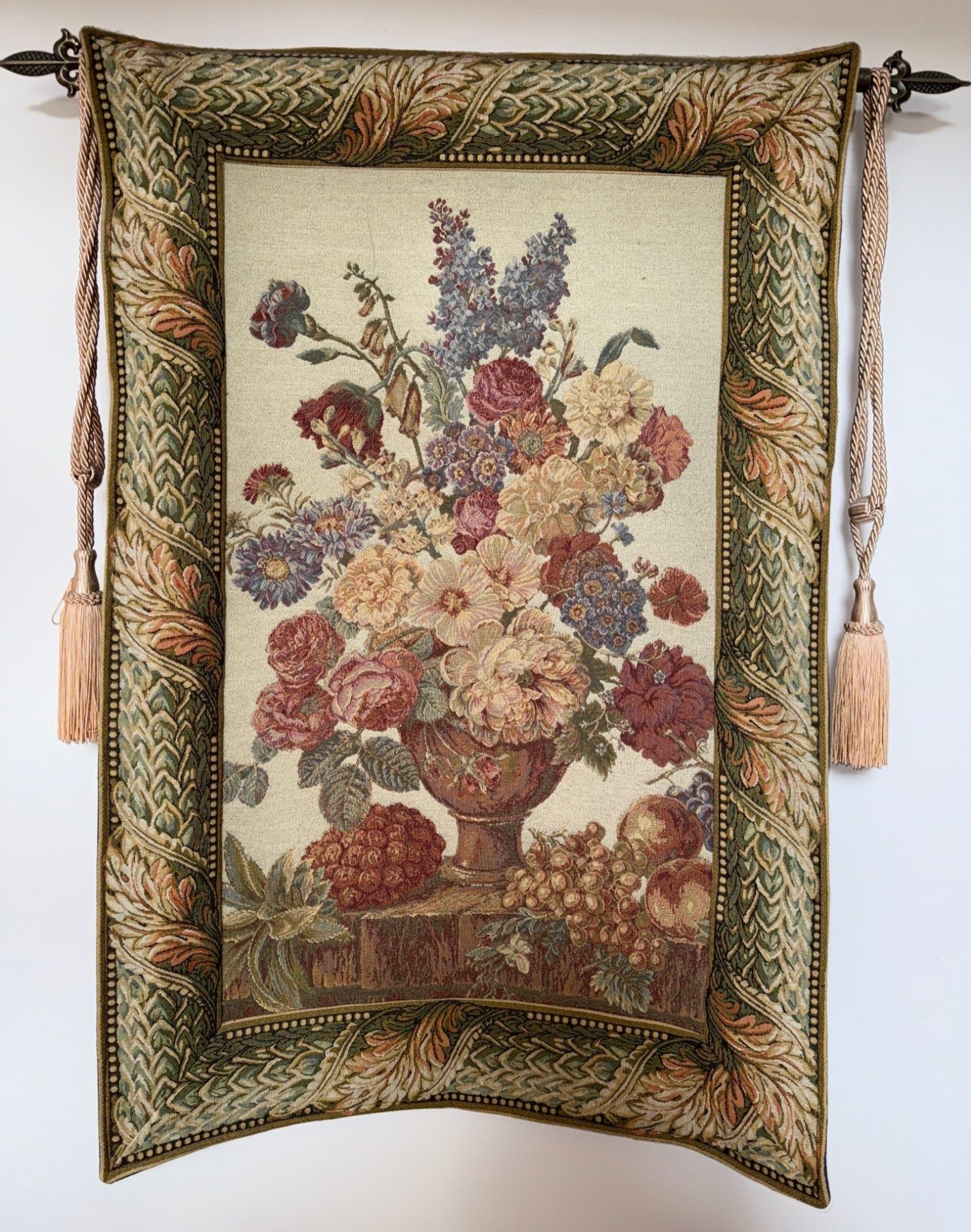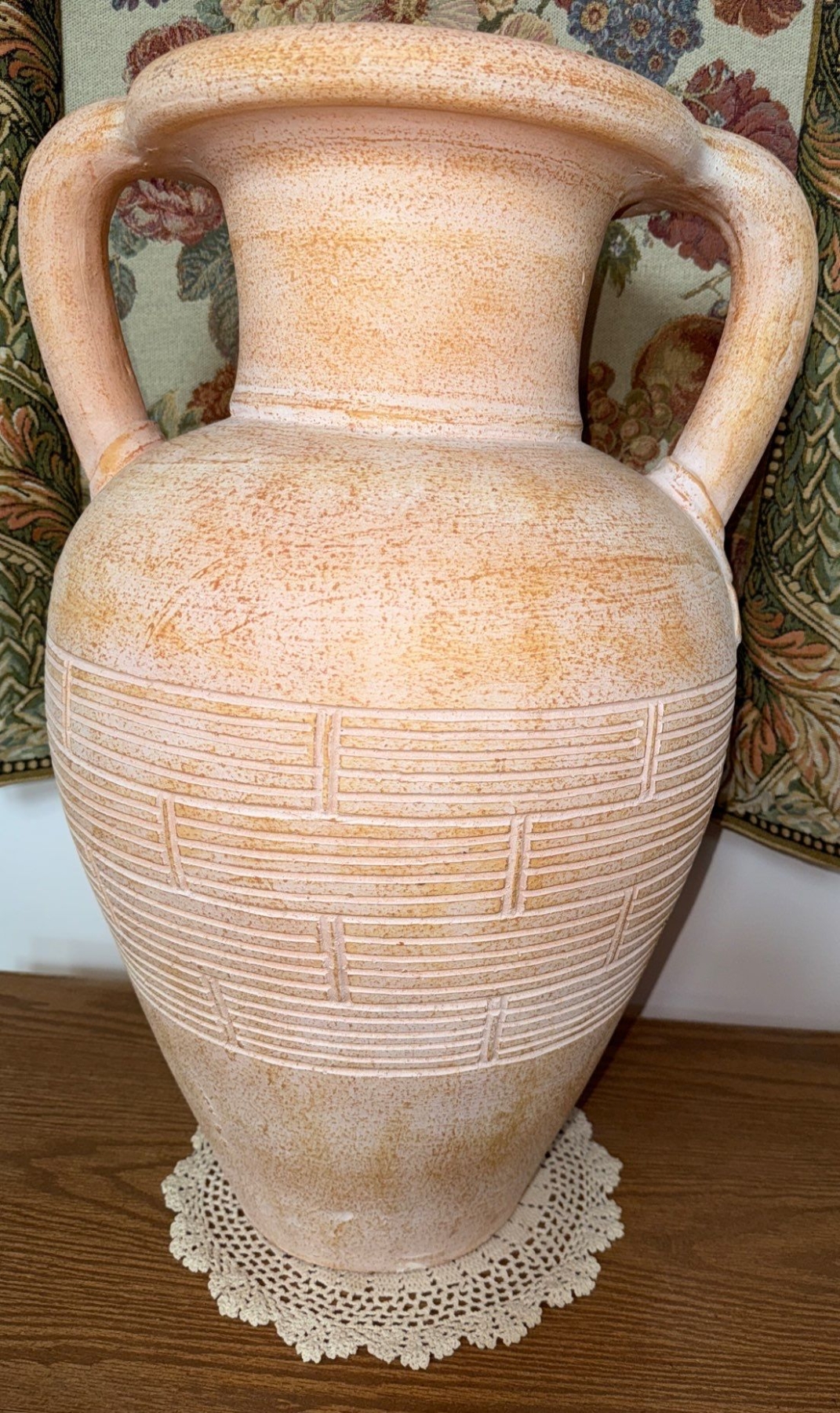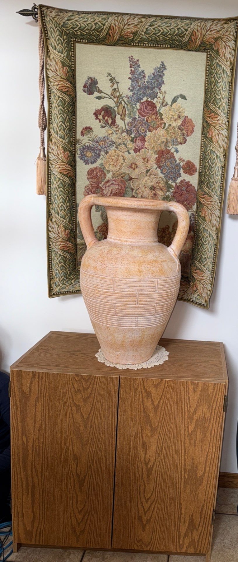 European Style Woven Tapestry w/ Terra Cotta Painted Vase 26T & Veneer Hall Table