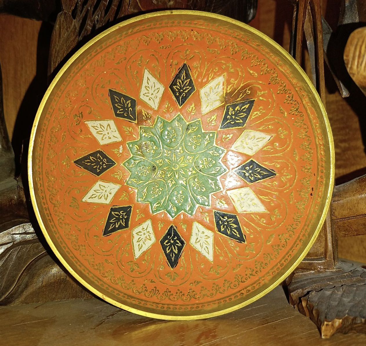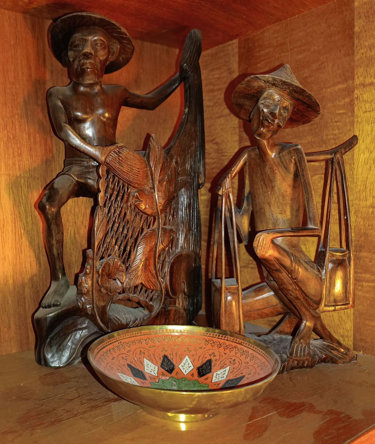 Exquisite Hand Carved Sculpture of Man & Friend w/ Brass Bowl 11"tall