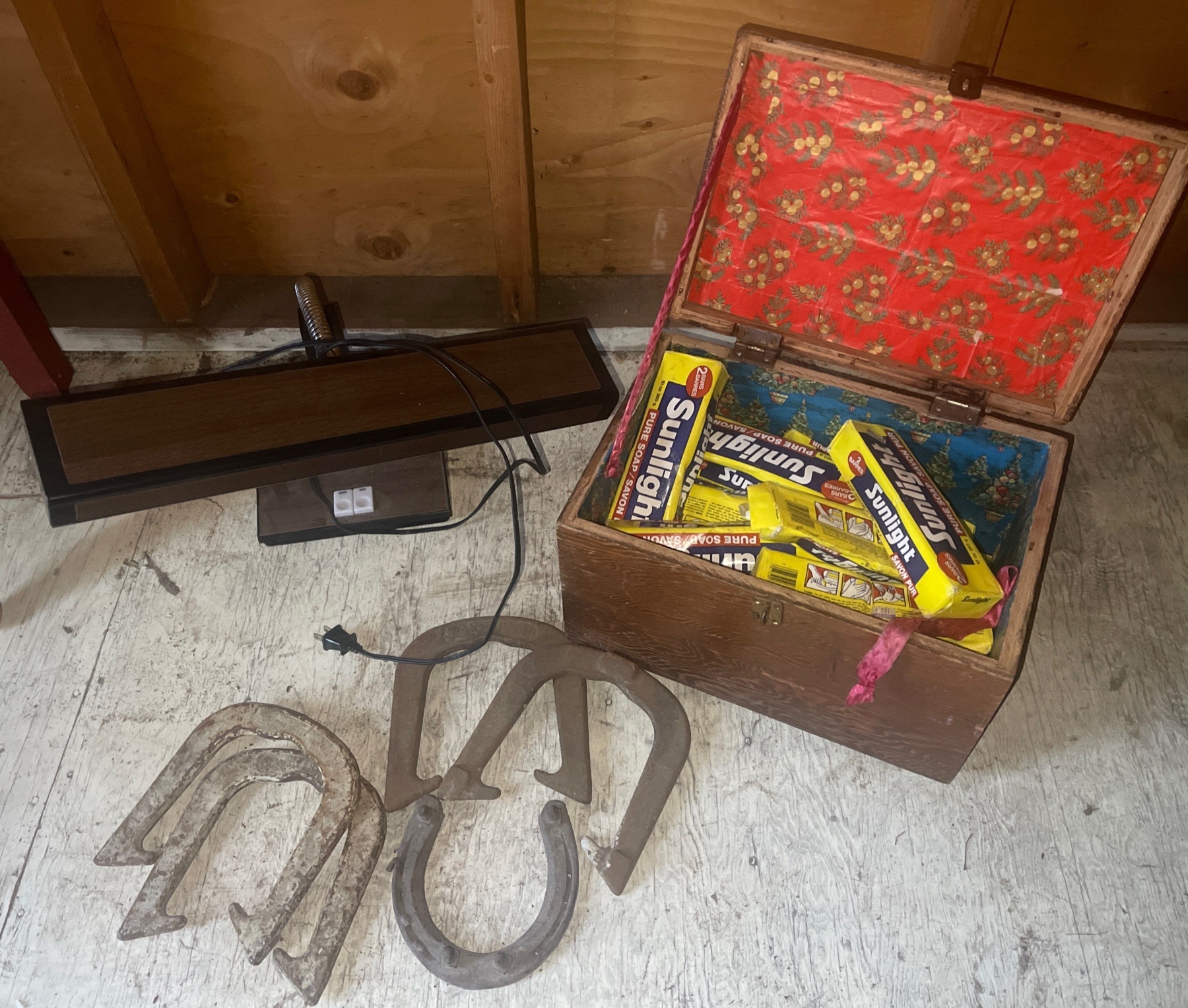 Farm House Necessities - Antique Detergent Assorted Horse Shoes w/ Vintage Lamp