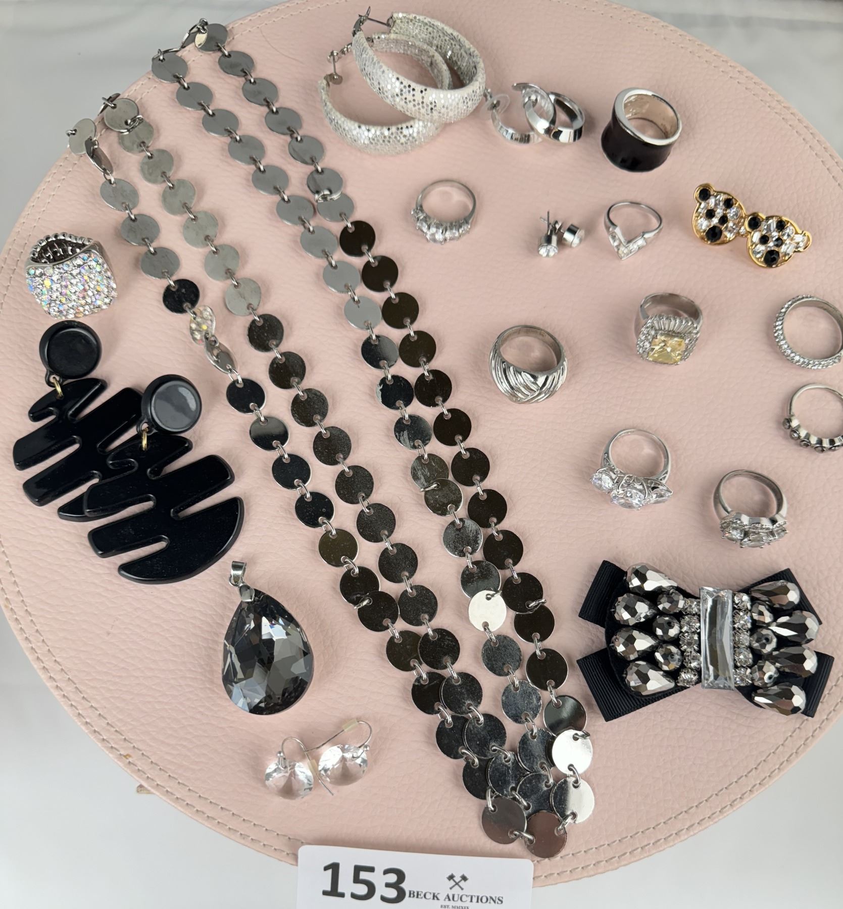 1 Necklace, 1 Crystal Pendant, 10 rings, 6 Pairs of Earrings