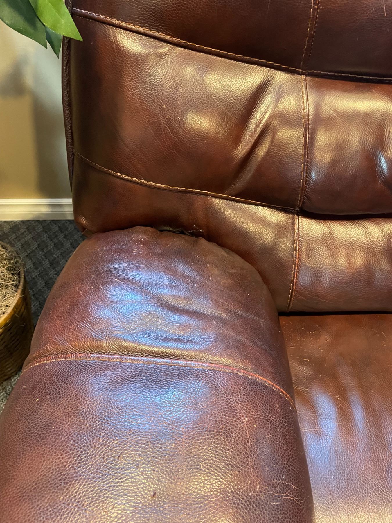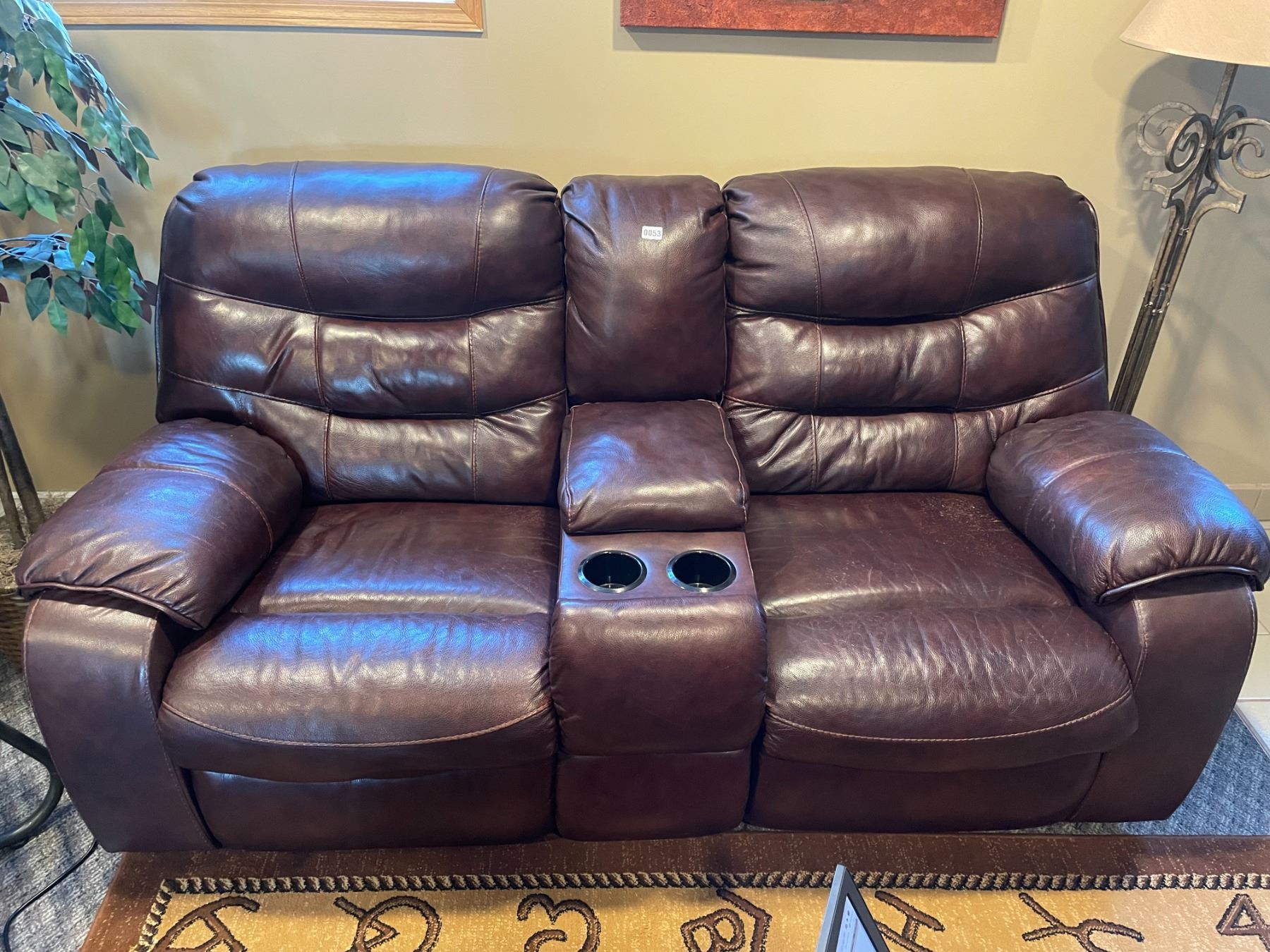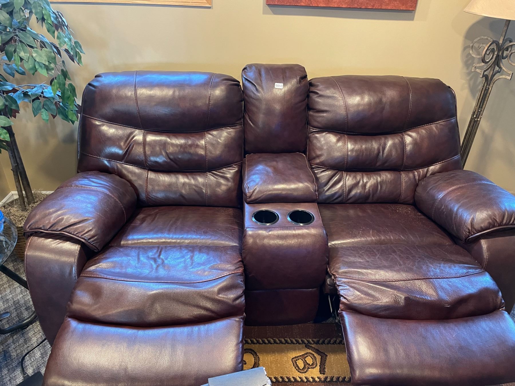 Faux Leather Loveseat Recliner (Brown) with Center Console (some minor damage)