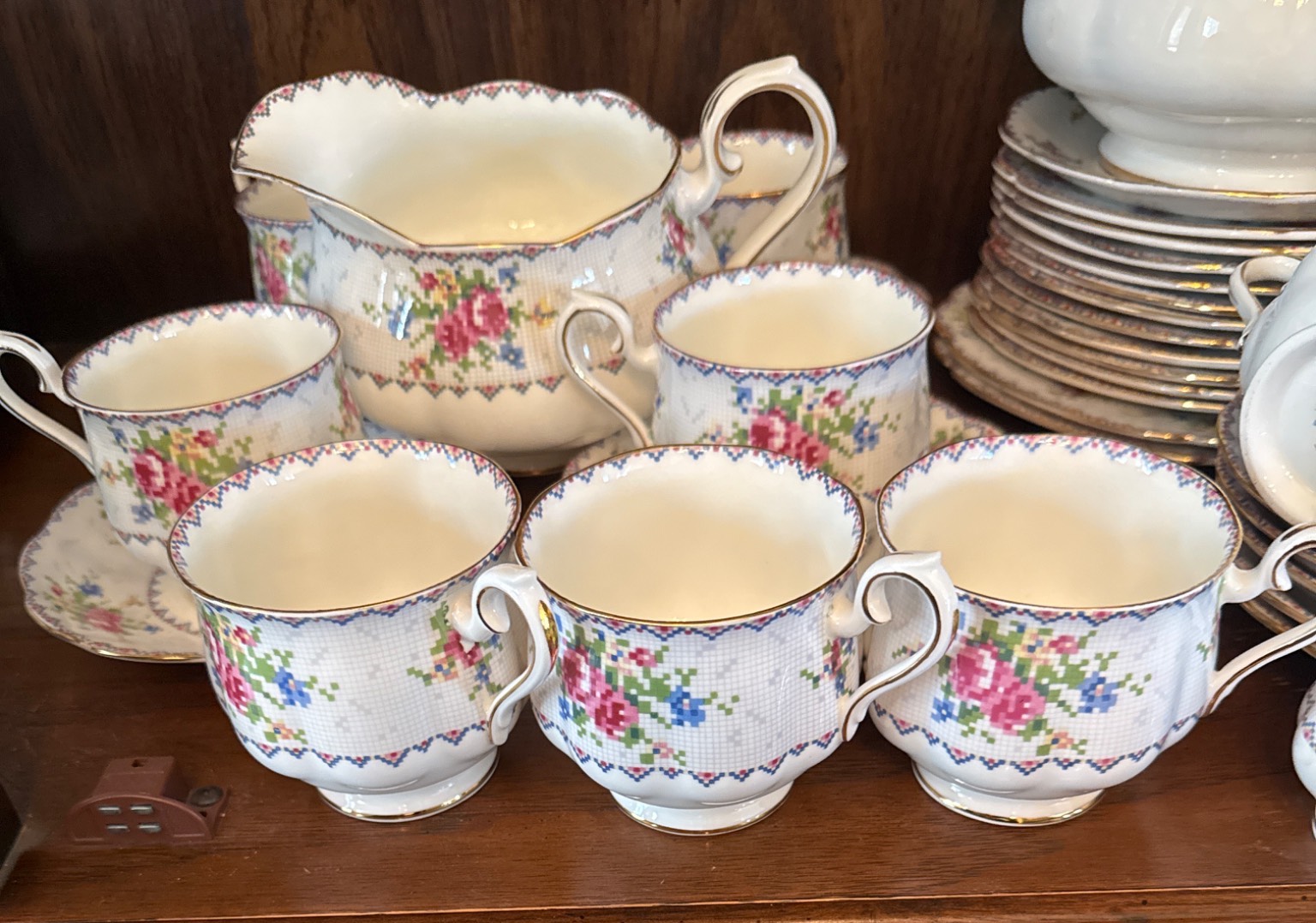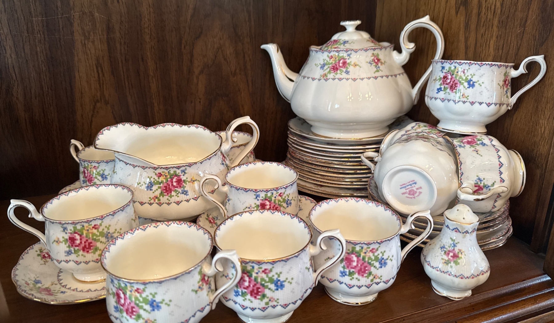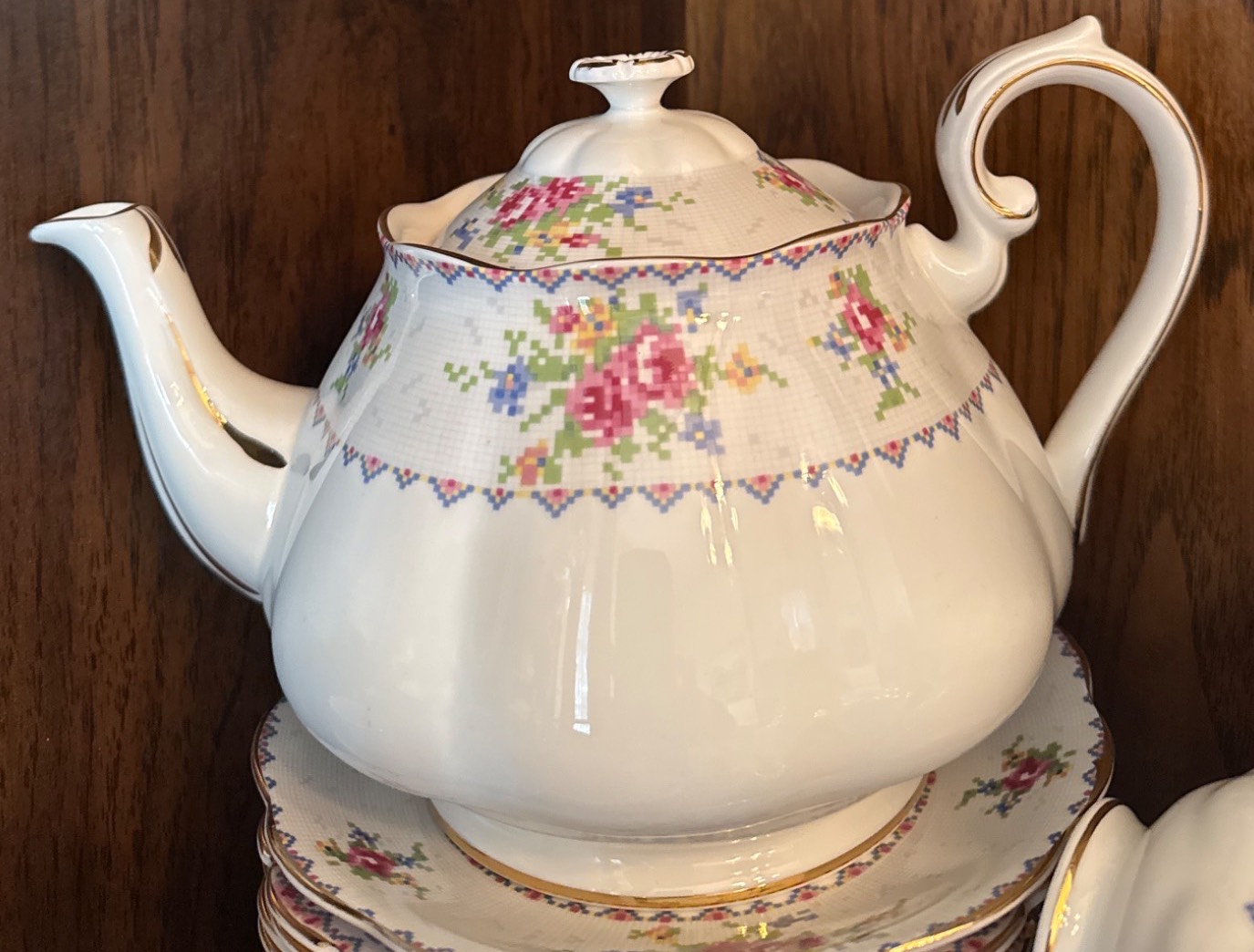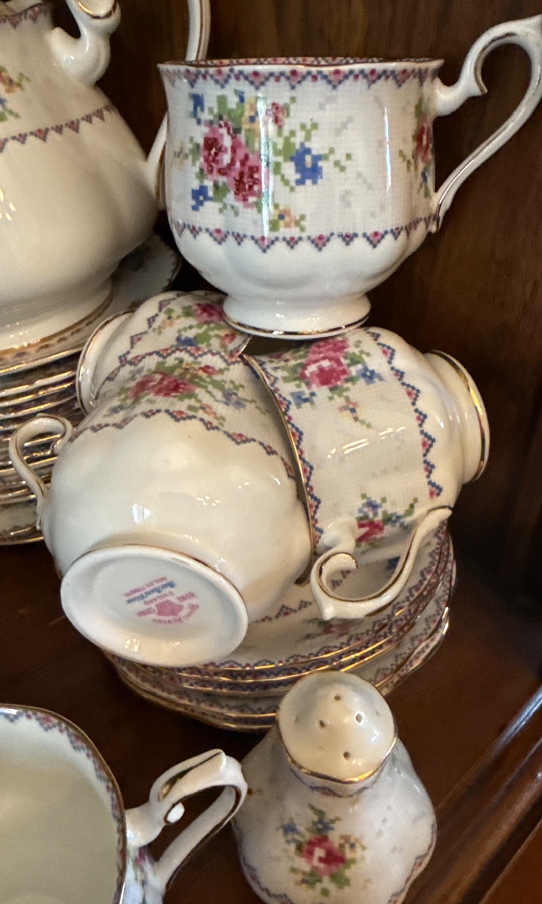 A 28-piece fine bone china tea set featuring an elegant floral design with gilded accents. This set includes a teapot, creamer, sugar bowl, six teacups, six saucers, and six side plates, as well as a salt and pepper shaker set. Each piece showcases intricate floral motifs and scalloped edges. Dimensions include teapot: 6″ tall, teacups: 3″ diameter, and saucers: 6″ diameter. A beautiful addition to any tea service collection.