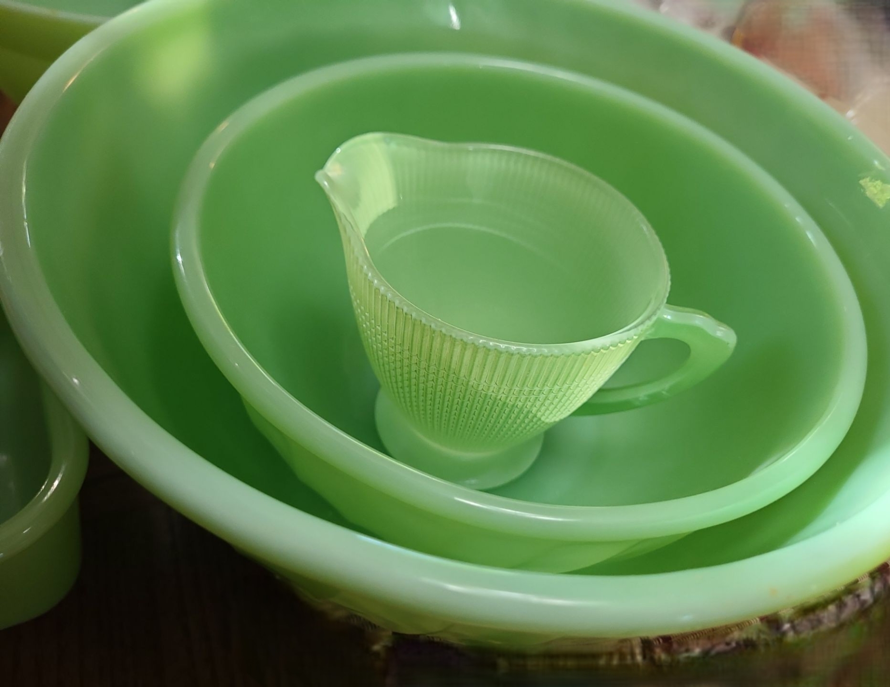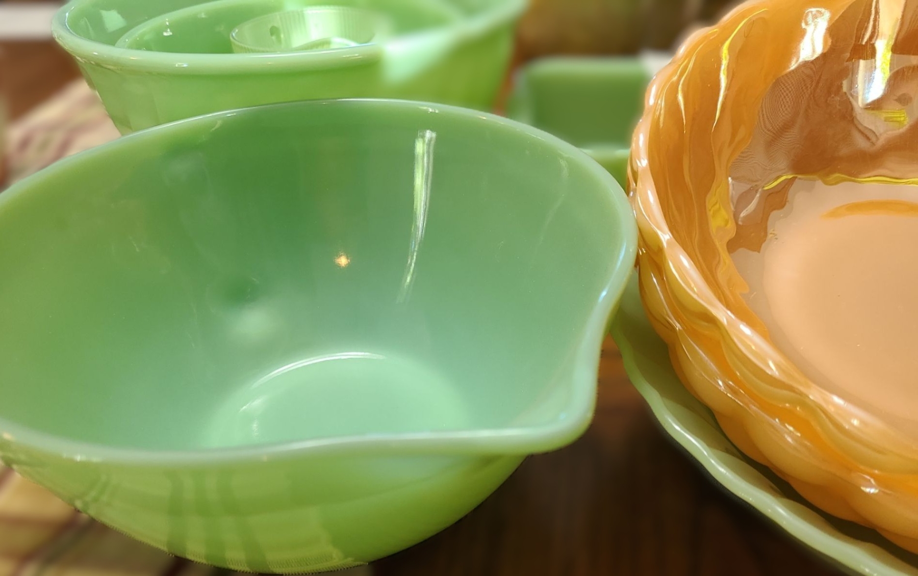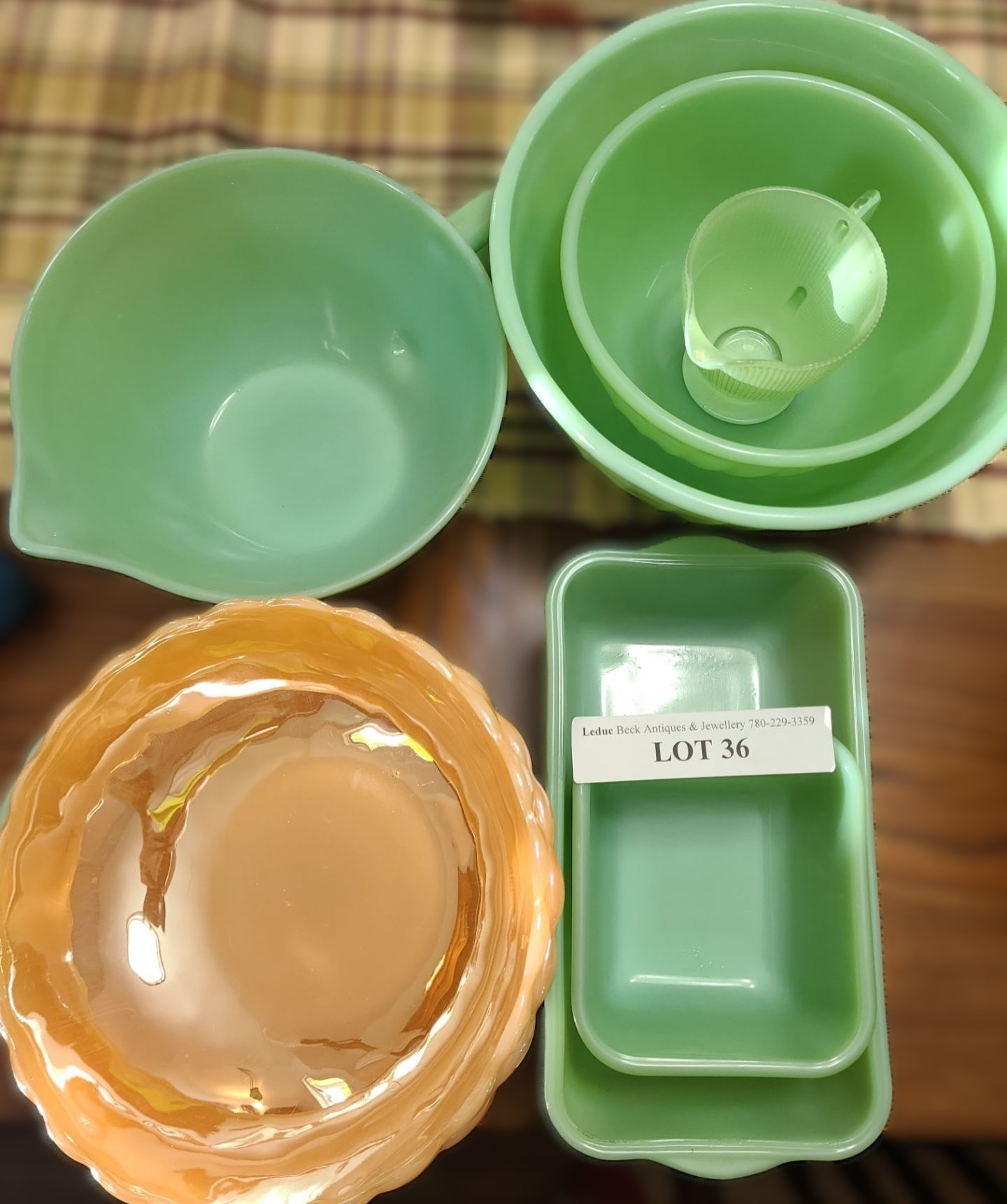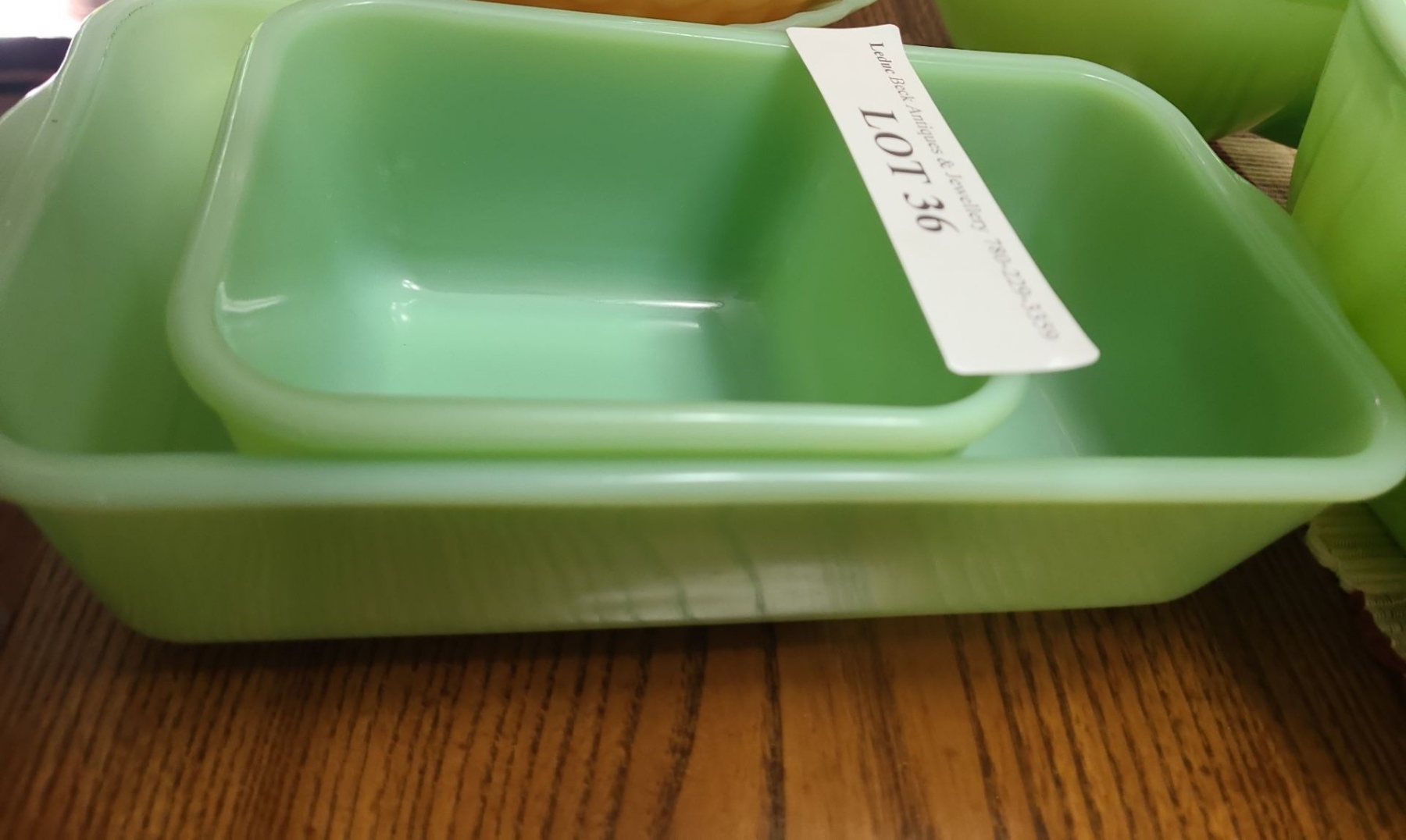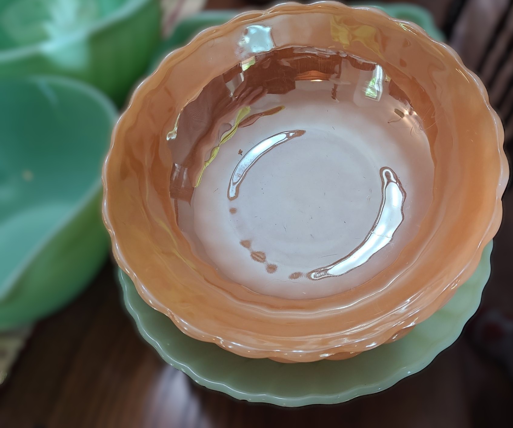 1 chip on Orange Glass bowl & small chips on 1 green scalloped bowl. Small chips on green loaf pan