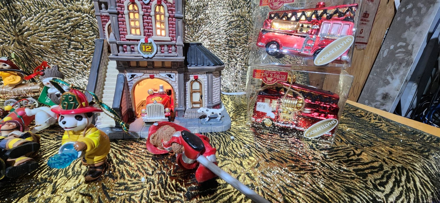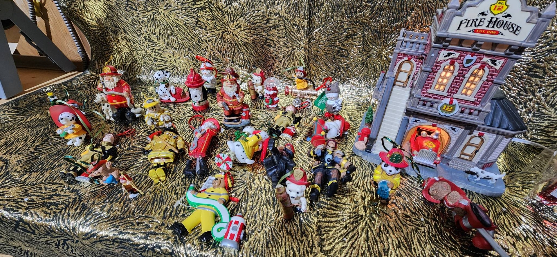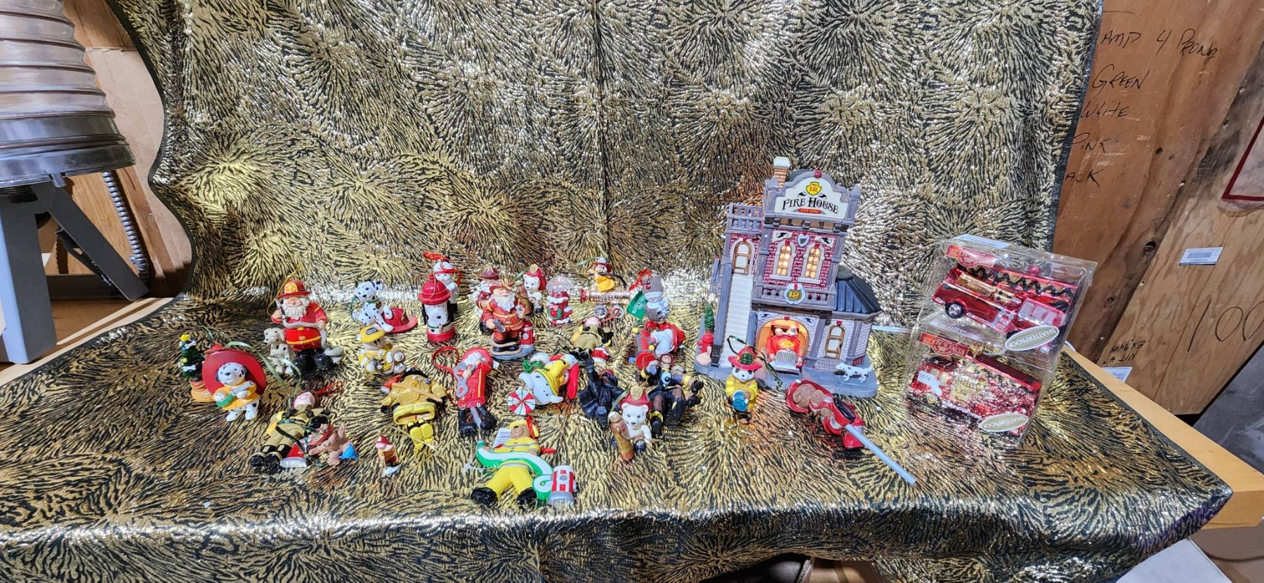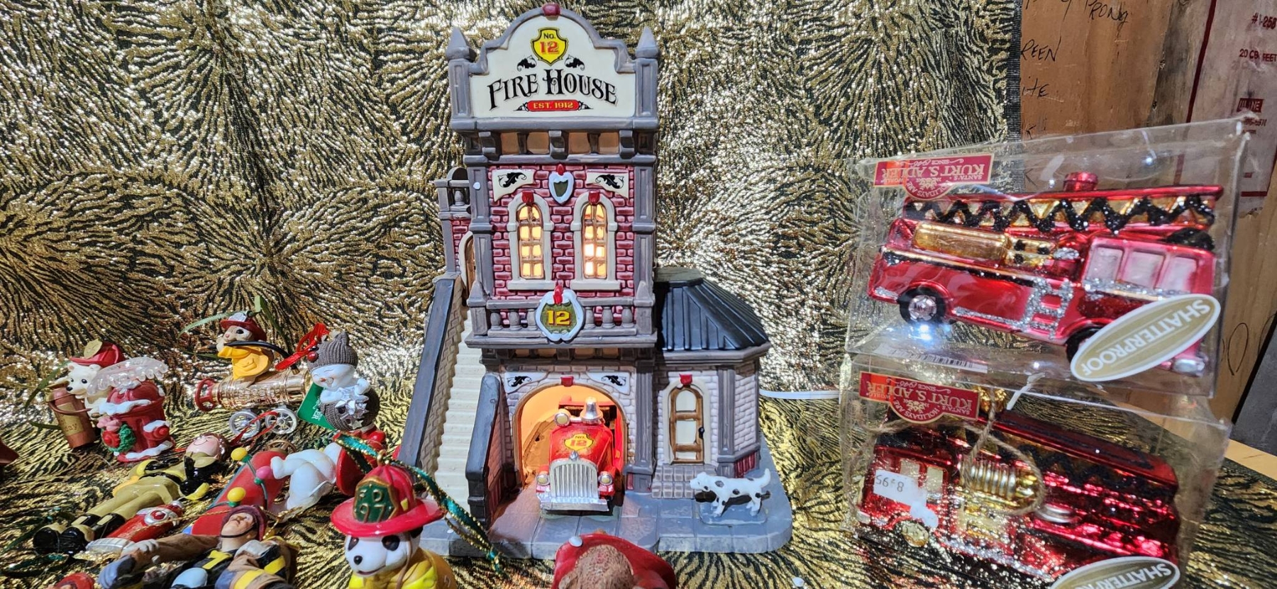 This engaging set features a detailed fire station light-up display measuring approximately 10 inches tall, 7 inches wide, and 7 inches deep. | | | Accompanied by an assortment of firehouse-themed figurines and decorations, including playful firefighter animals, Dalmatian figures, and fire trucks. | Produced by Lemax in 2014, the illuminated fire station is plug-in powered for a glowing, nostalgic charm. | The set offers countless pieces to bring warmth and character to any display.