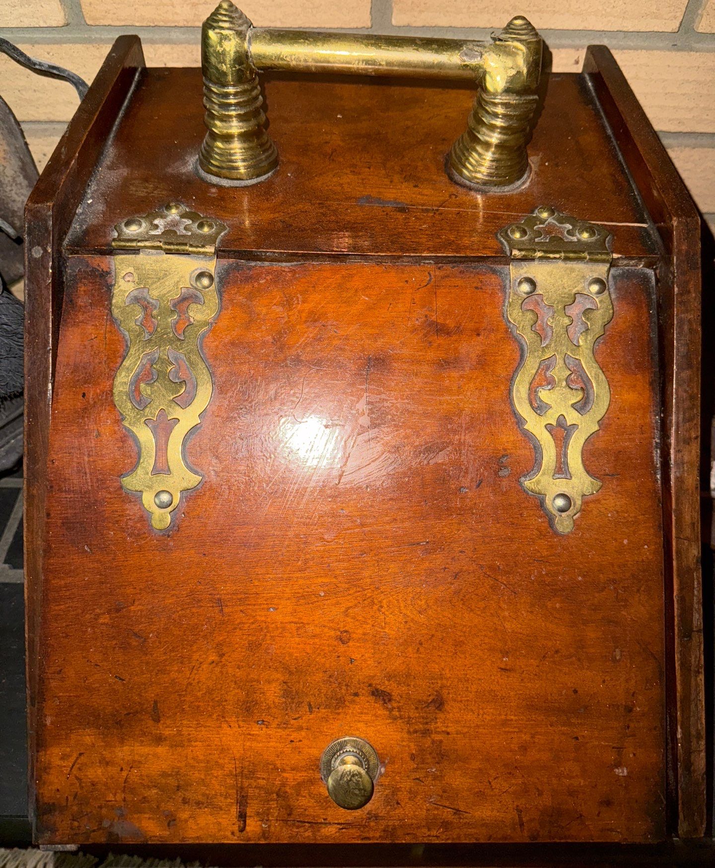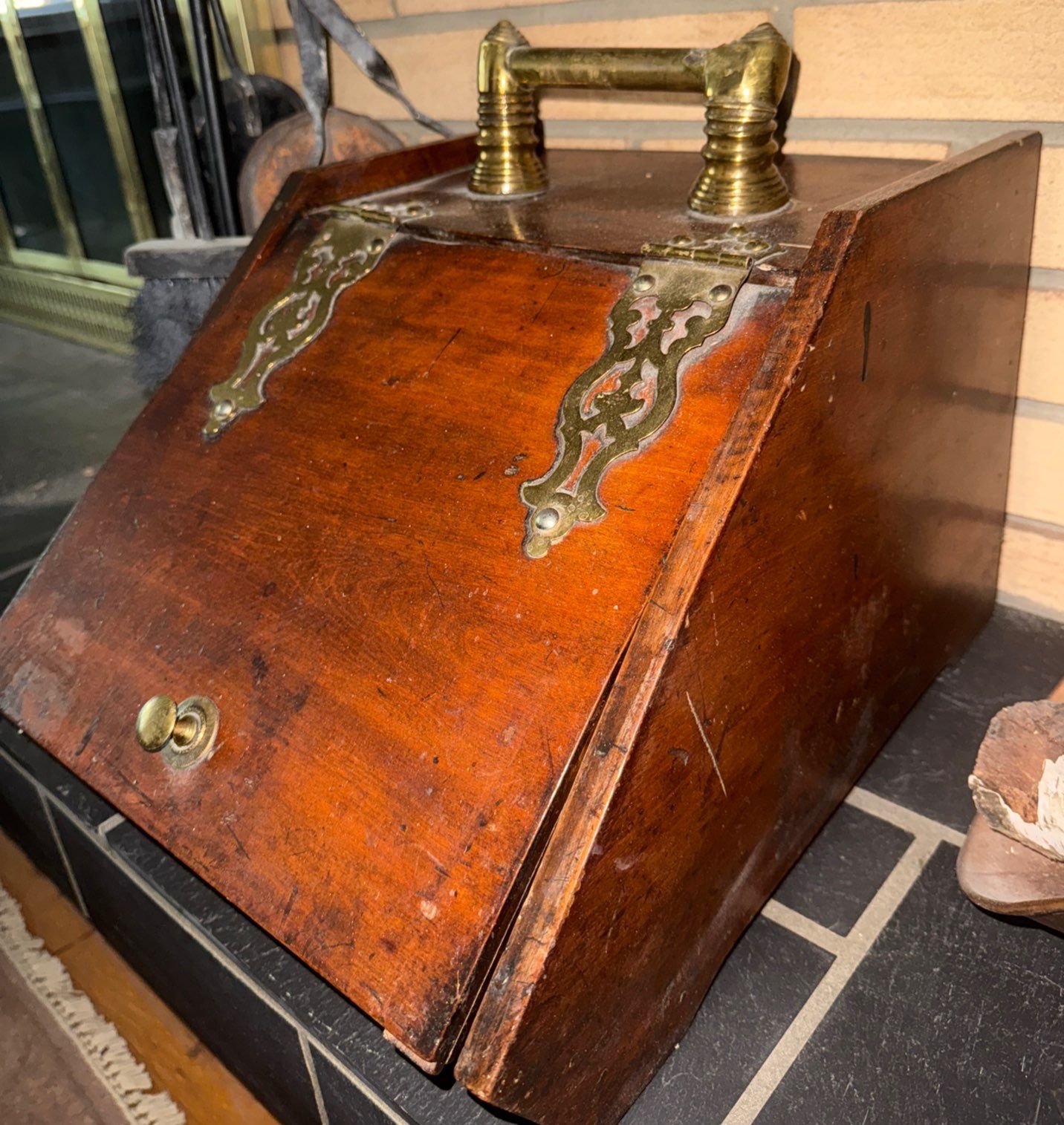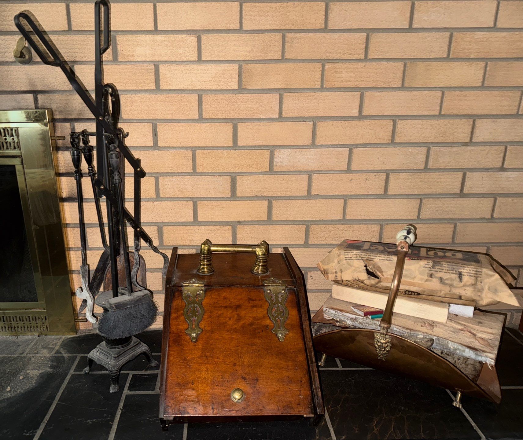 Fire Tending Tools, Brass Log Keep, & Antique Coal Scuttle