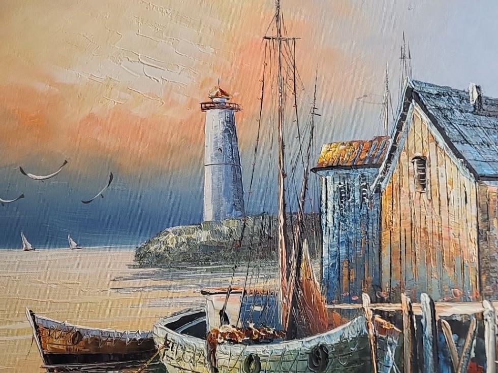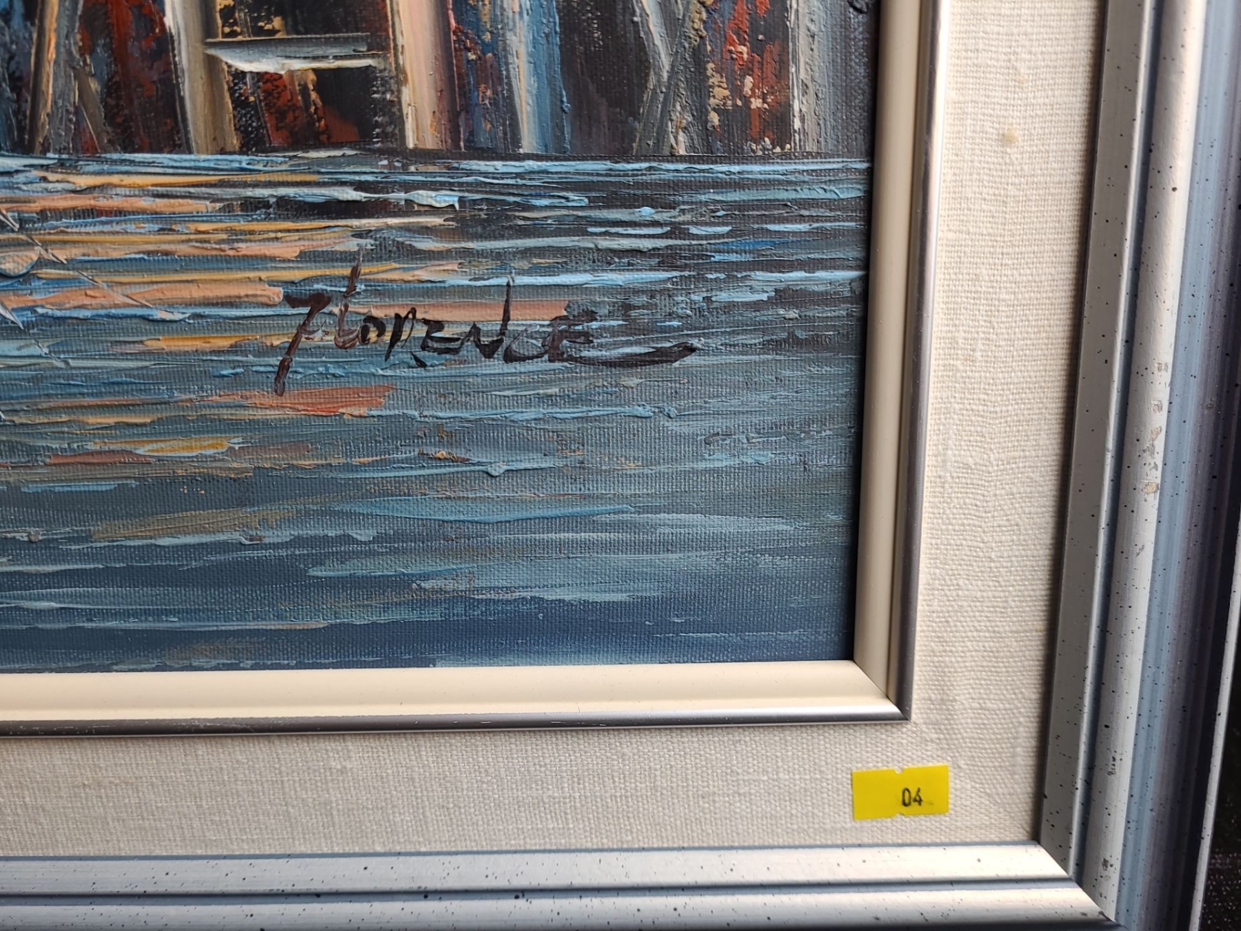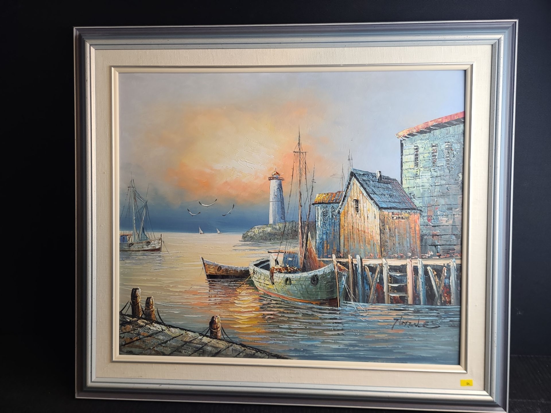 Fishing Village w/ Lighthouse Painting, Signed: Florence, Framed, 31.5 X 28