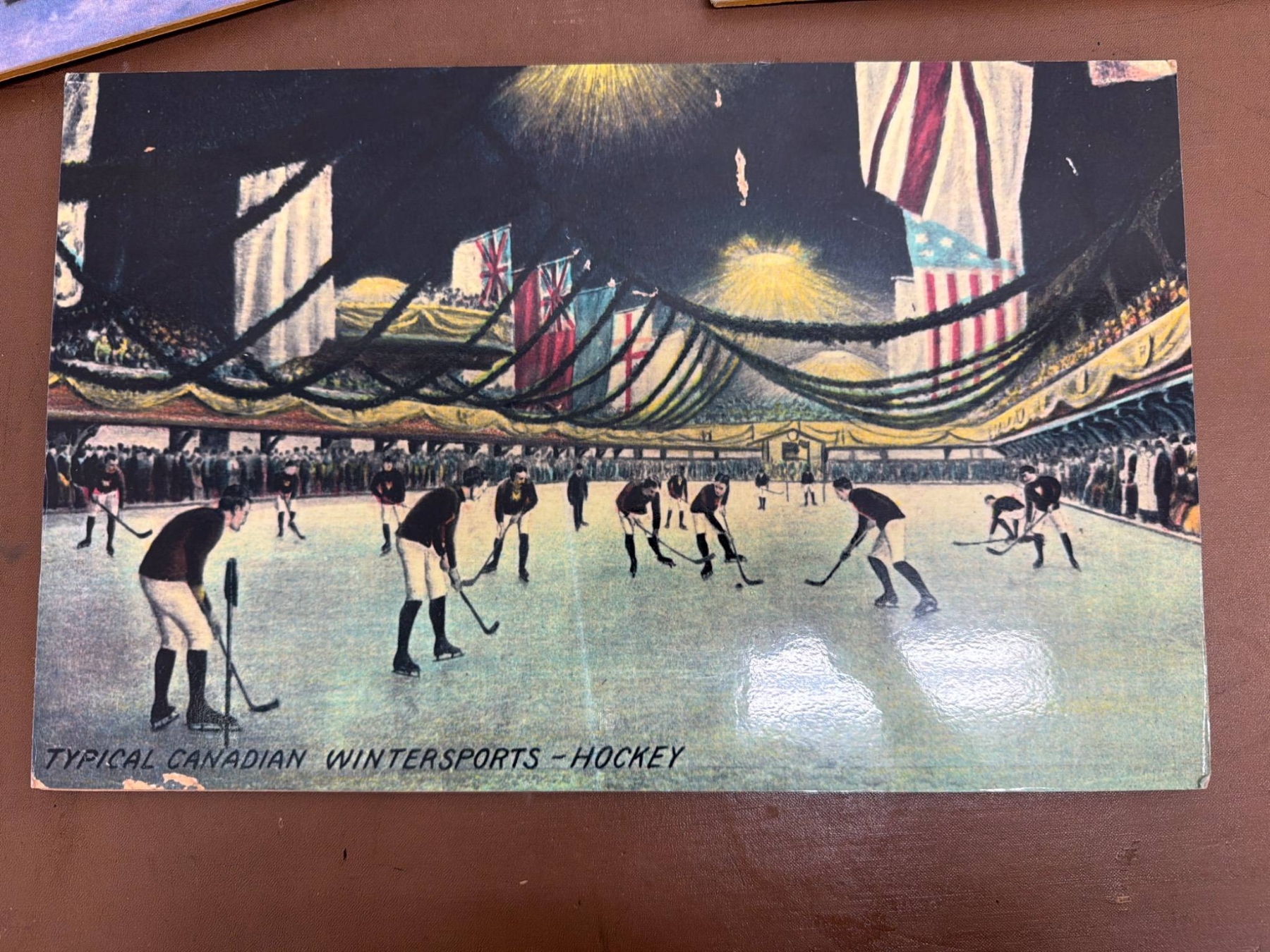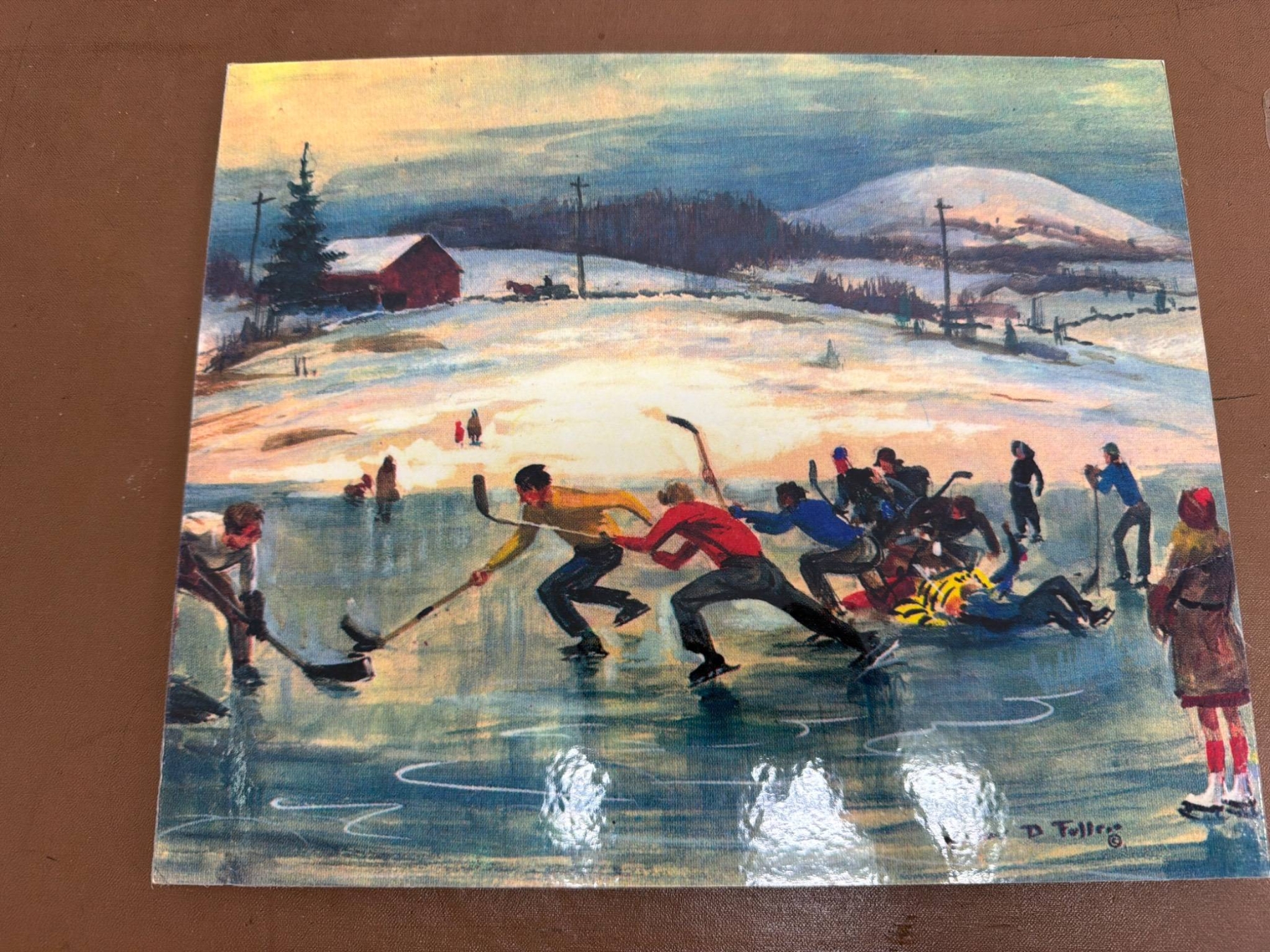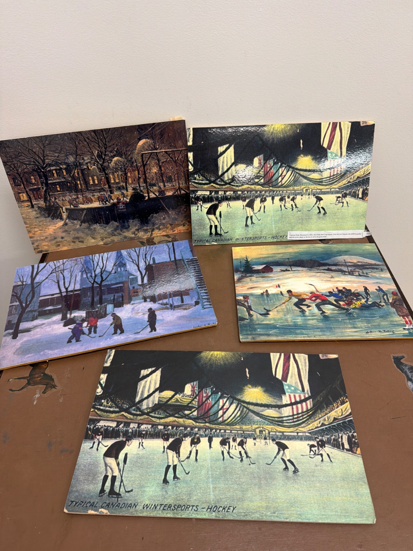 Five art prints depicting Canadian winter sports and scenes. Each print showcases a unique portrayal of winter activities, including hockey and snowy landscapes. The prints are vibrant with subtle vintage appeal and details such as titles like 'Typical Canadian Wintersports - Hockey' noted. Some prints have writing on the back like 'Victoria Rink 1892' or artist initials. Condition varies, with minor indications of handling or storage.