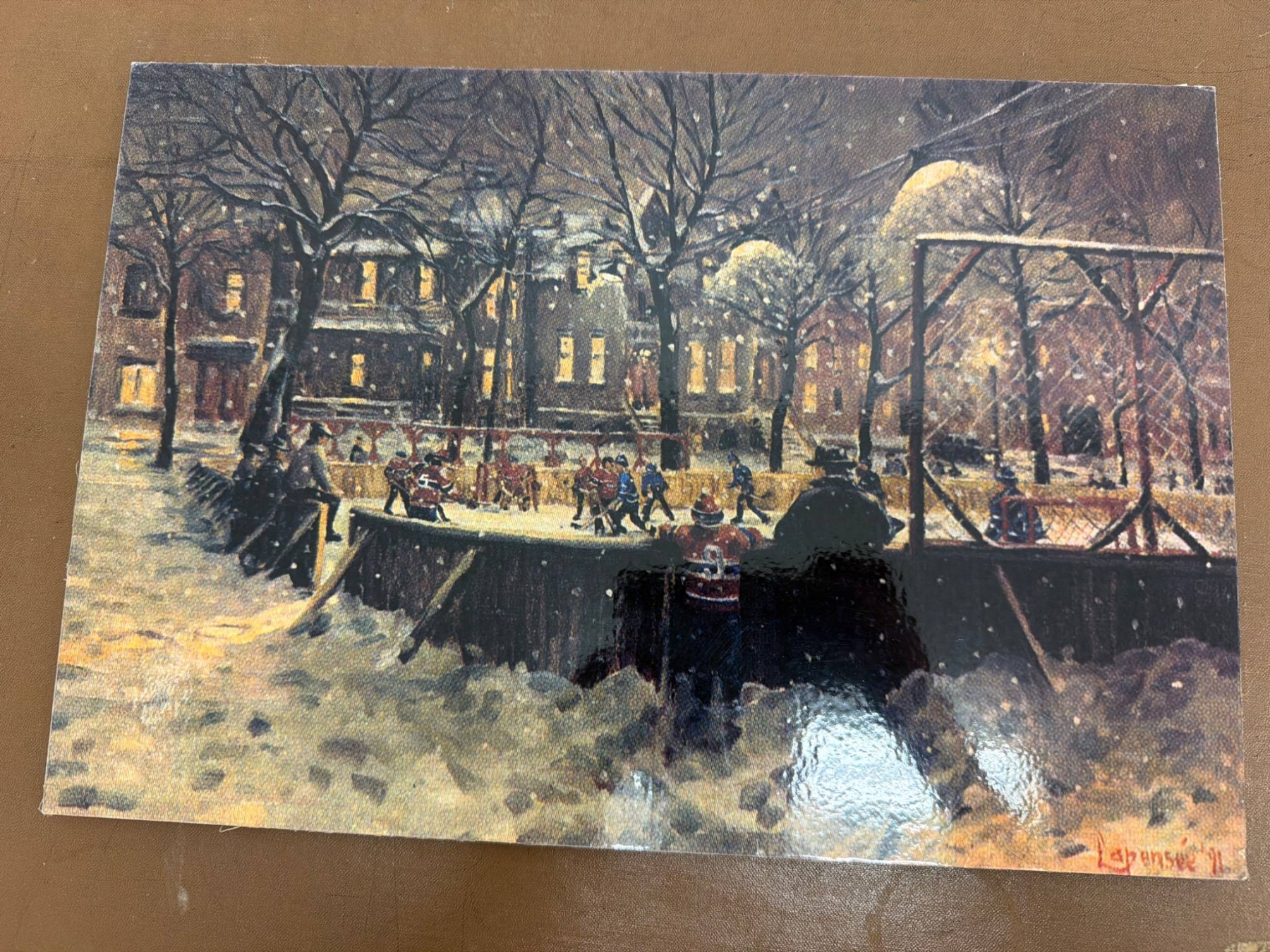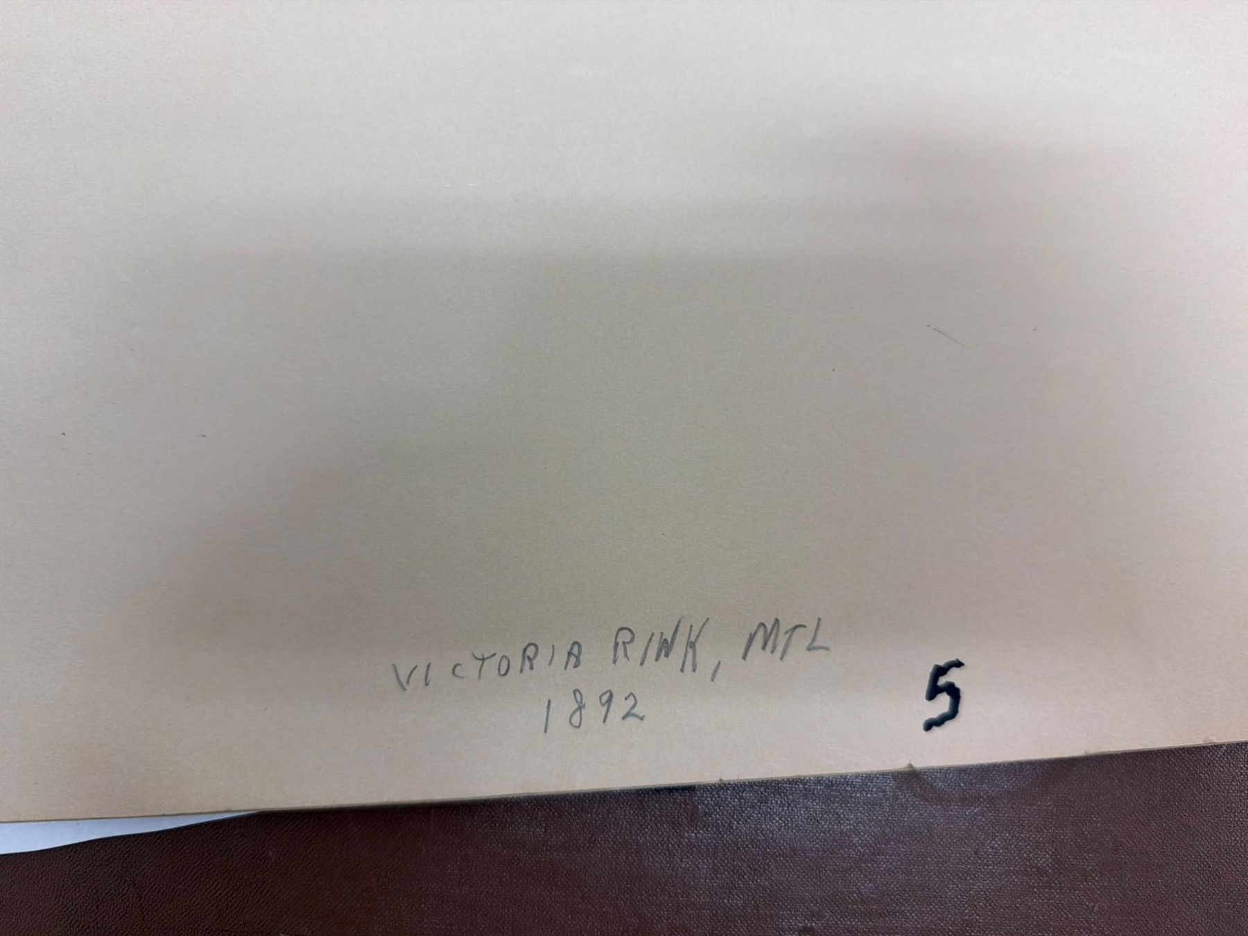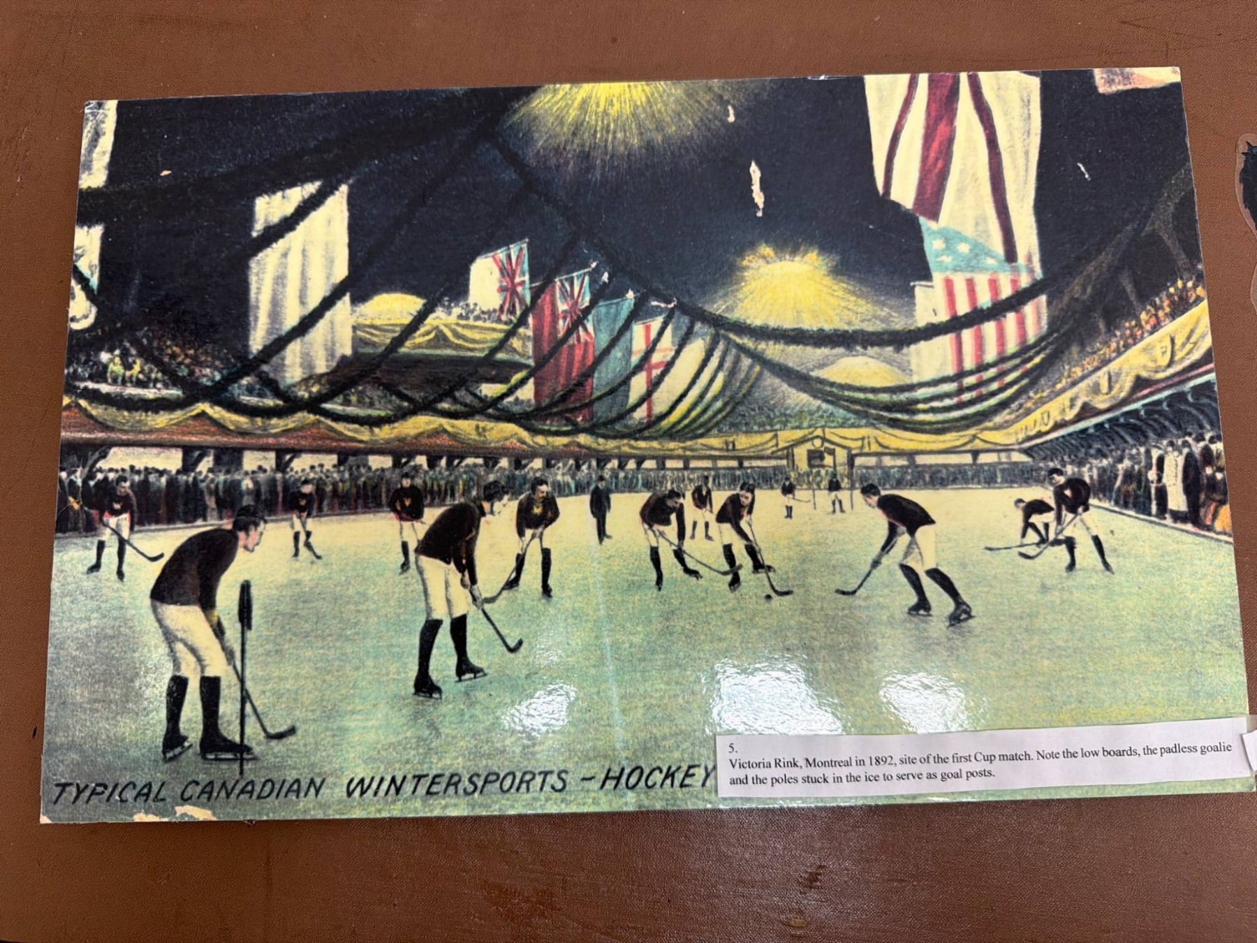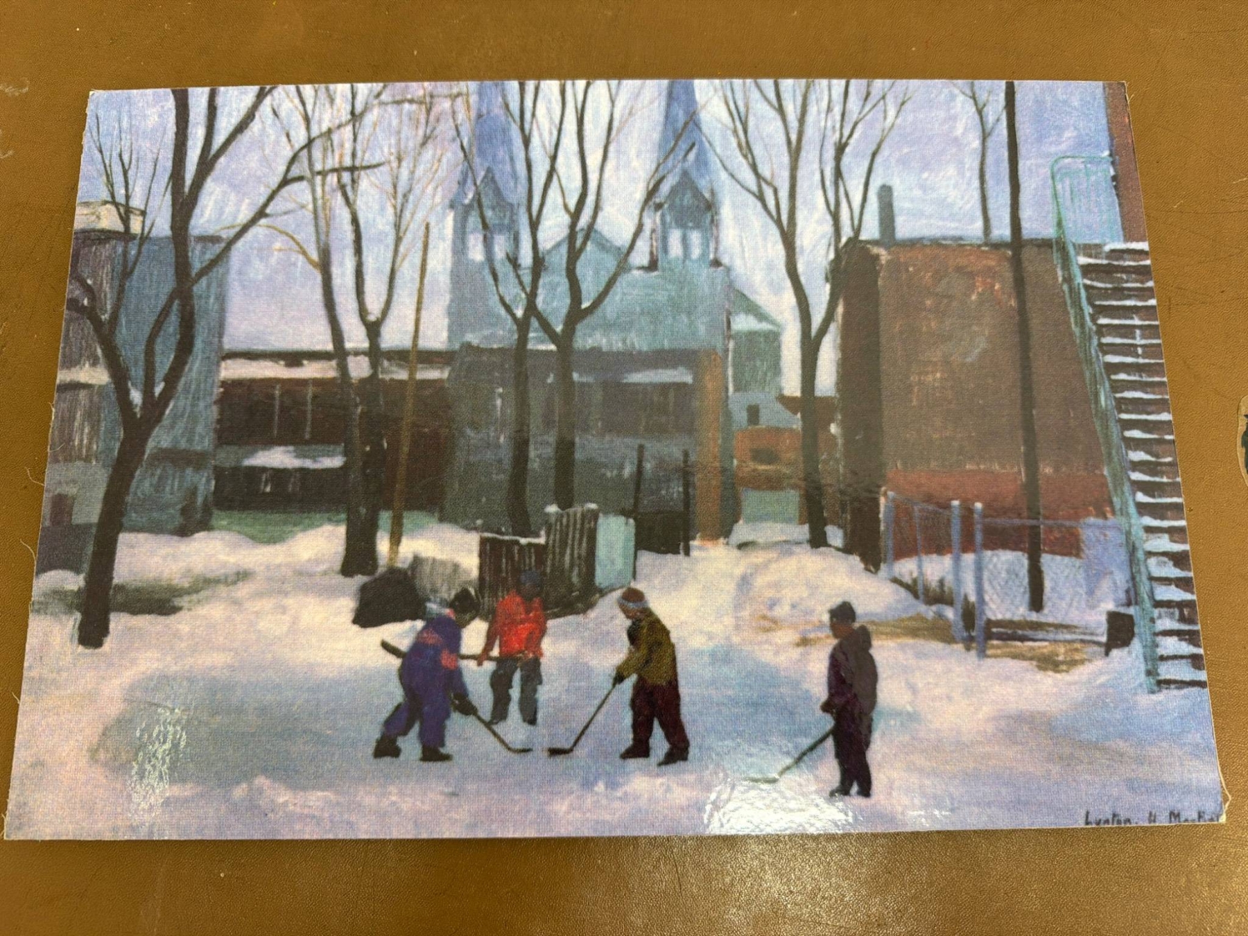 Five art prints depicting Canadian winter sports and scenes. Each print showcases a unique portrayal of winter activities, including hockey and snowy landscapes. The prints are vibrant with subtle vintage appeal and details such as titles like 'Typical Canadian Wintersports - Hockey' noted. Some prints have writing on the back like 'Victoria Rink 1892' or artist initials. Condition varies, with minor indications of handling or storage.