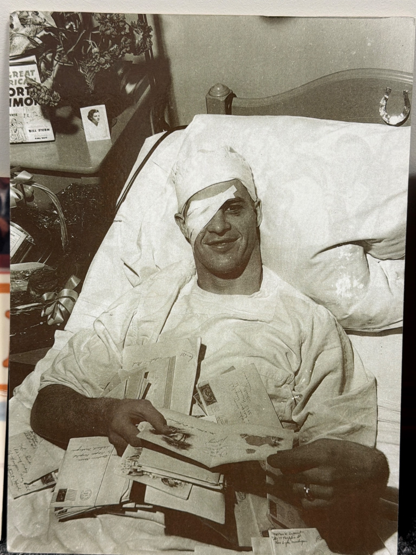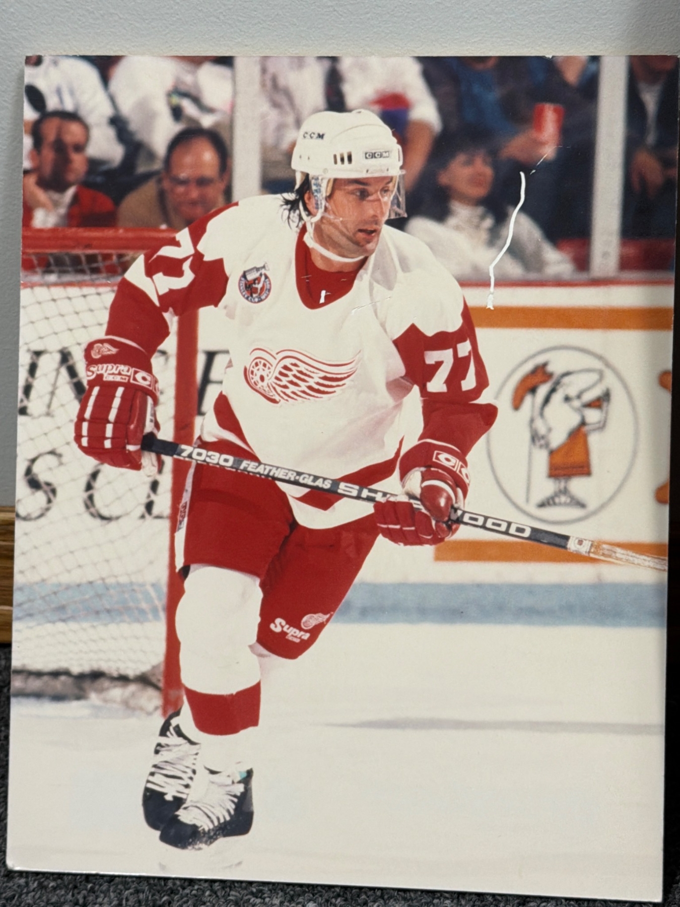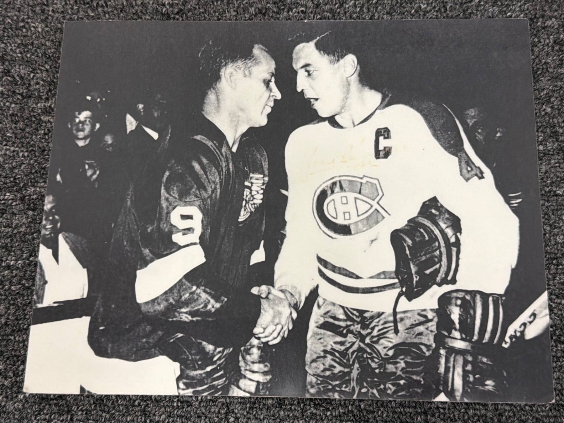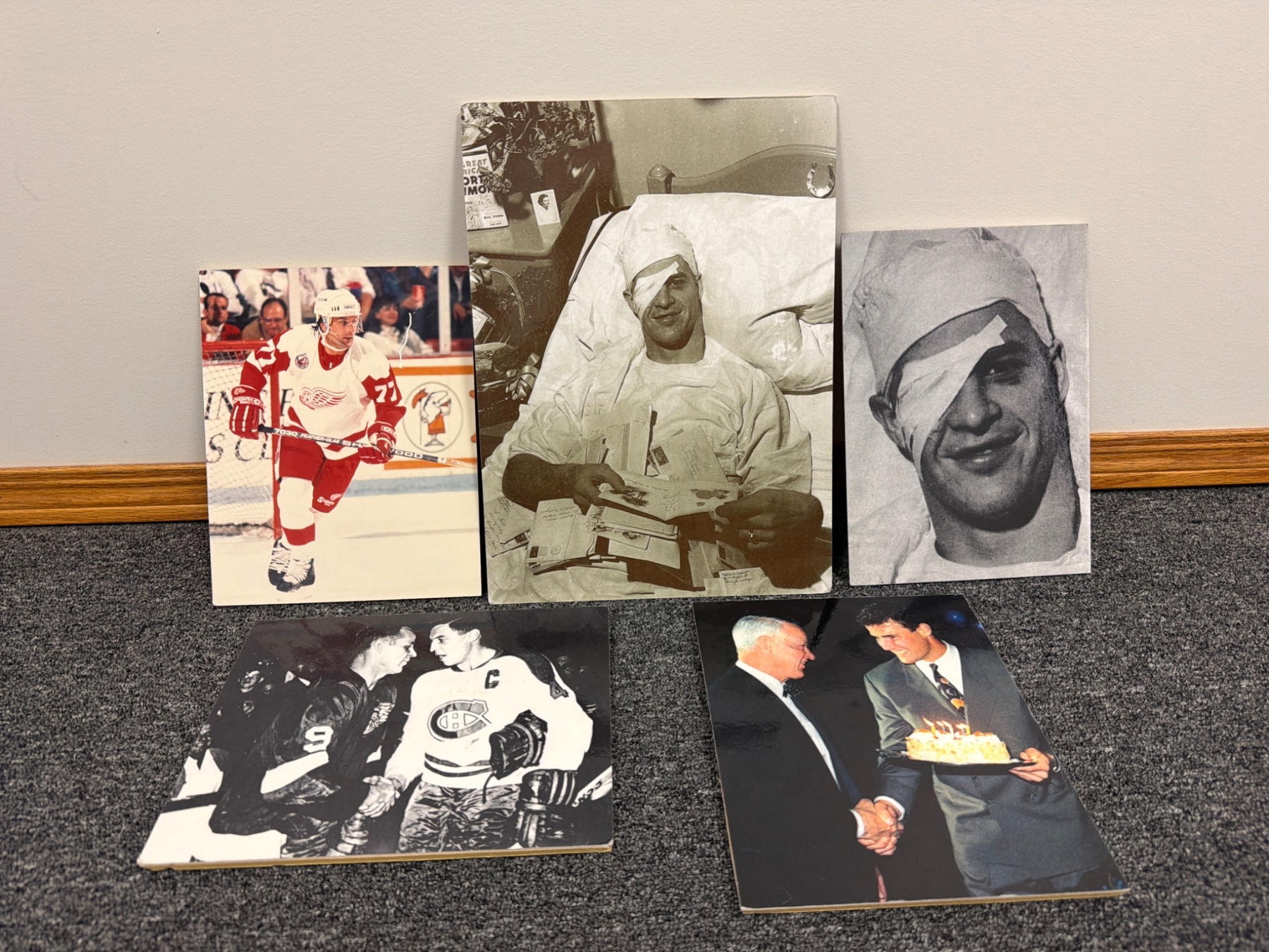 Five Detroit Red Wings themed prints capturing iconic moments in the team's history. Includes action shots, historical candid photographs, and significant events related to legendary players. The collection showcases a mix of black-and-white and color imagery, offering a slice of hockey nostalgia for enthusiasts and collectors. Condition consistent with vintage nature.