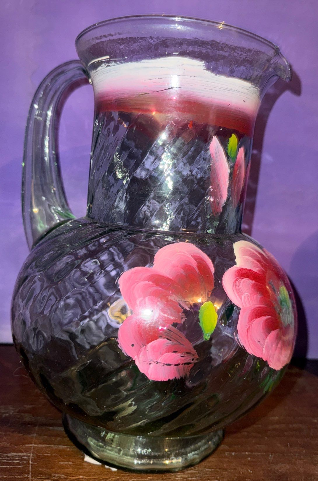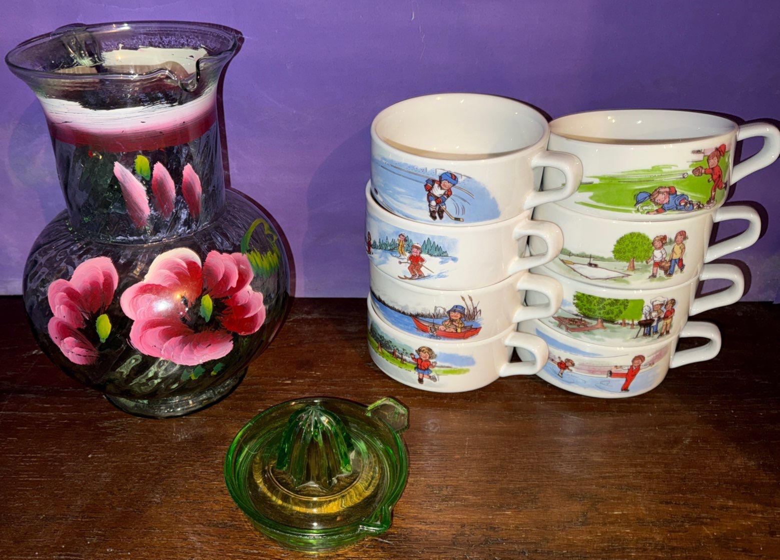 Hand Painted Glass Pitcher w/Floral Design, Vaseline Glass (chipped)+ Campbell's Children Soup Bowl Collection