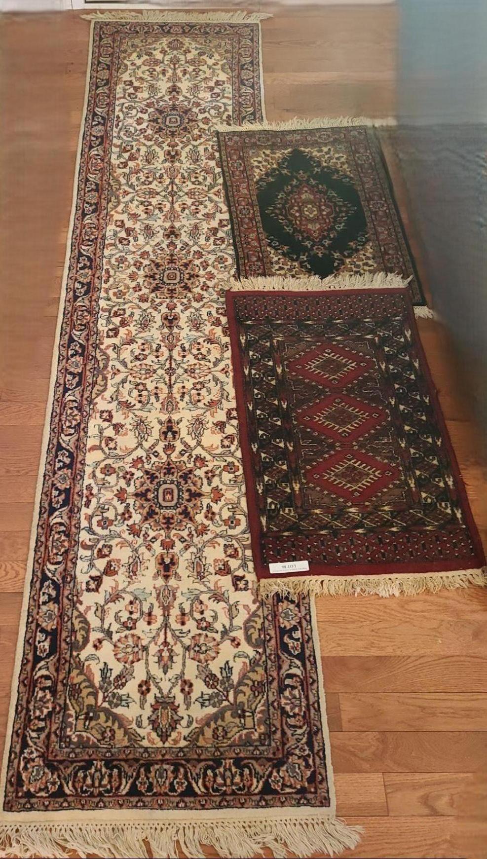 Floral Throw Rug 24 w, 41 l. Geometric Wool Rug 24 w , 42 l & Floral Runner 29 w, 129 l