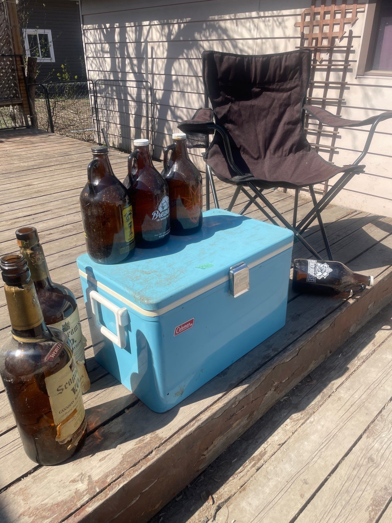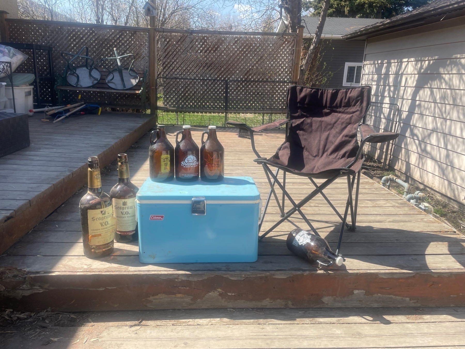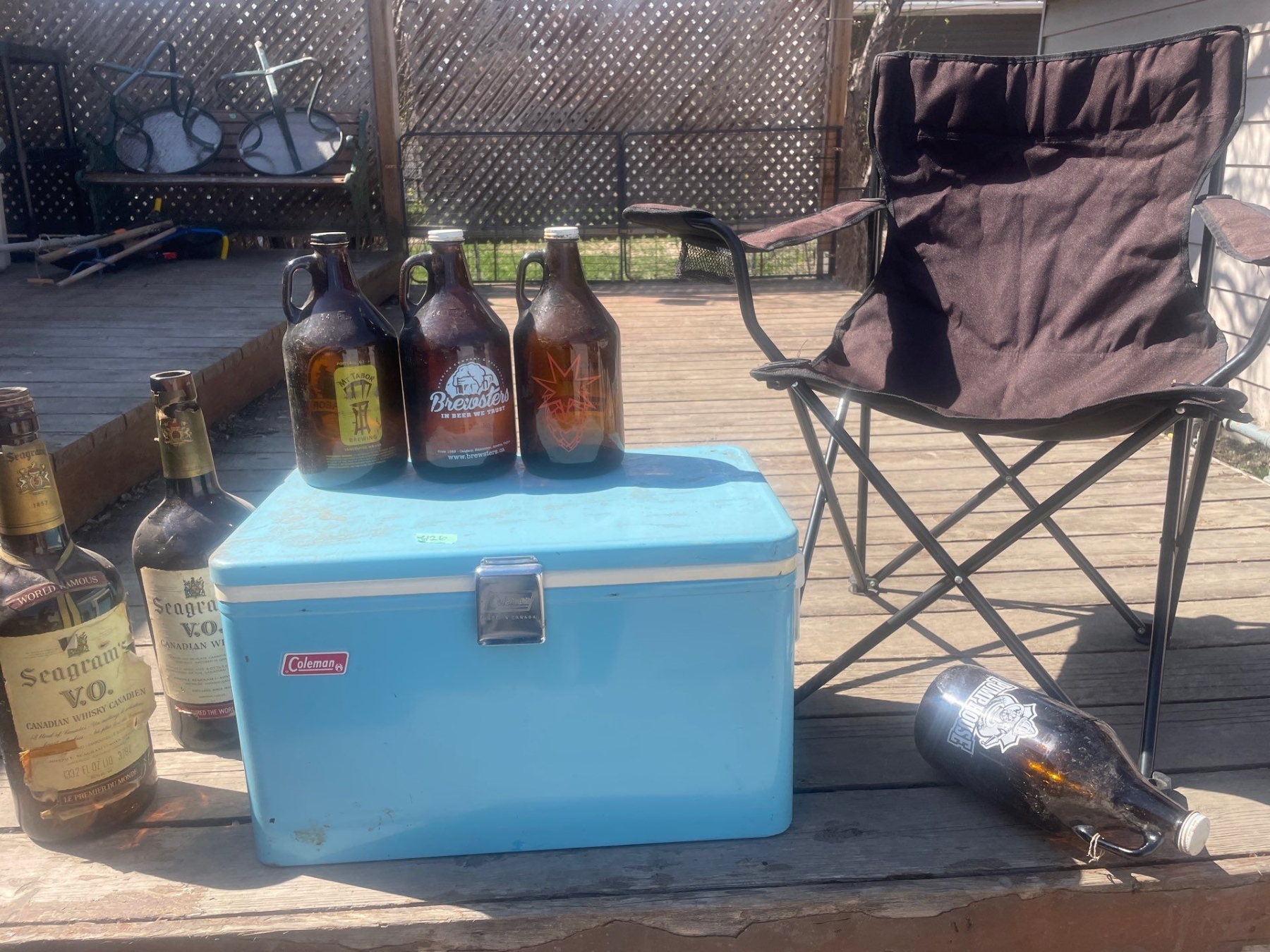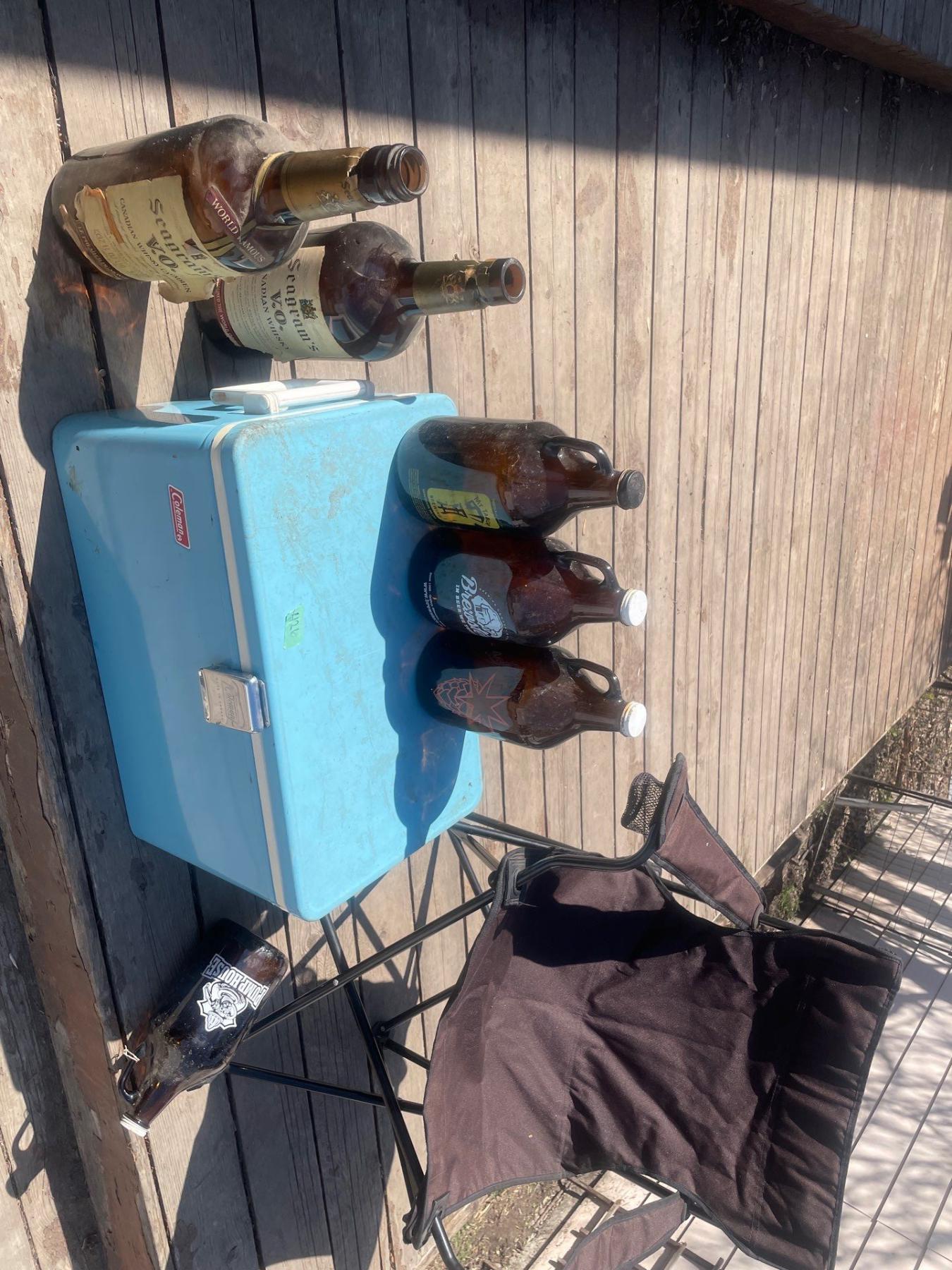 Foldable Lawn Chair, Vintage Cooler, 2 Empty Texas Mickeys, 4 Empty Beer Jugs.