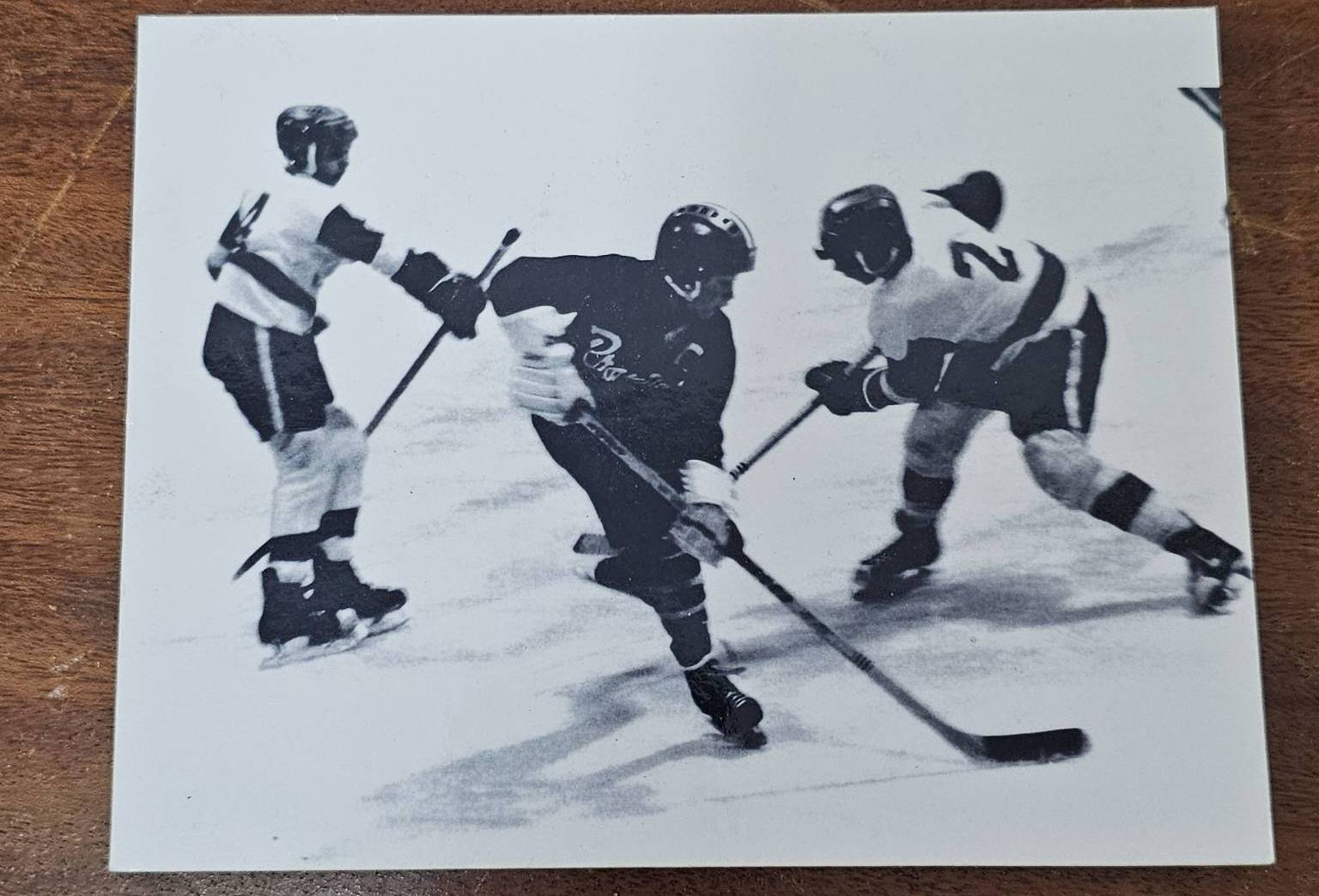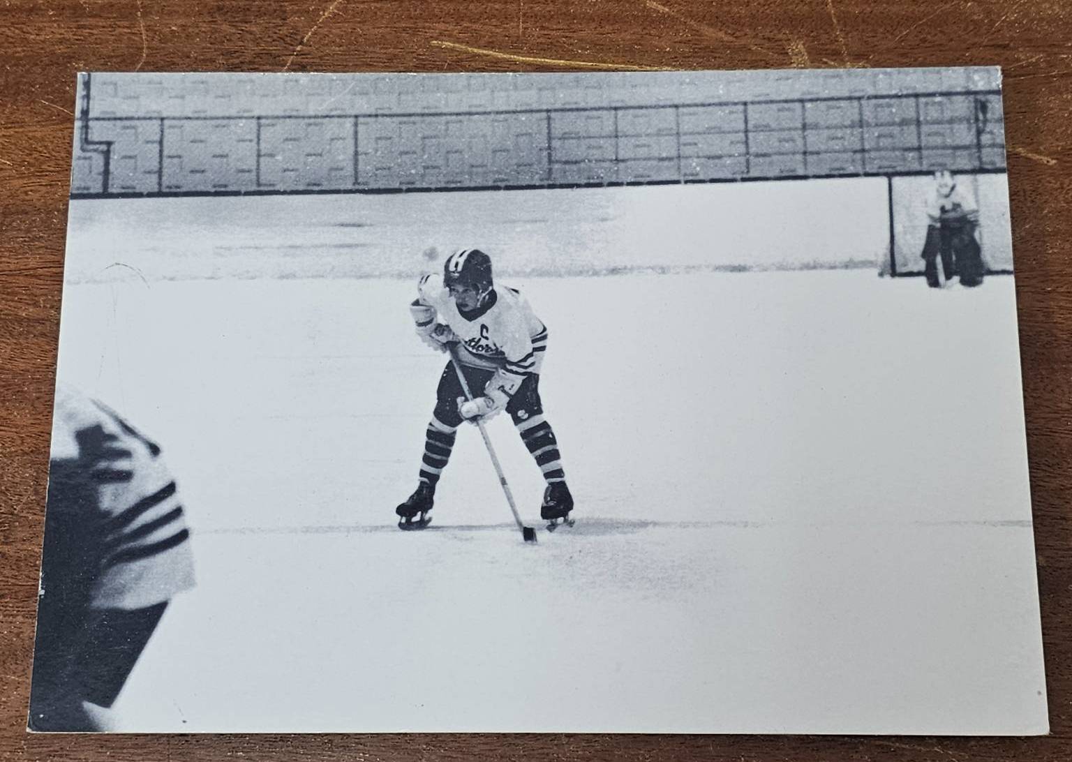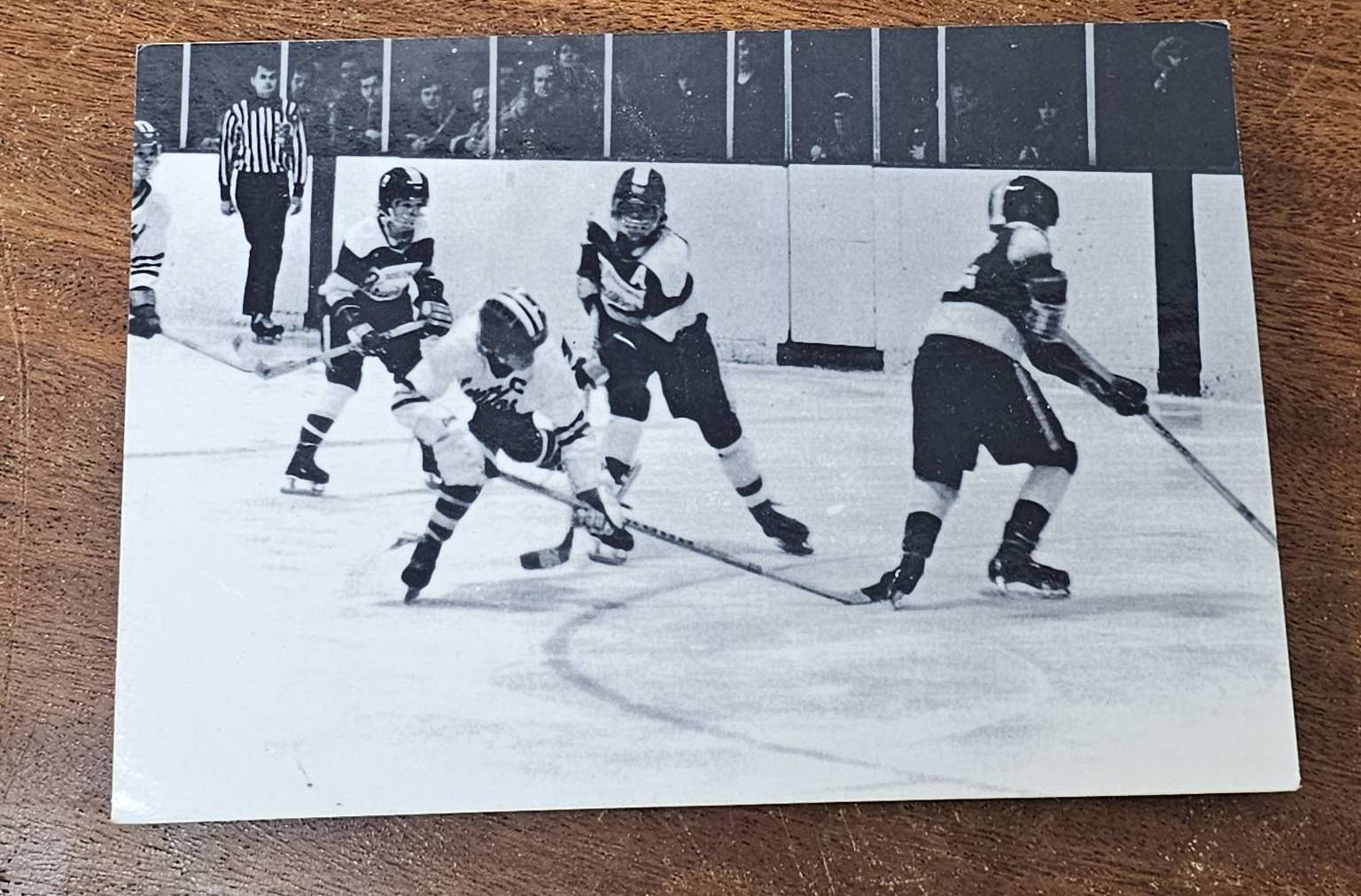 Four black-and-white photographs capturing ice hockey scenes. The photographs feature players in action, including individual and group shots taken during games and practice. The images are printed on photographic paper and showcase vintage-style hockey gear and outdoor as well as indoor rinks.