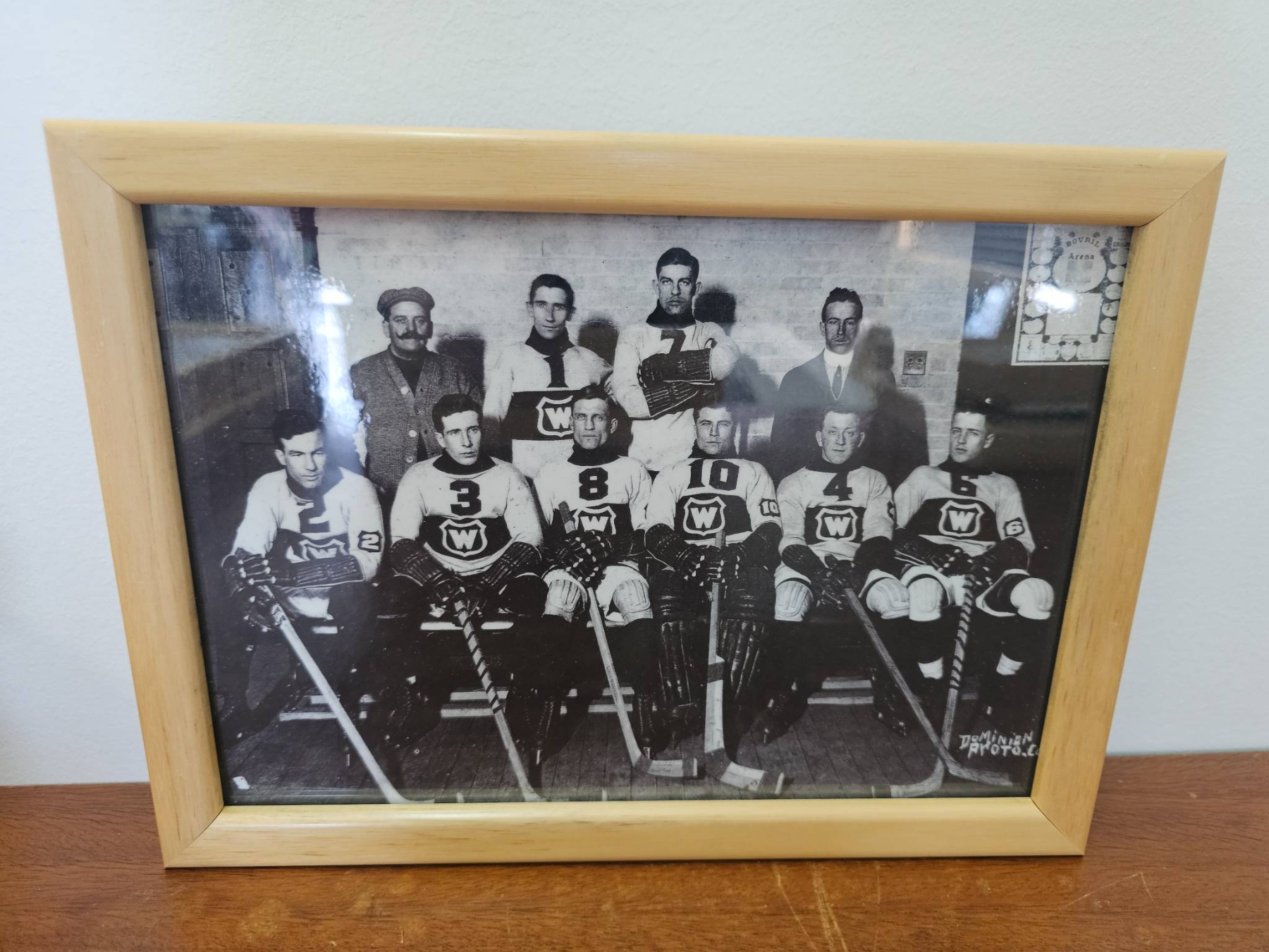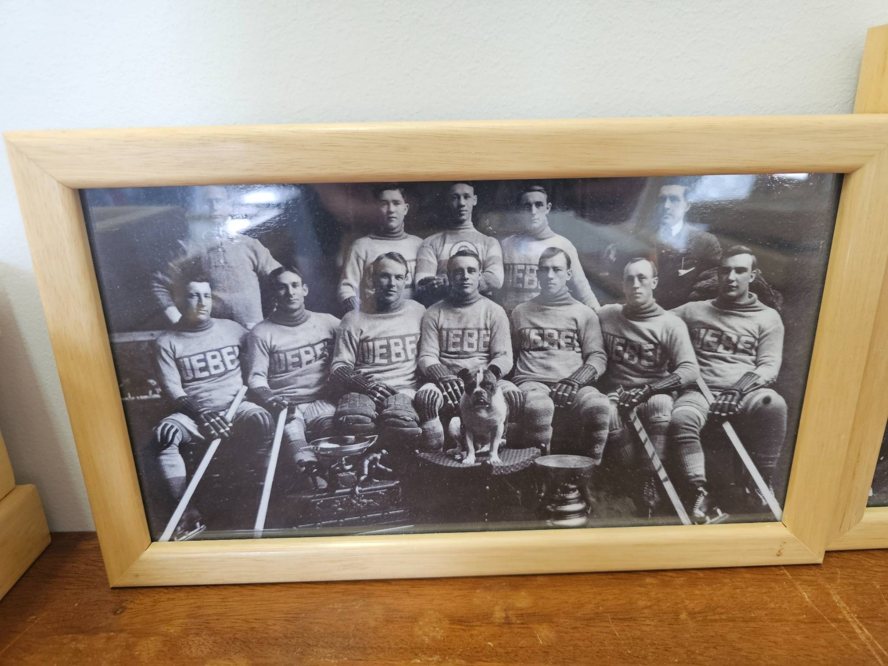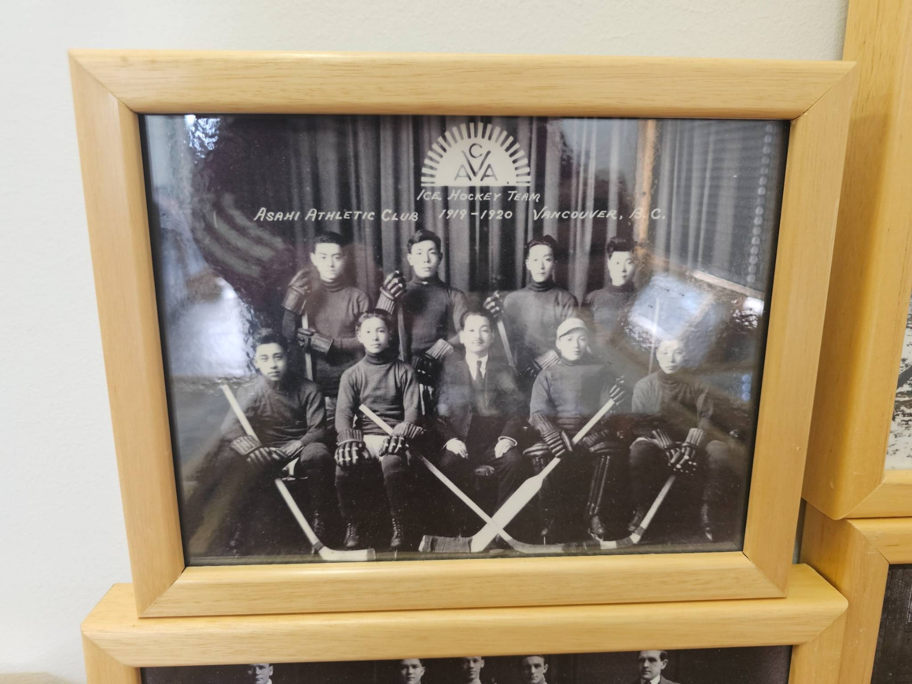 Four black-and-white hockey team photographs displayed in wooden frames. The photos feature various teams, including one labeled "Asahi Athletic Club, Vancouver B.C." Each frame is equipped with secure backing. The dimensions and dates are unspecified, but the photographs are historical in nature with handwritten annotations visible on the back of one frame.