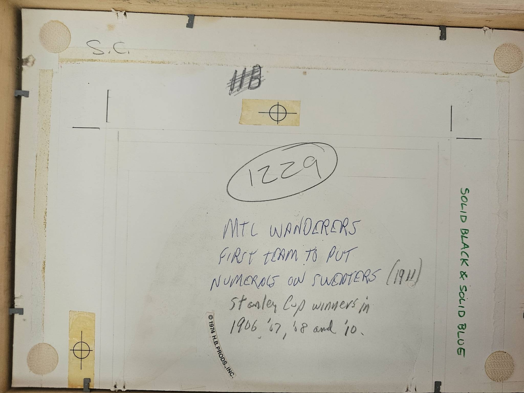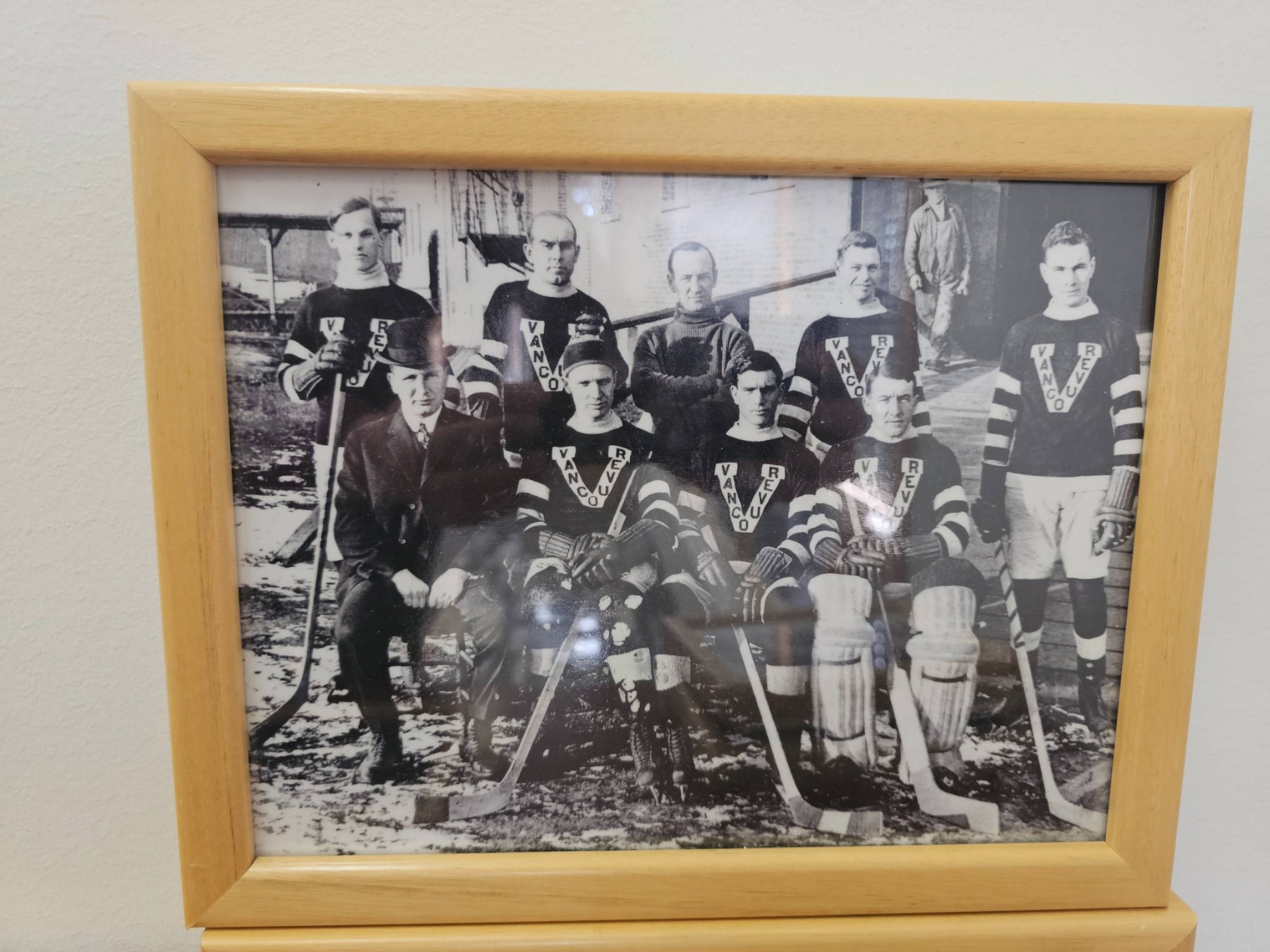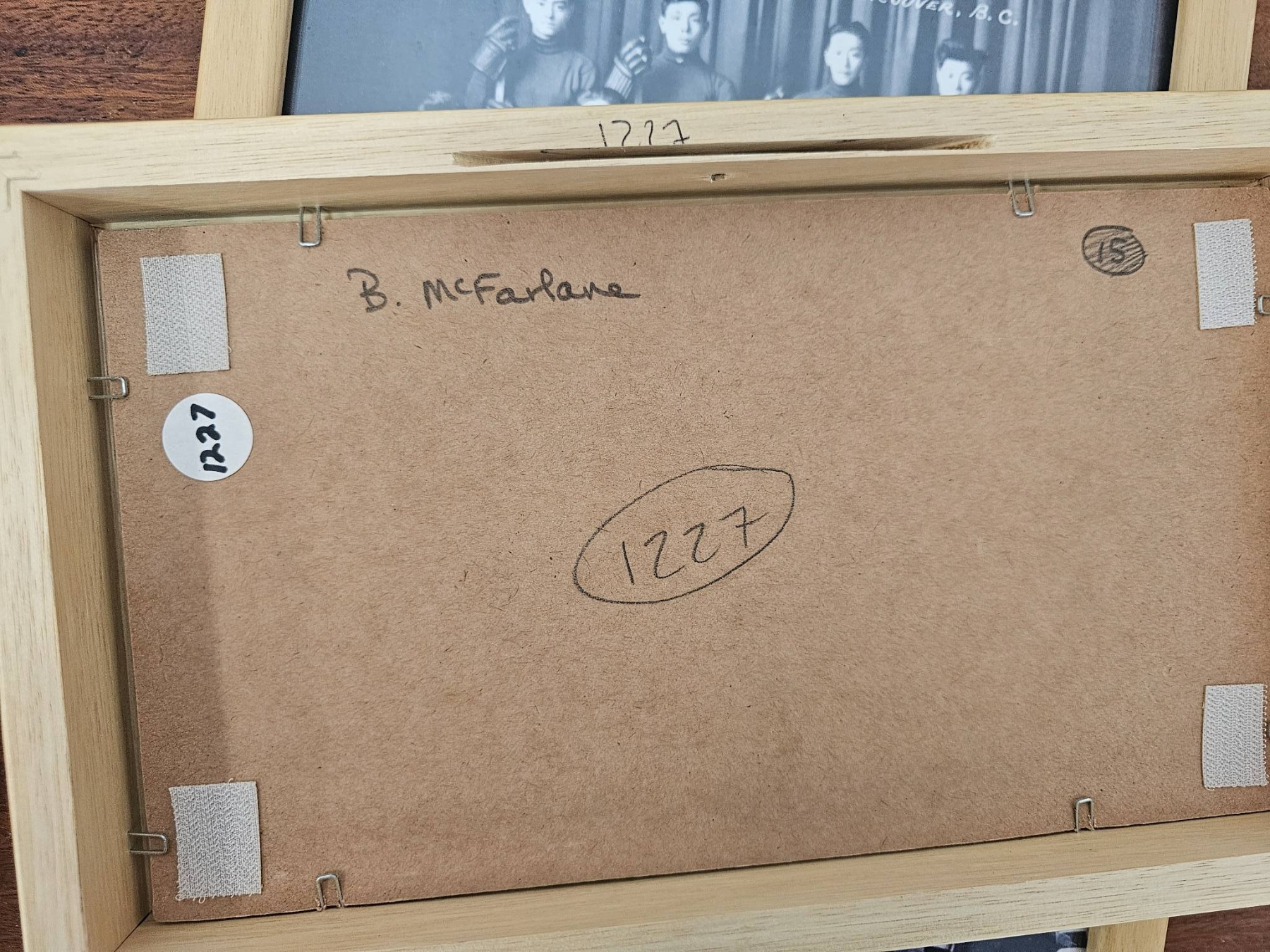 Four black-and-white hockey team photographs displayed in wooden frames. The photos feature various teams, including one labeled "Asahi Athletic Club, Vancouver B.C." Each frame is equipped with secure backing. The dimensions and dates are unspecified, but the photographs are historical in nature with handwritten annotations visible on the back of one frame.