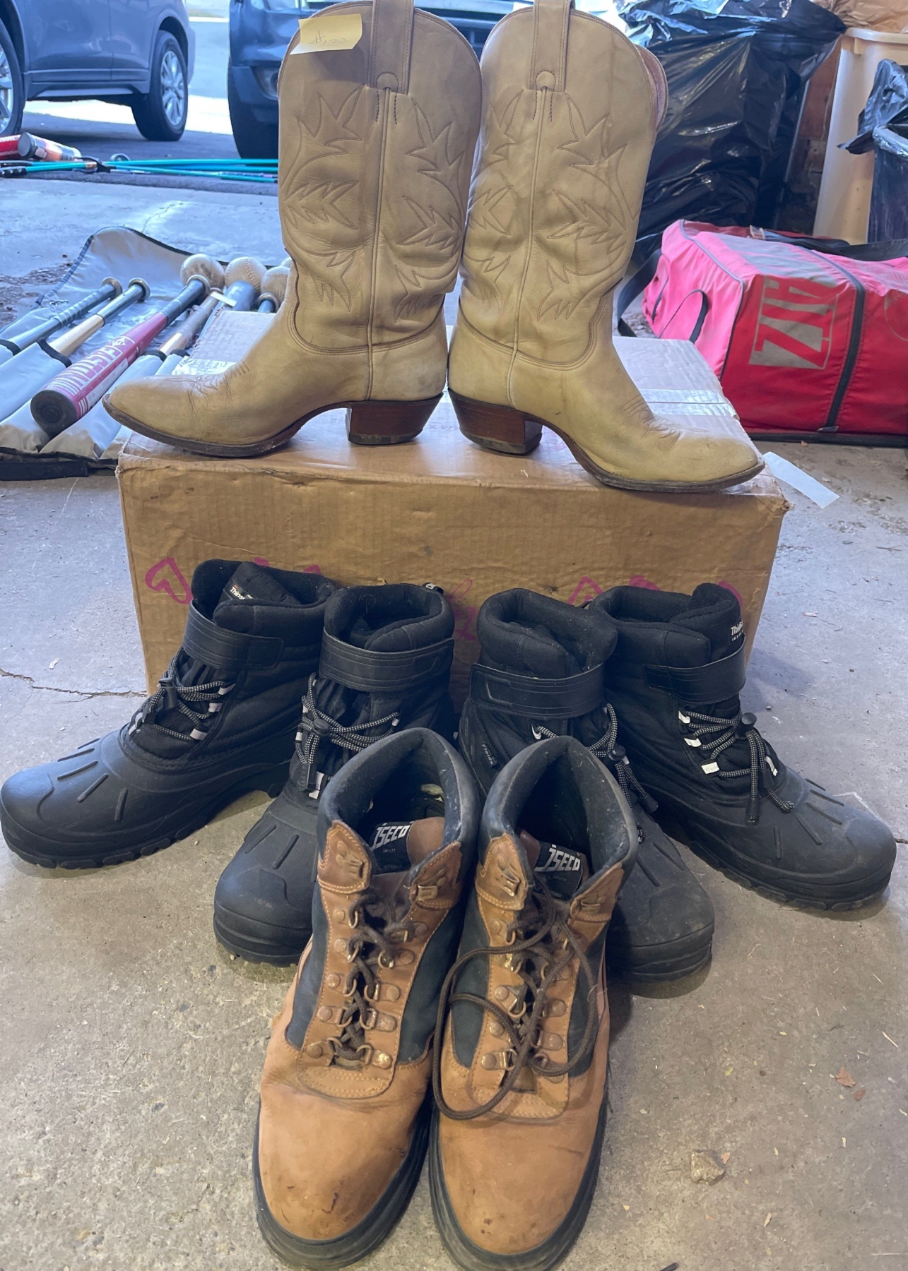 Four Pairs Of Mens Boots  Steel Toed Thinsulate Black Short Boot & Creme Colored Cowboy Boots size11