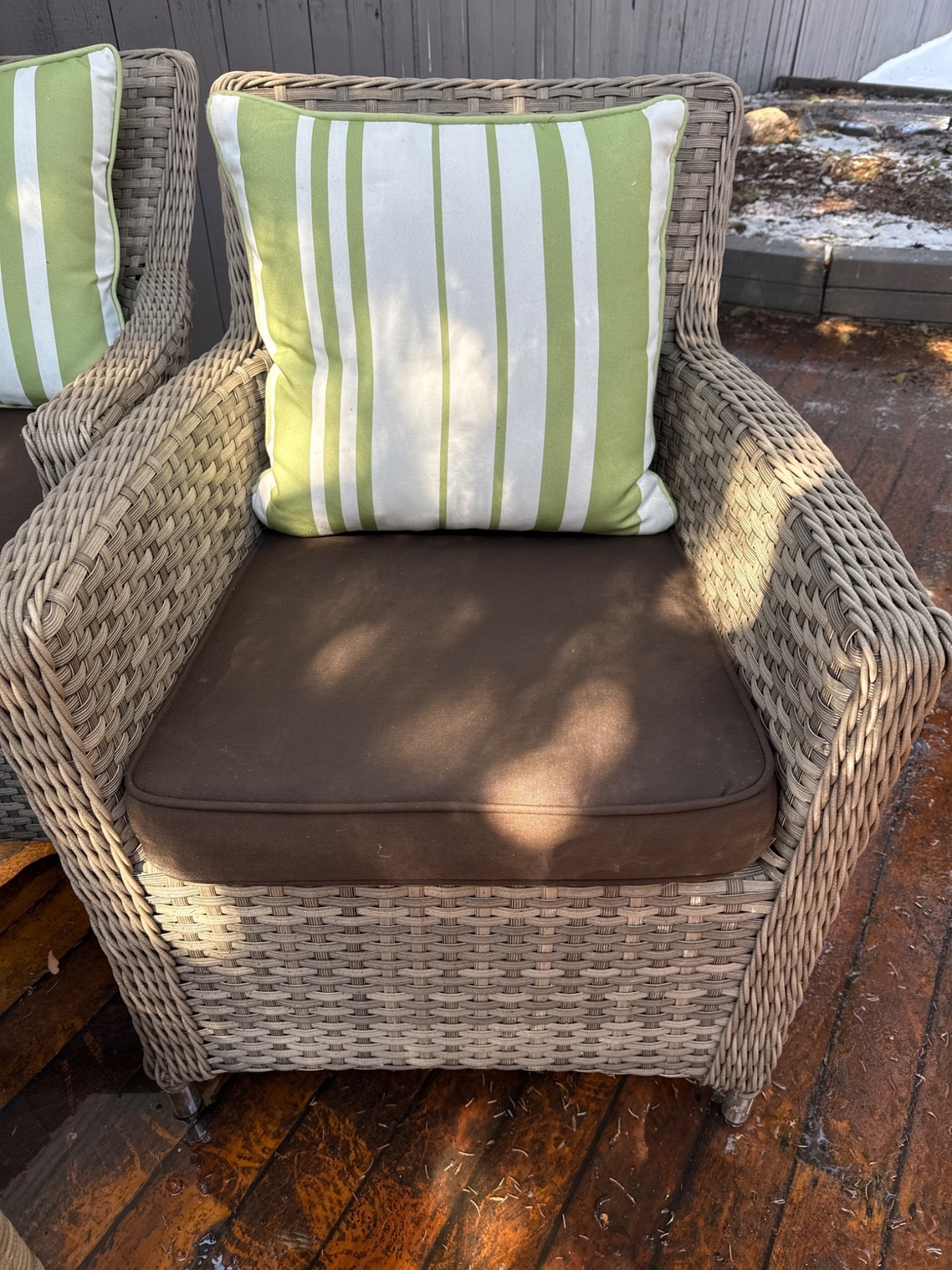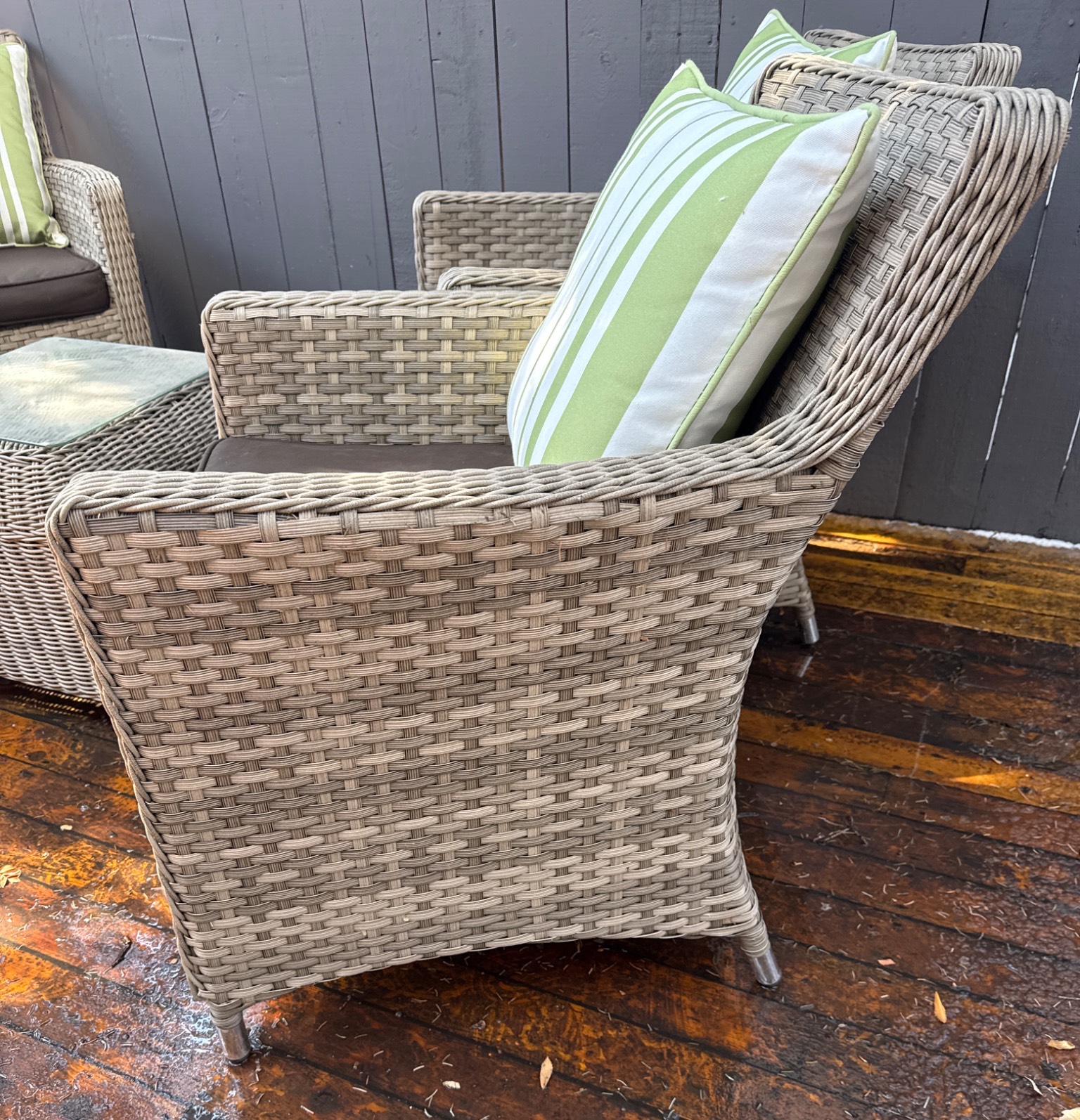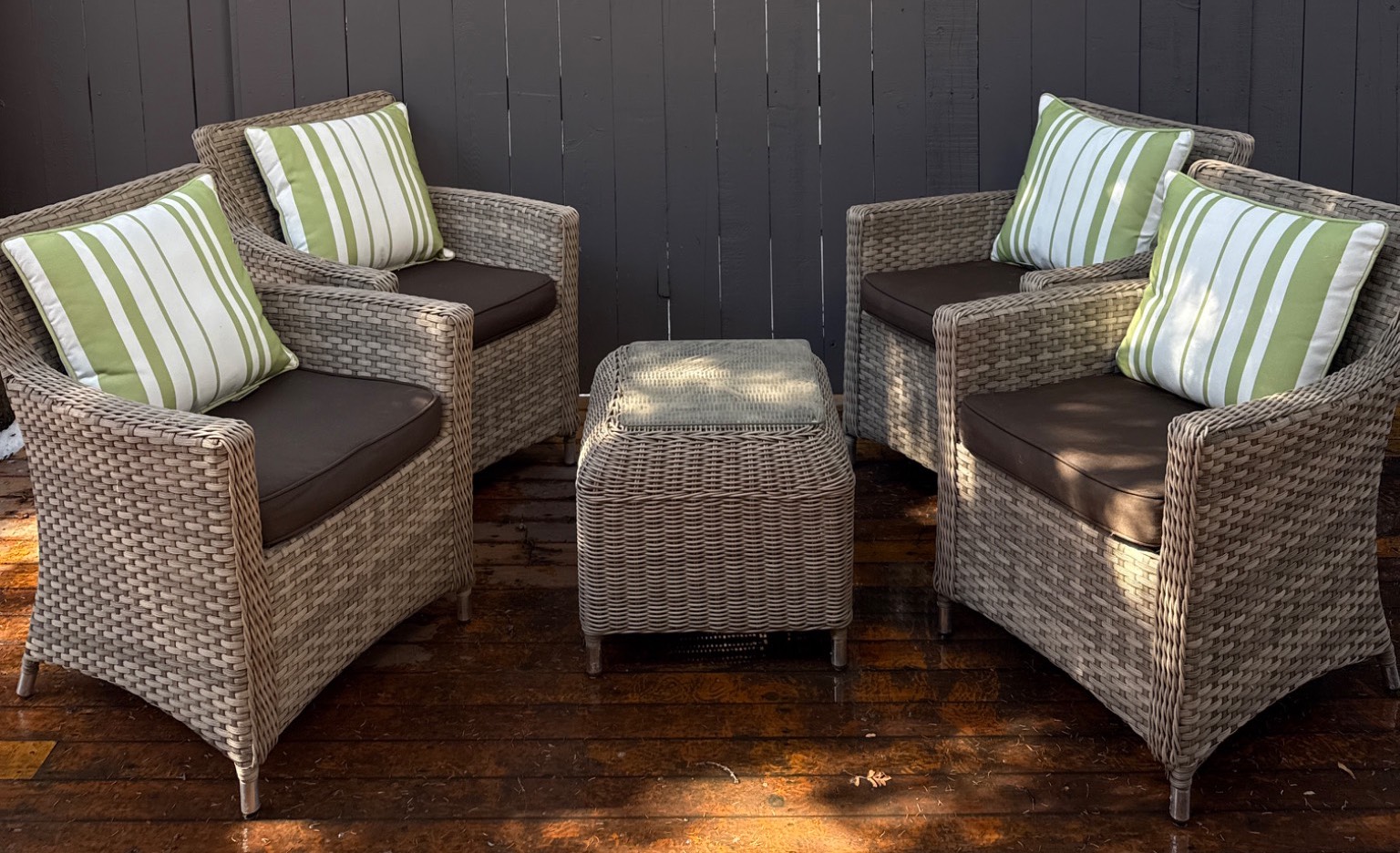 Four-piece outdoor patio set featuring four wicker armchairs and one square weaving-style side table. Includes beige wicker frames with brown seat cushions and striped green and white decorative pillows for added comfort and style. Suitable for small gatherings or outdoor lounging areas. Dimensions and details of each piece are not specified in the provided materials.
