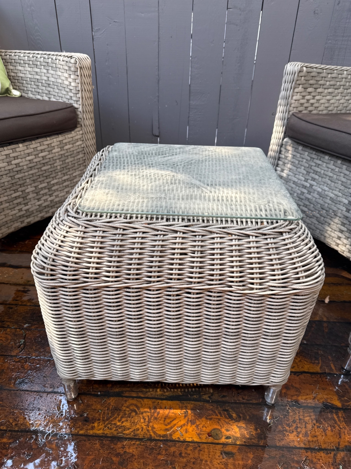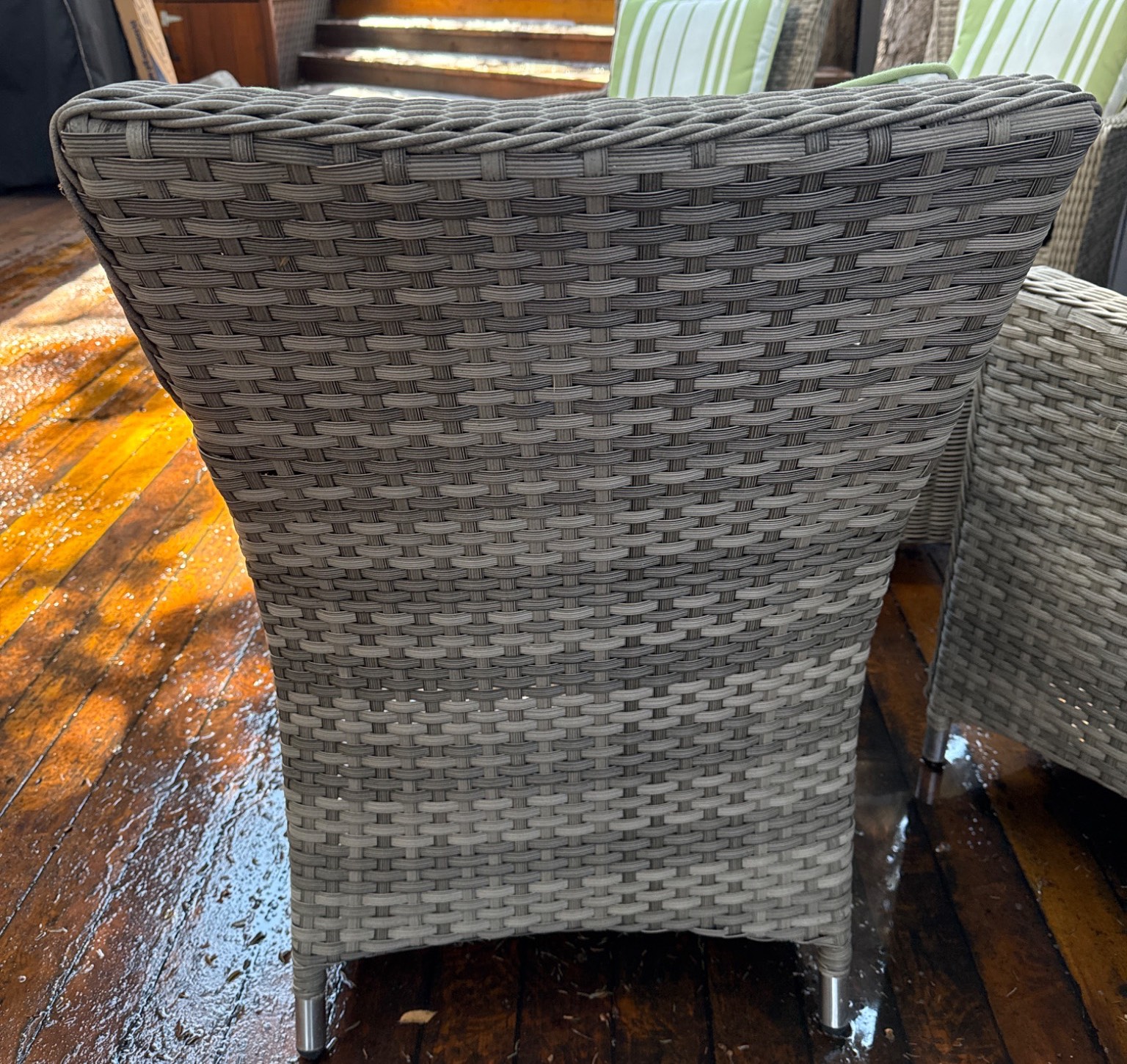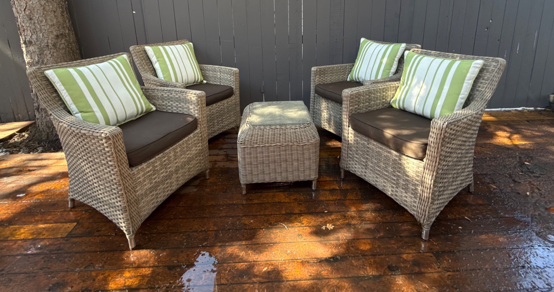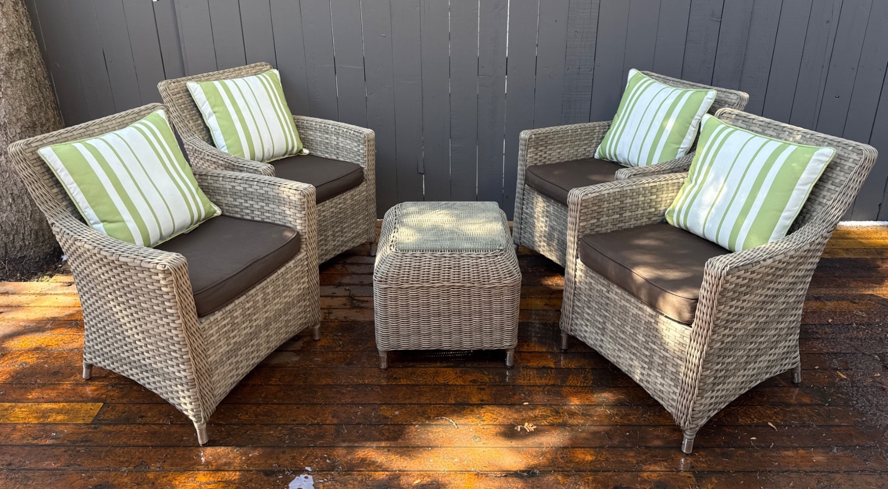 Four-piece outdoor patio set featuring four wicker armchairs and one square weaving-style side table. Includes beige wicker frames with brown seat cushions and striped green and white decorative pillows for added comfort and style. Suitable for small gatherings or outdoor lounging areas. Dimensions and details of each piece are not specified in the provided materials.