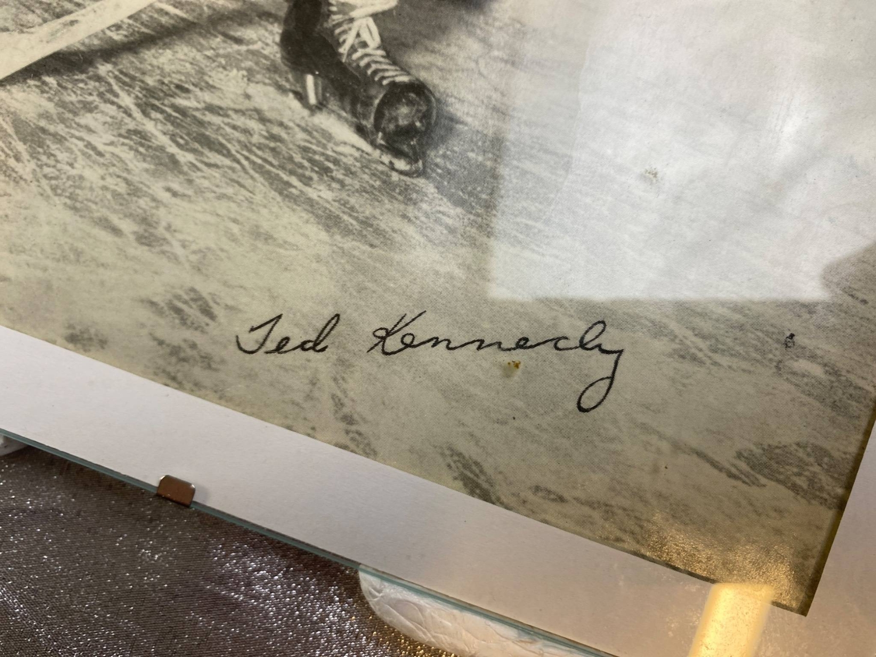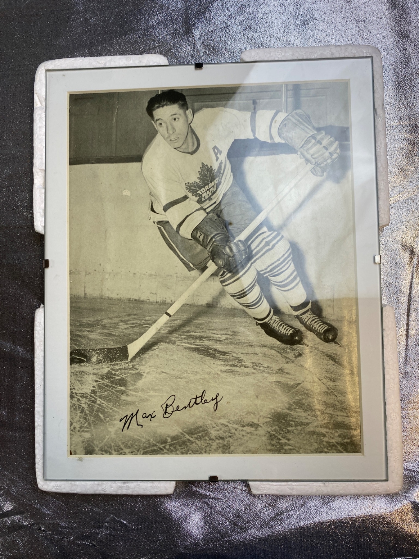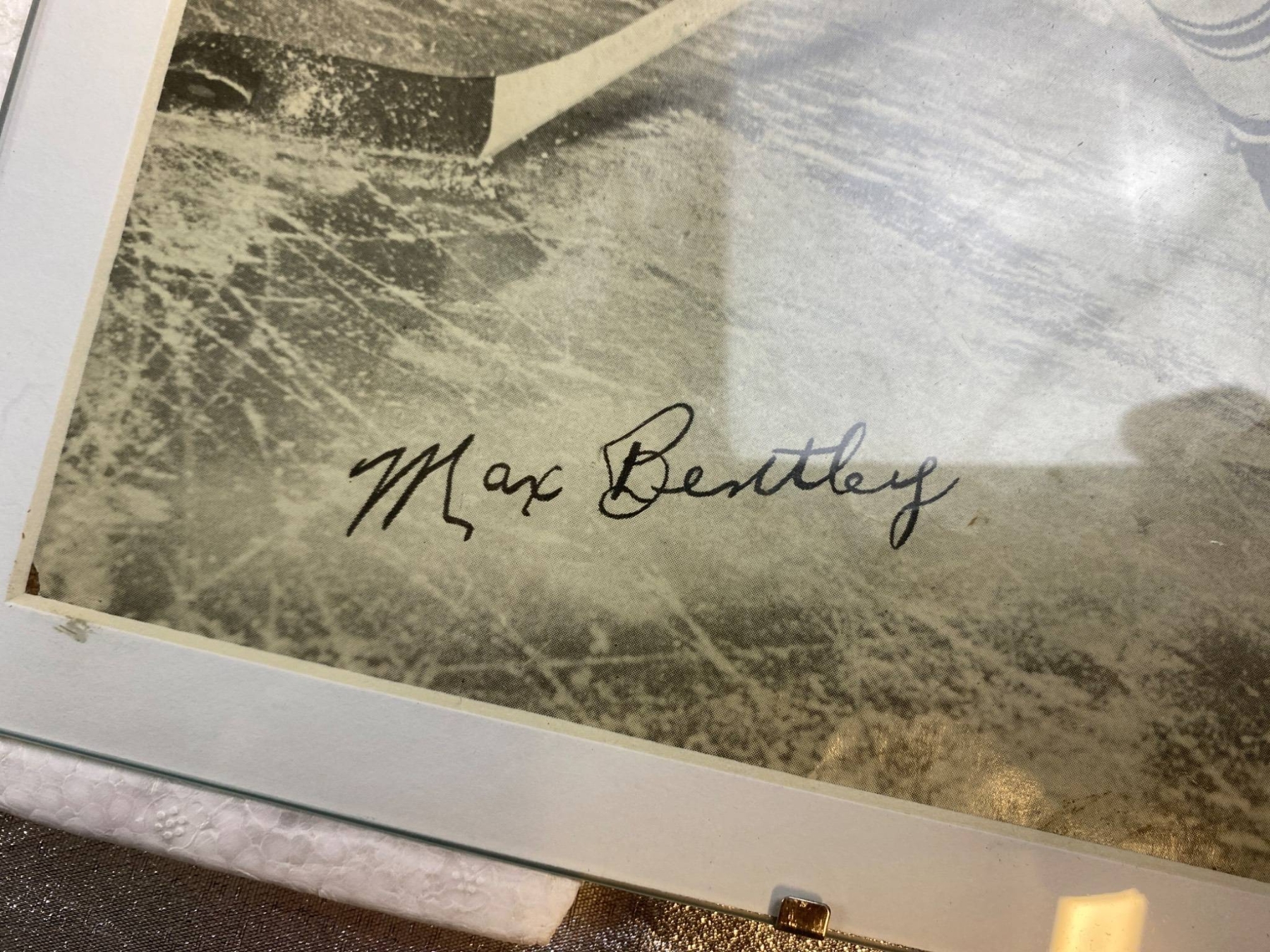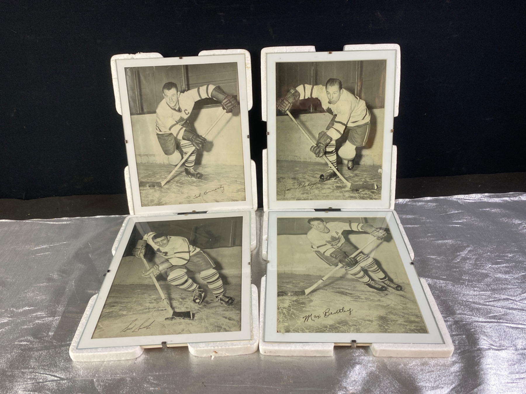 Four vintage black-and-white photographs featuring Toronto Maple Leafs players, each signed with the player’s autograph. Mounted in protective glass cases, the images showcase players in action on the ice. Clear signatures make these items a desirable collectible for hockey fans and sports memorabilia enthusiasts. Ideal for display or adding to a collection.