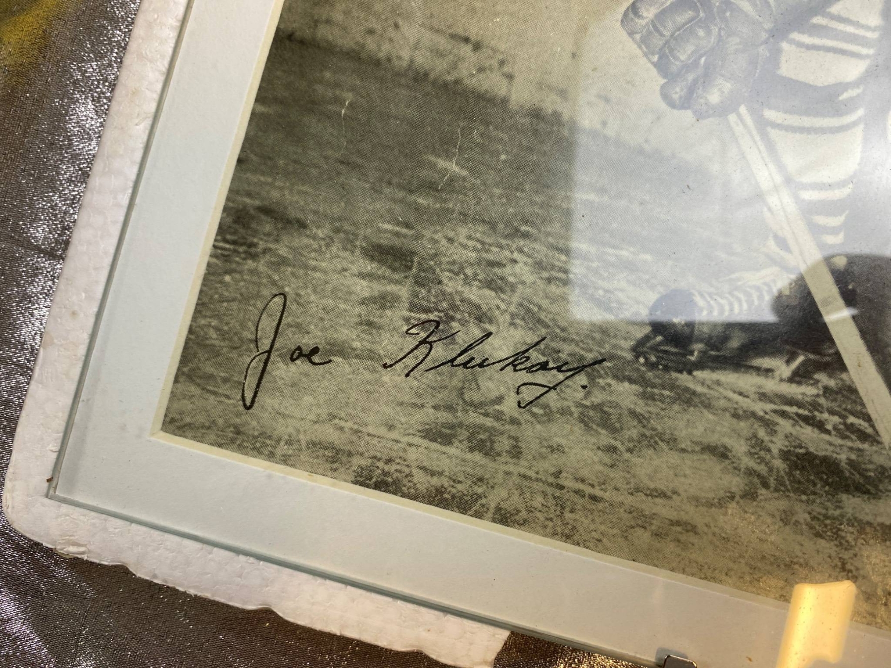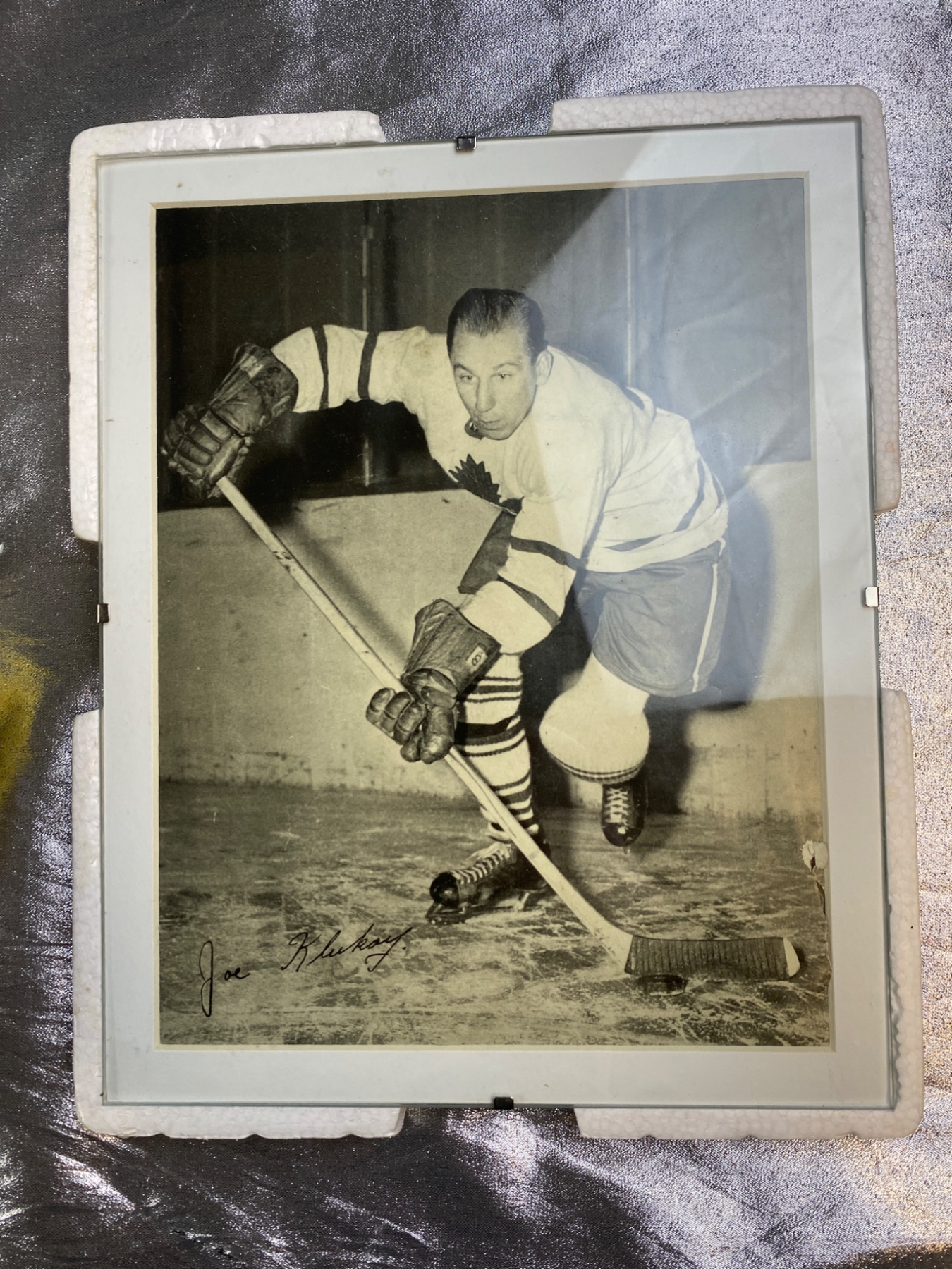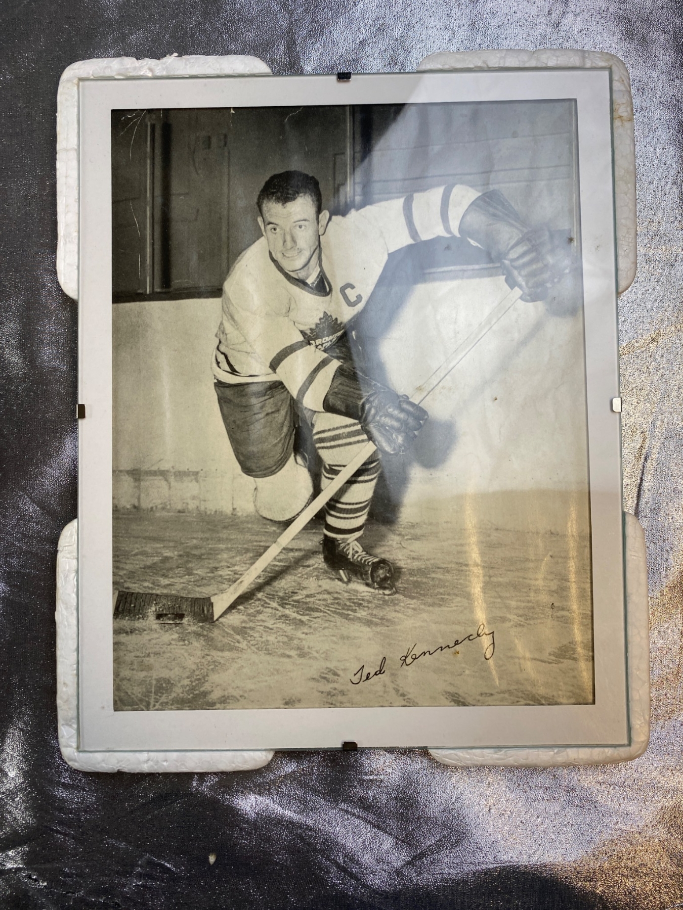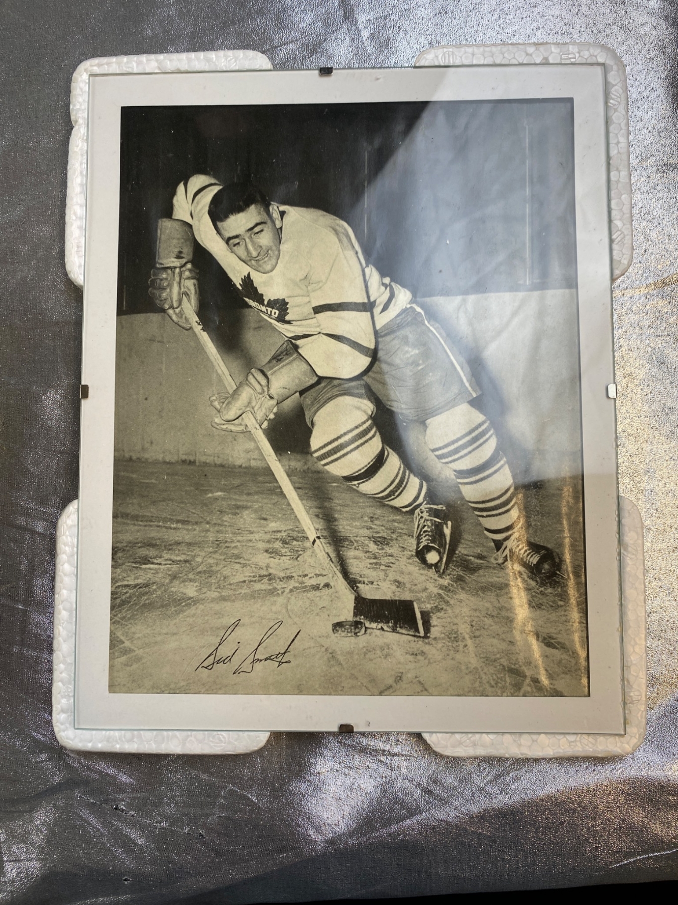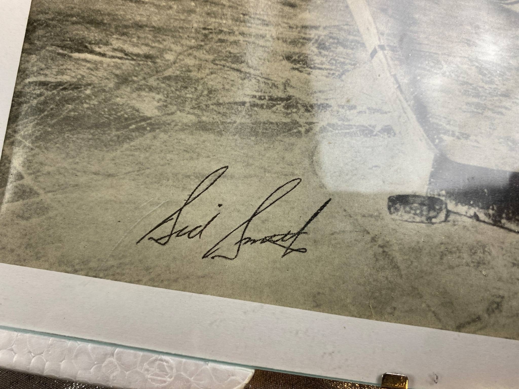 Four vintage black-and-white photographs featuring Toronto Maple Leafs players, each signed with the player’s autograph. Mounted in protective glass cases, the images showcase players in action on the ice. Clear signatures make these items a desirable collectible for hockey fans and sports memorabilia enthusiasts. Ideal for display or adding to a collection.