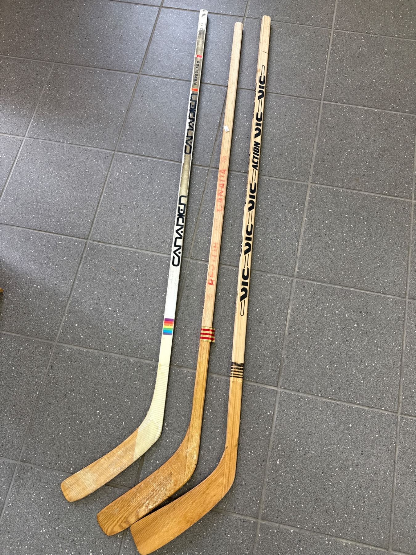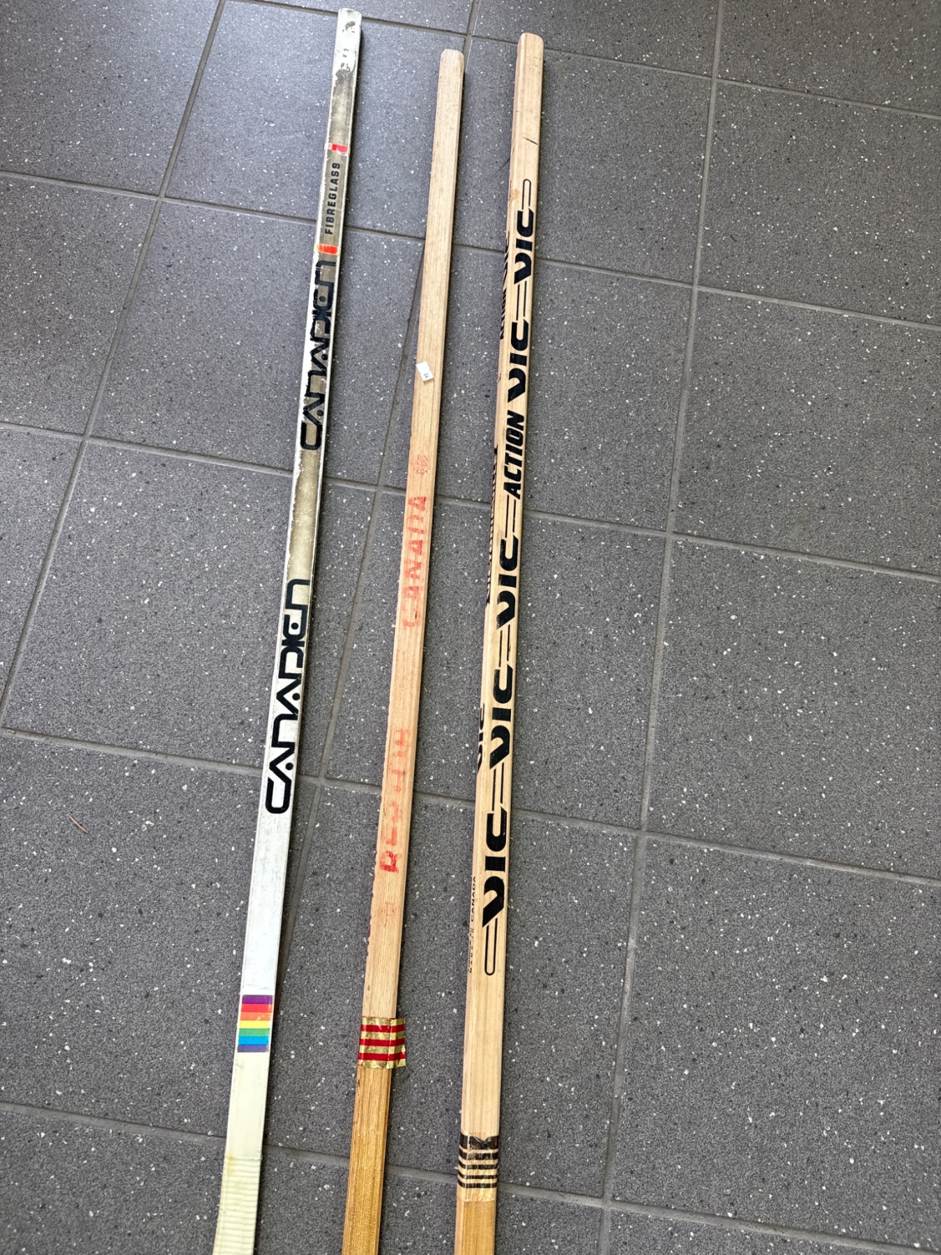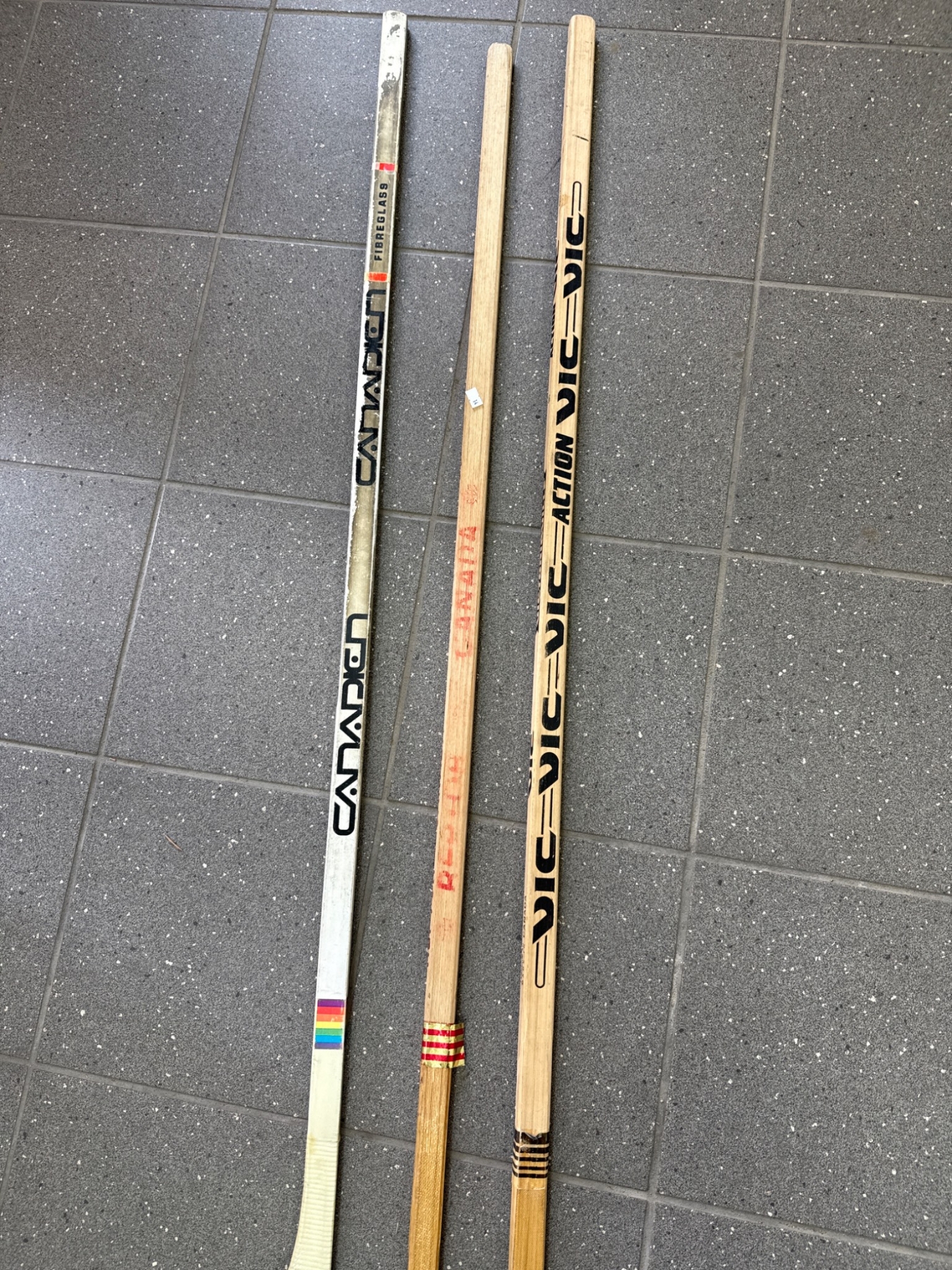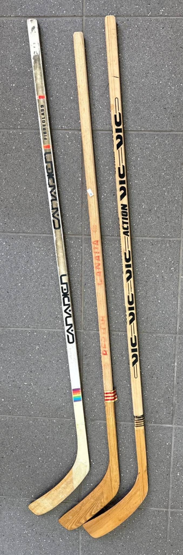 Four wooden hockey sticks featuring various brands including 'Canadien' and 'Vic'. The sticks display natural wood finishes with painted brand markings, as well as one featuring tape on the blade. They show wear consistent with use, including scratches and paint loss. Functional condition and exact dimensions are not specified.