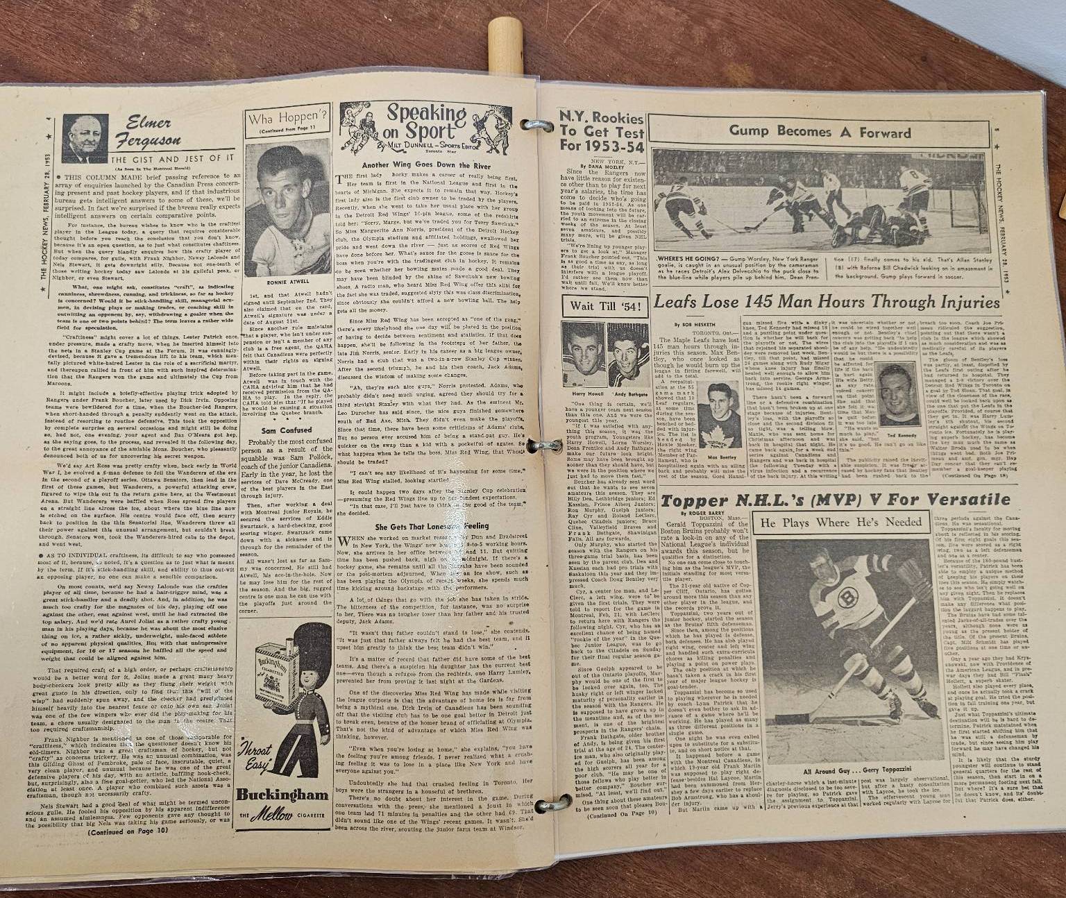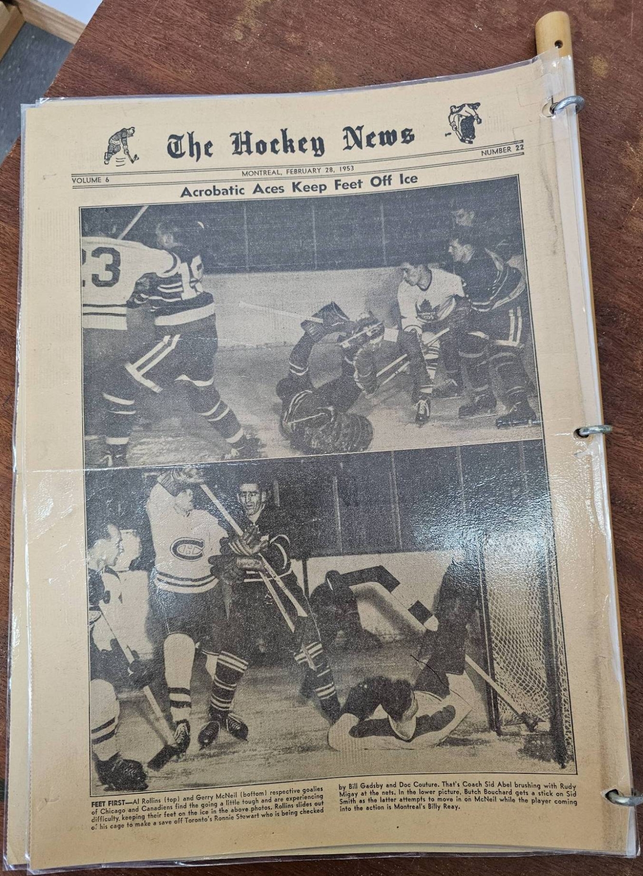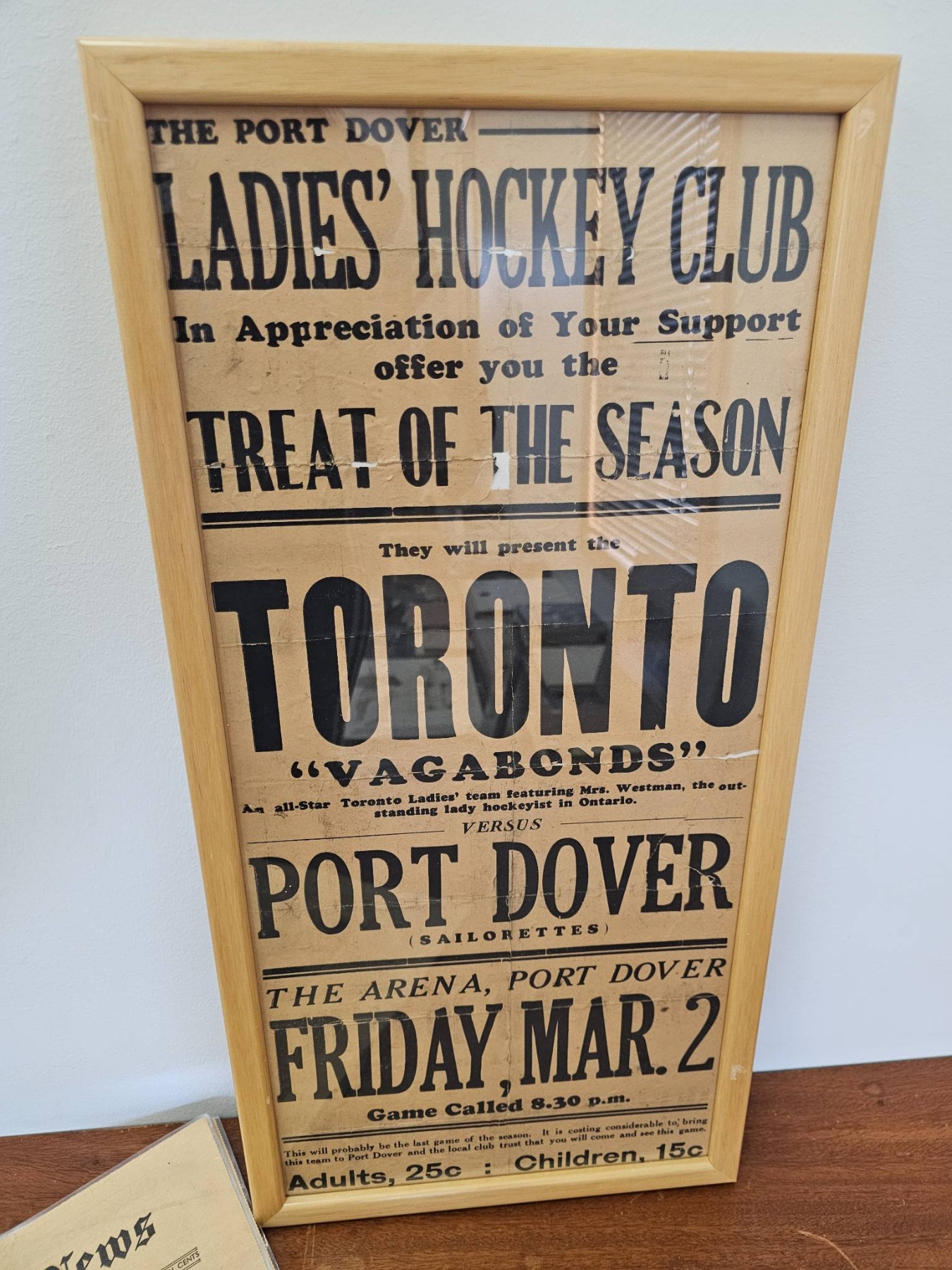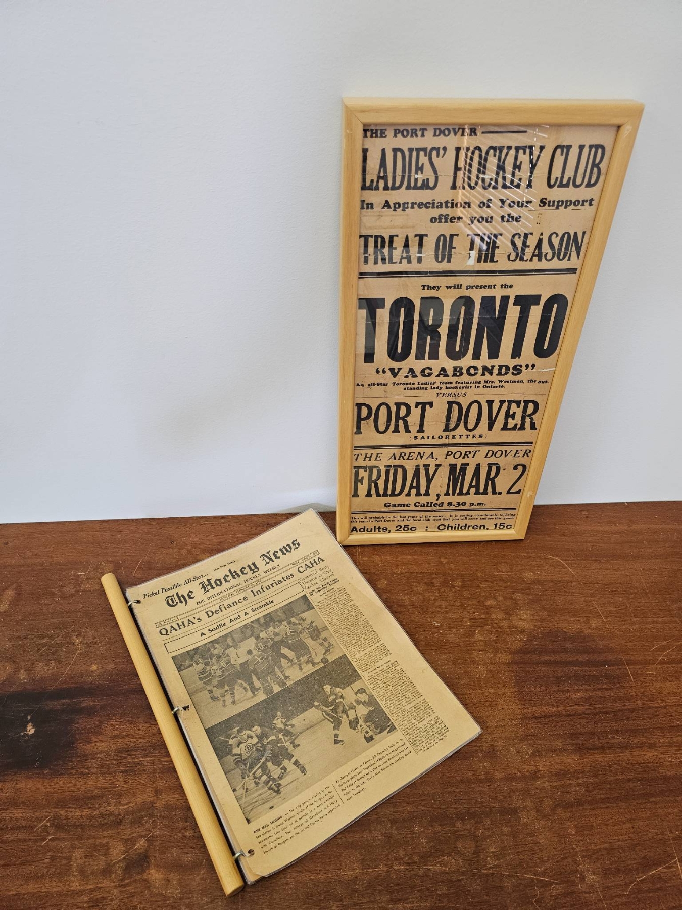 A framed poster promoting the Port Dover Ladie's Hockey Club event featuring the Toronto Vagabonds, held on Friday, March 2, at The Arena in Port Dover. Accompanied by a vintage compilation of The Hockey News issues, highlighting news, scores, and features of the era. The items show age-appropriate wear, with the poster protected under glass and the newspaper having visible creases and yellowing consistent with age.