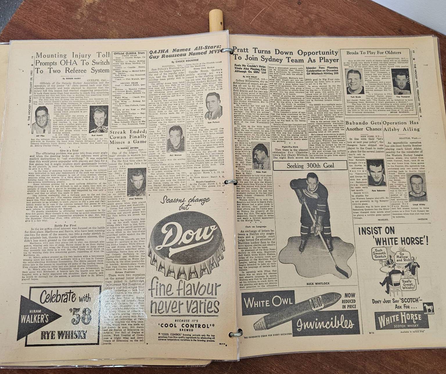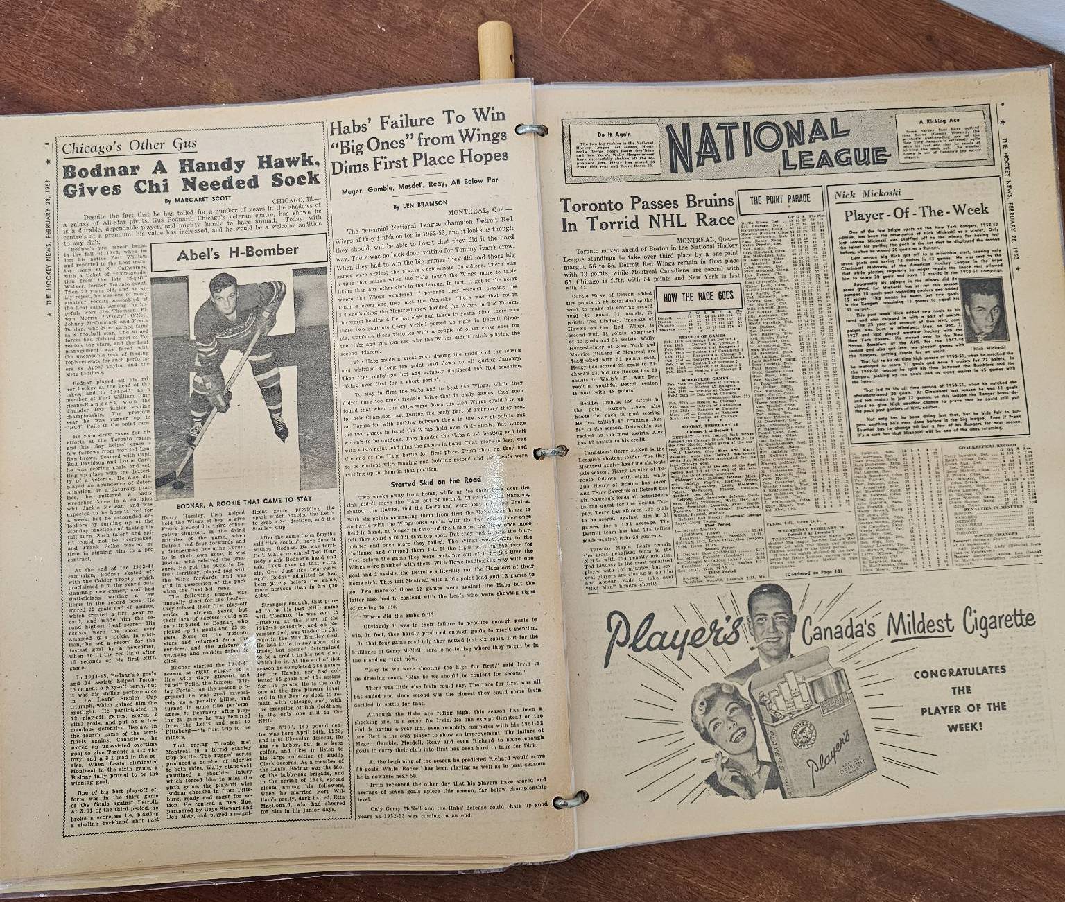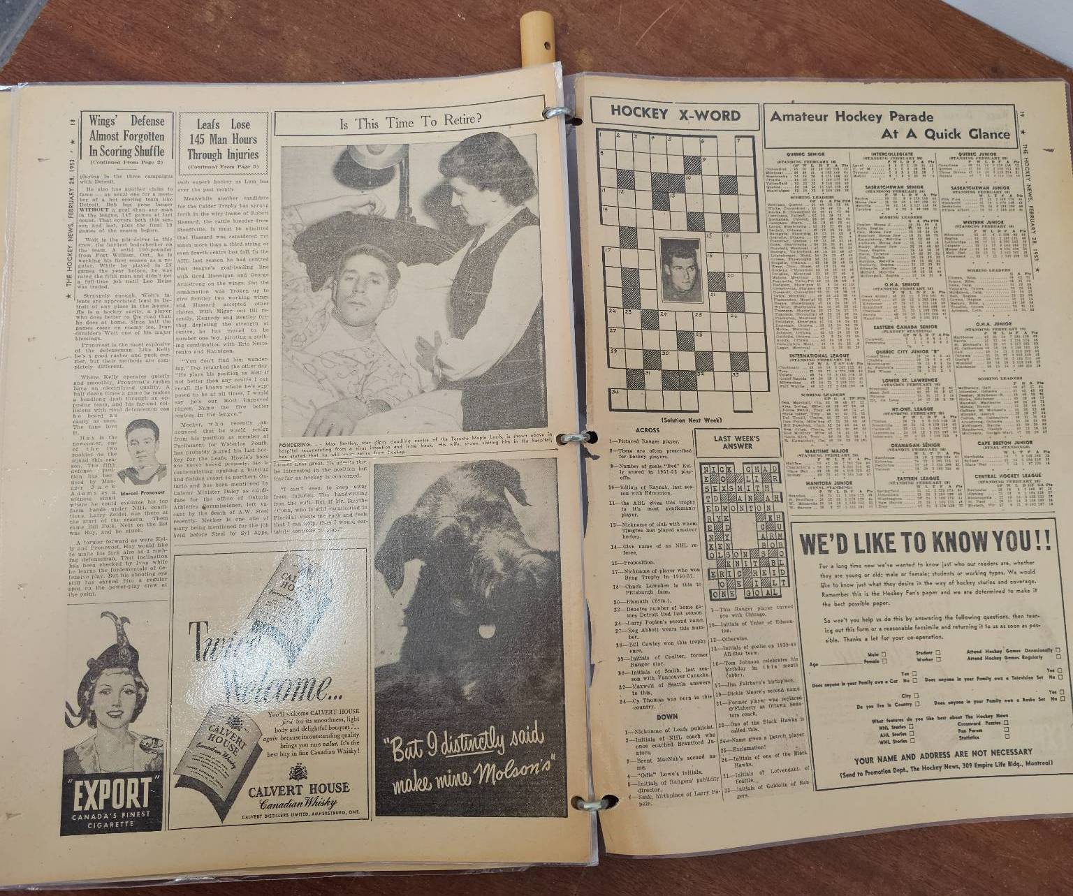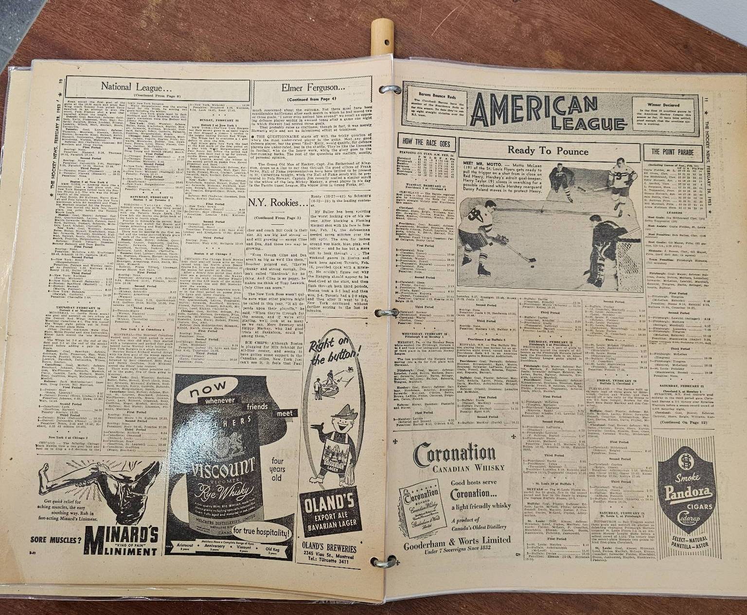 A framed poster promoting the Port Dover Ladie's Hockey Club event featuring the Toronto Vagabonds, held on Friday, March 2, at The Arena in Port Dover. Accompanied by a vintage compilation of The Hockey News issues, highlighting news, scores, and features of the era. The items show age-appropriate wear, with the poster protected under glass and the newspaper having visible creases and yellowing consistent with age.