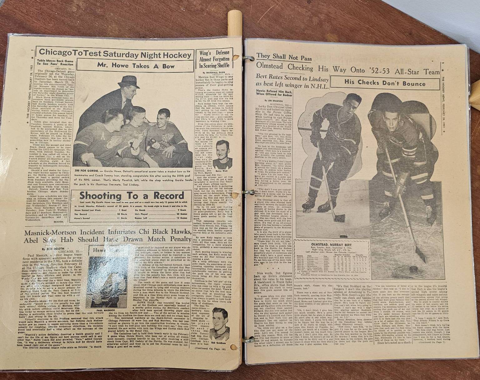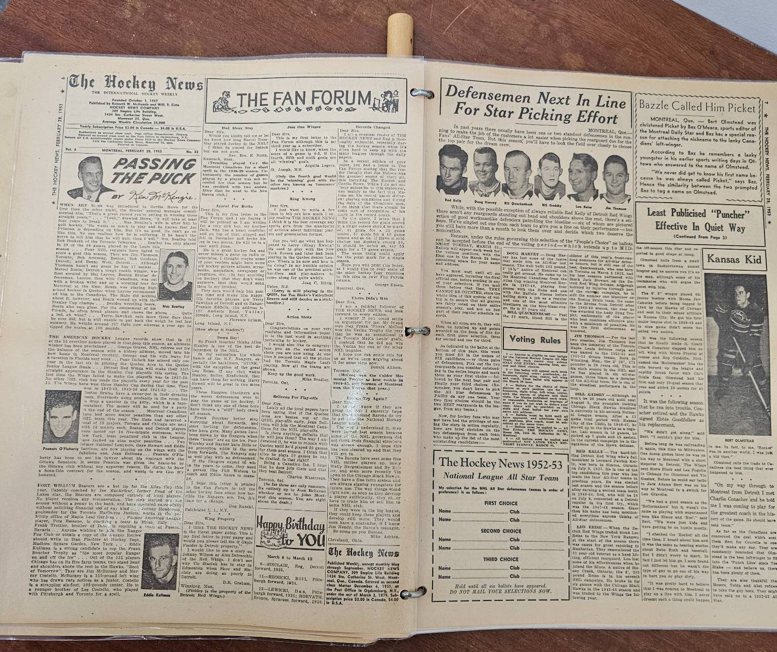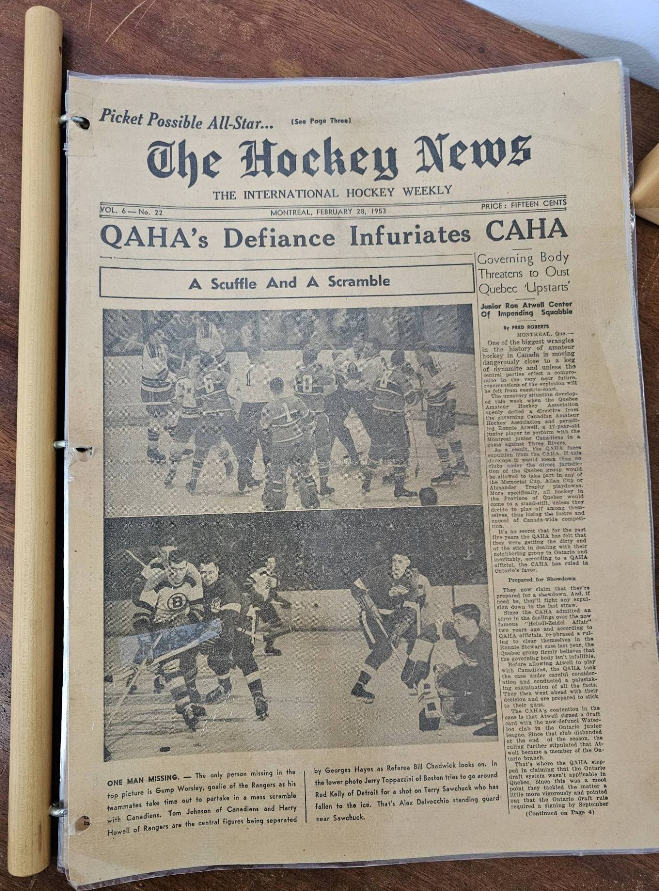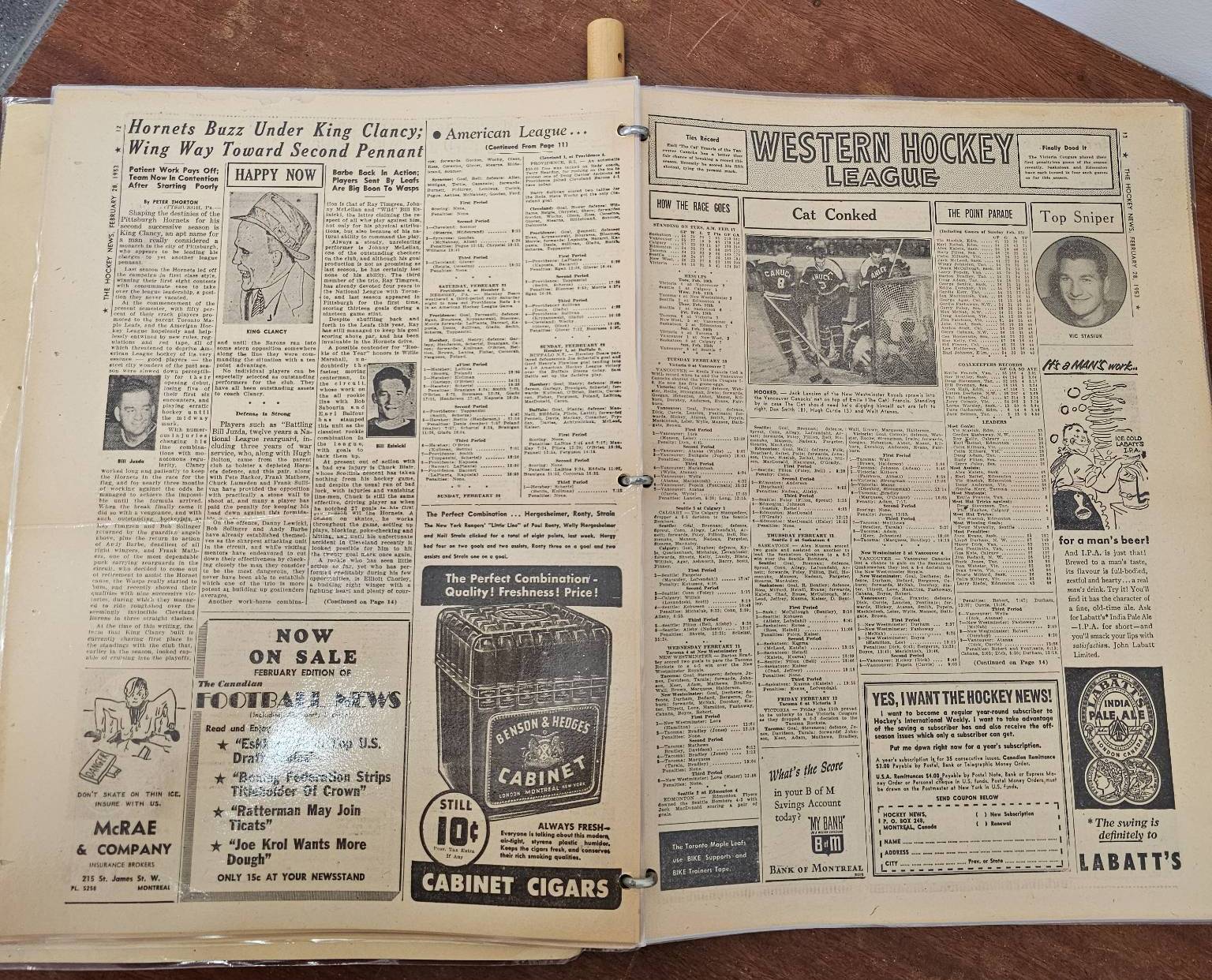 A framed poster promoting the Port Dover Ladie's Hockey Club event featuring the Toronto Vagabonds, held on Friday, March 2, at The Arena in Port Dover. Accompanied by a vintage compilation of The Hockey News issues, highlighting news, scores, and features of the era. The items show age-appropriate wear, with the poster protected under glass and the newspaper having visible creases and yellowing consistent with age.