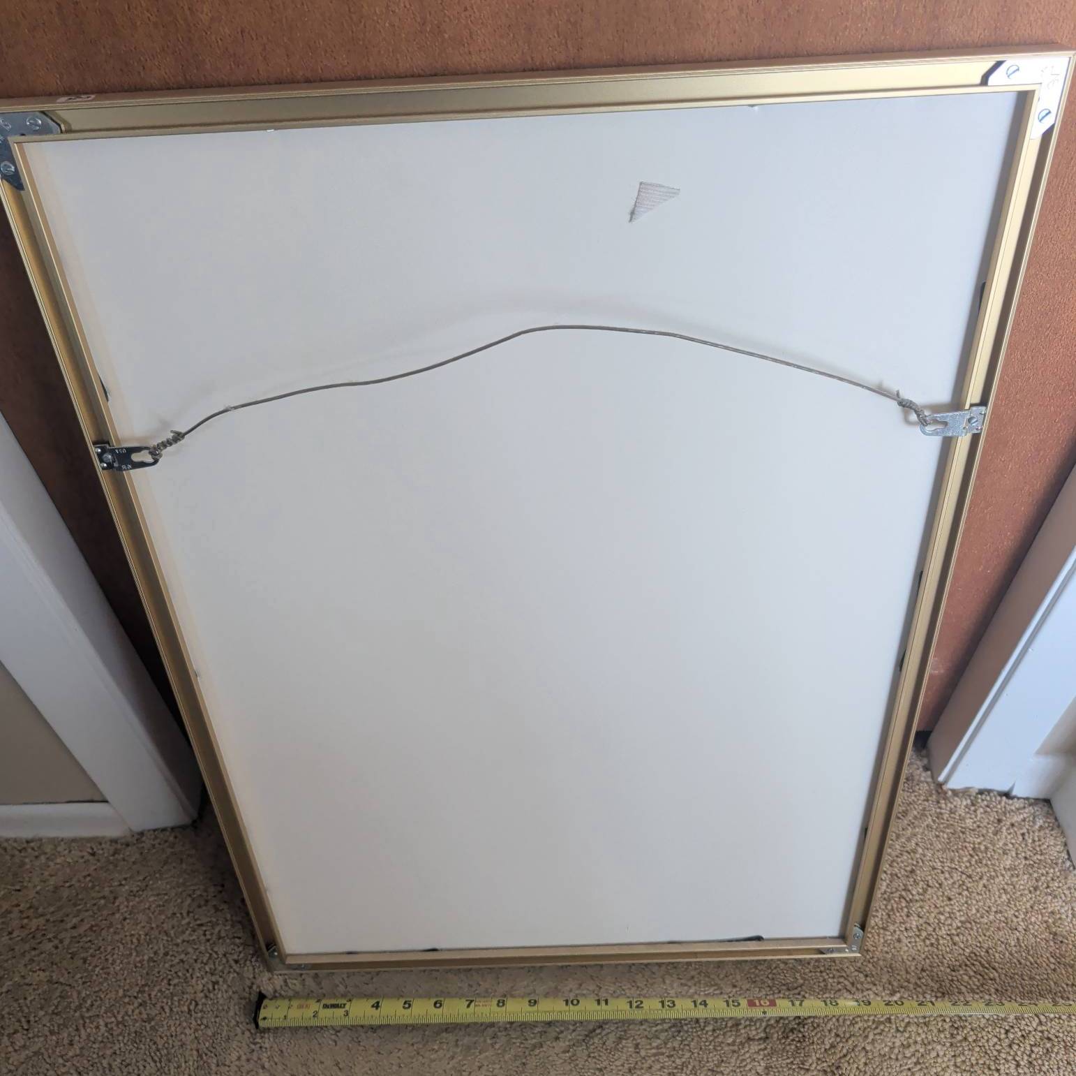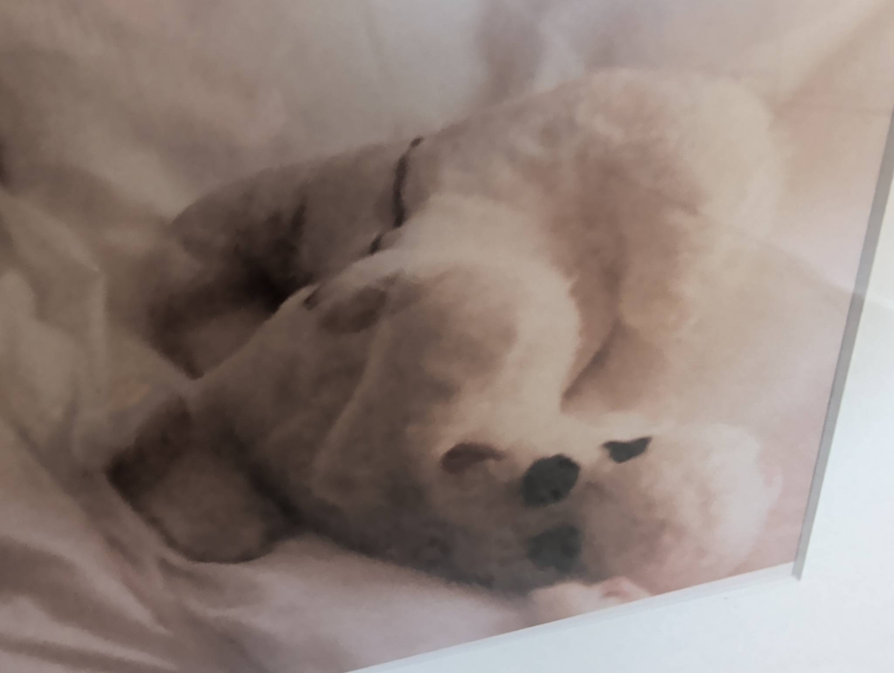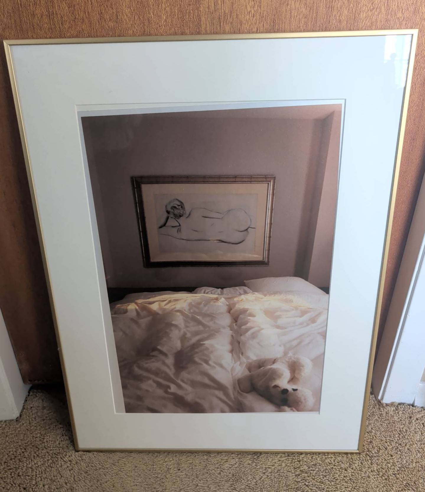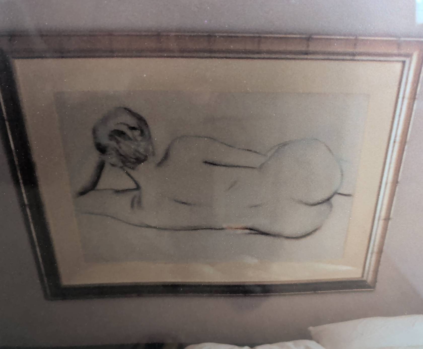 Framed art print featuring a two-part design with a reclining nude sketch in a propped frame and a small dog resting on bedding in a harmonious composition. The piece measures approximately 27 inches in height and 21 inches in width, including its gold-toned frame and white mat. Ready to hang with a secure wire hanger on the back. Ideal for art enthusiasts or interior decorators.