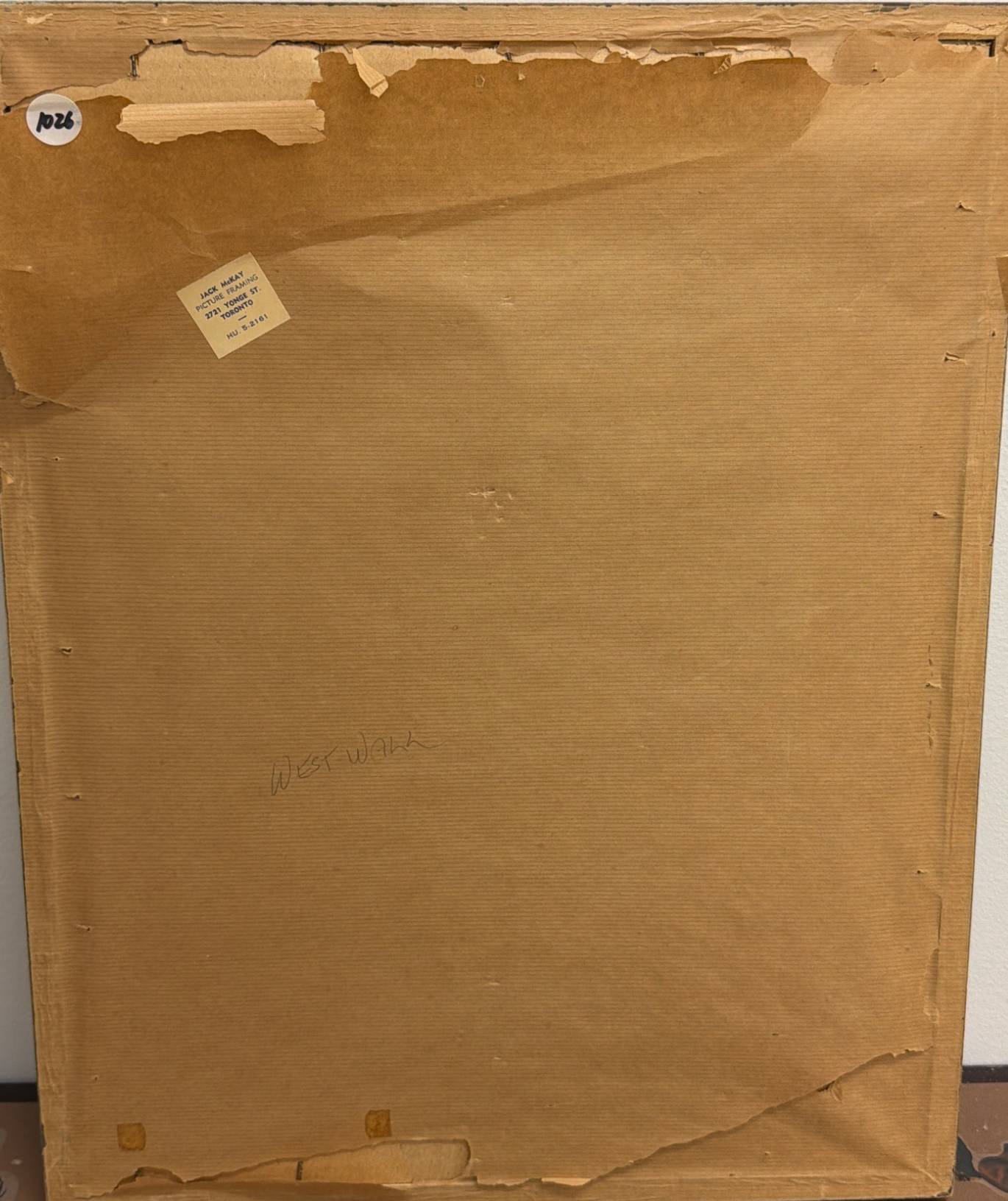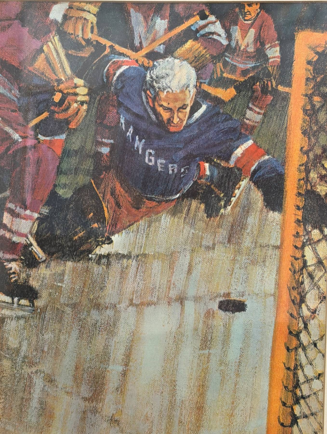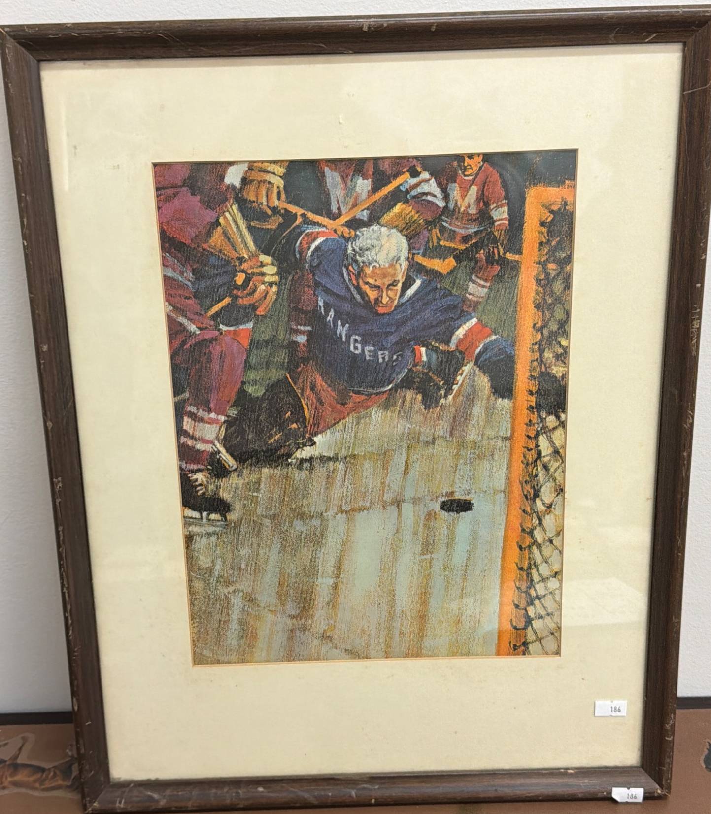 Framed print depicting a dynamic hockey scene that captures the spirit of the game. The piece measures 16" x 20" and is housed in a wooden frame, showing some wear consistent with age. The backing of the frame displays signs of aging and wear, adding to its charm. This is a great collectible for sports enthusiasts or those looking to add an element of athletic energy to their space.