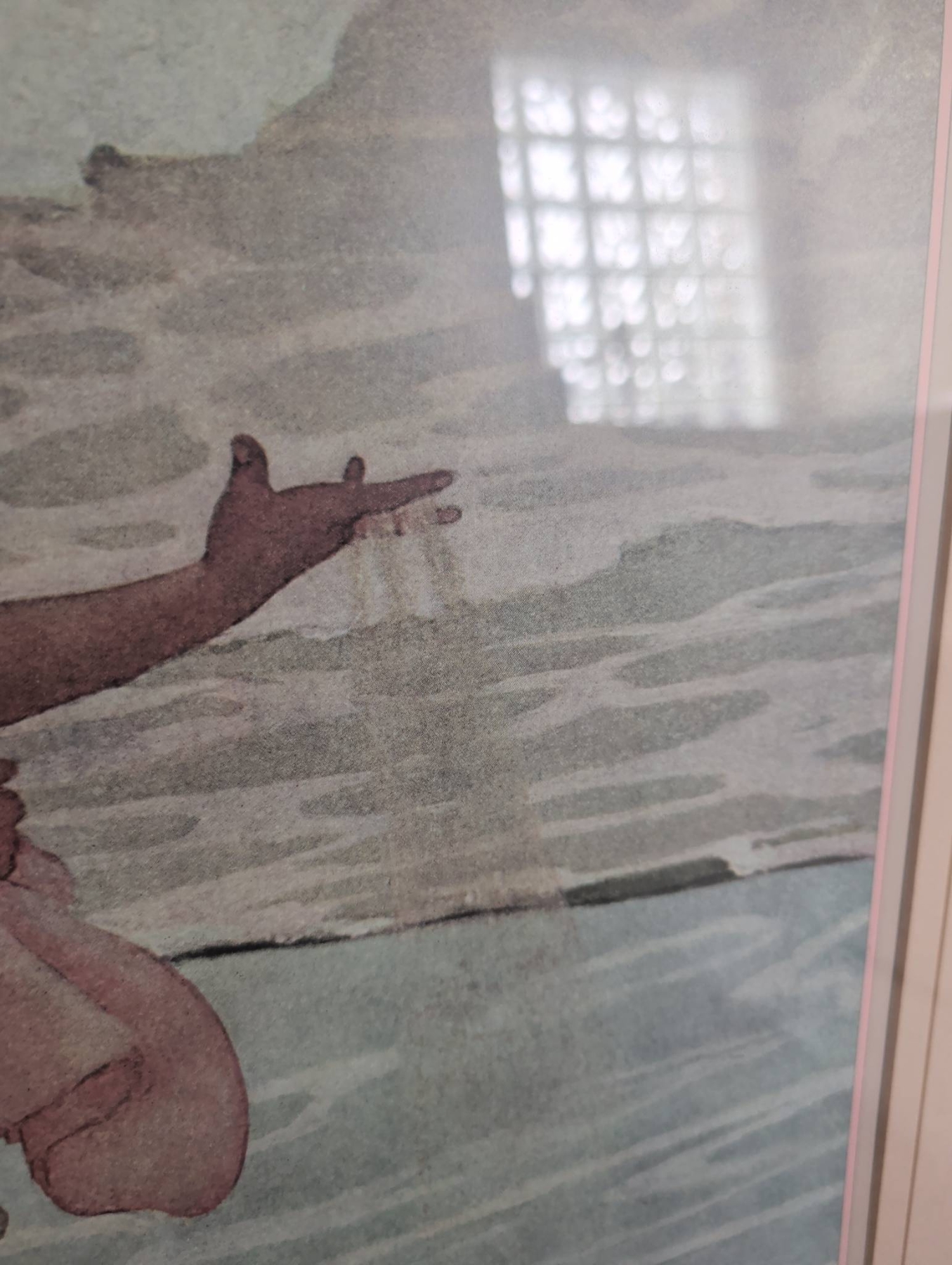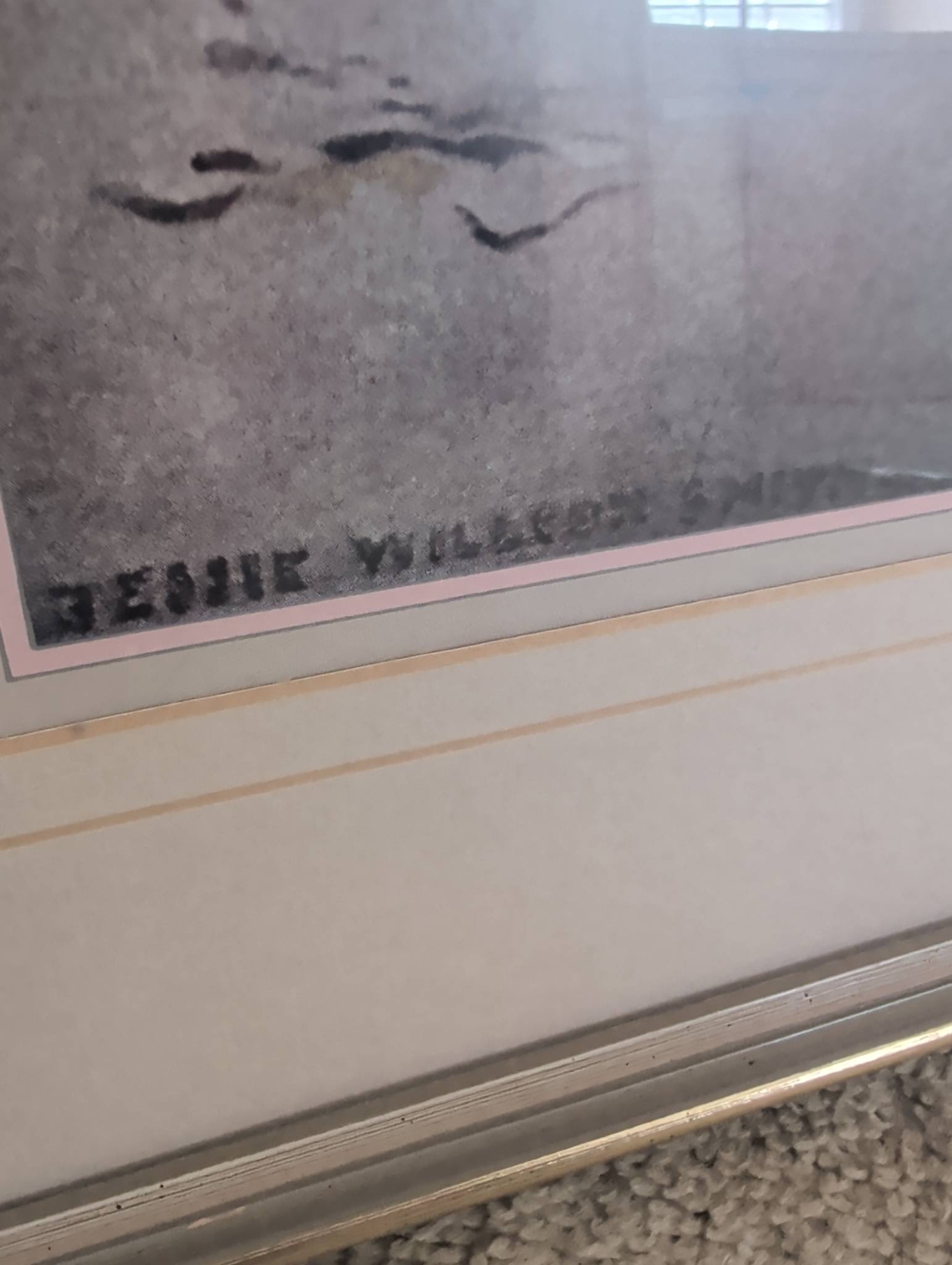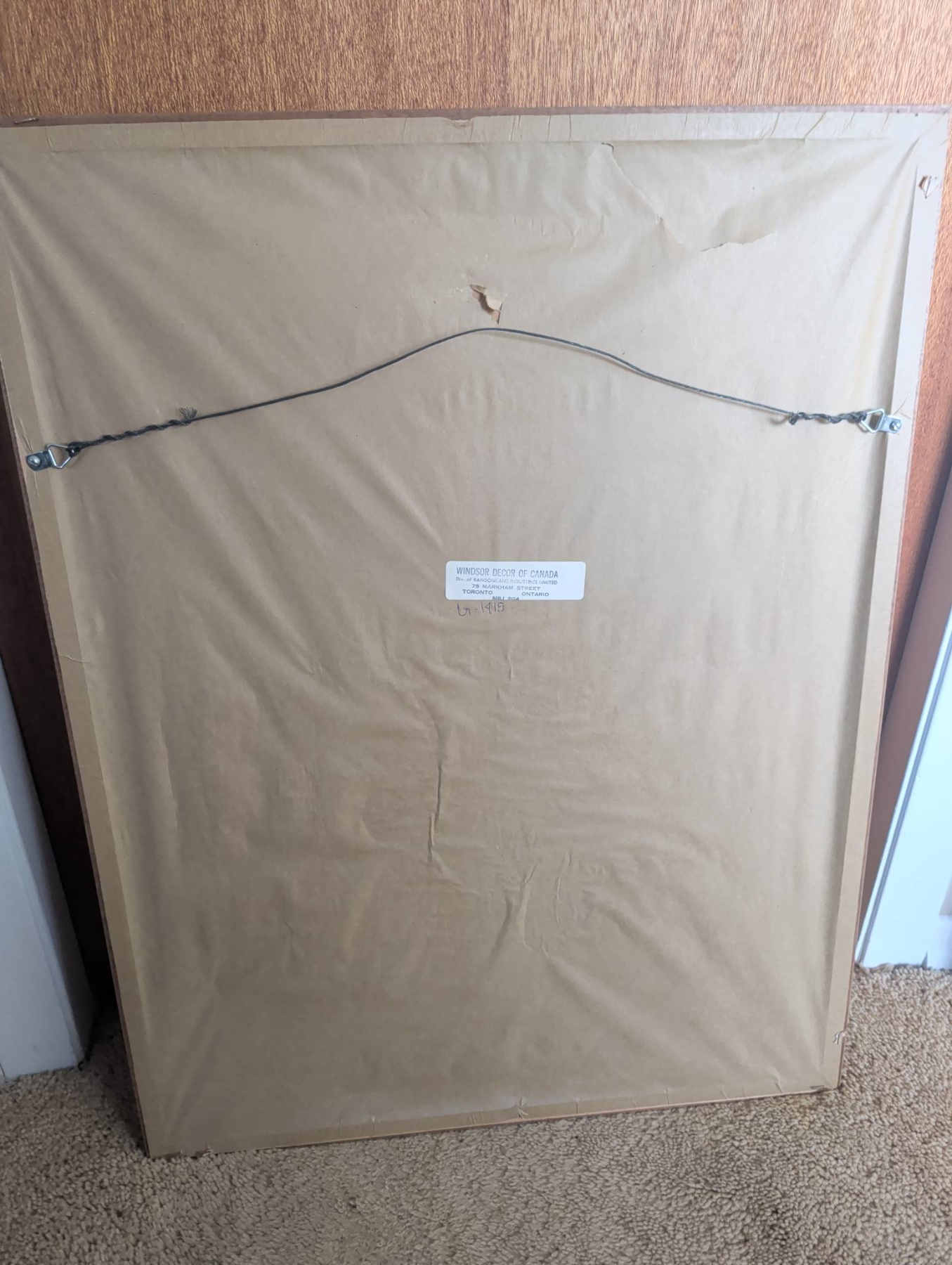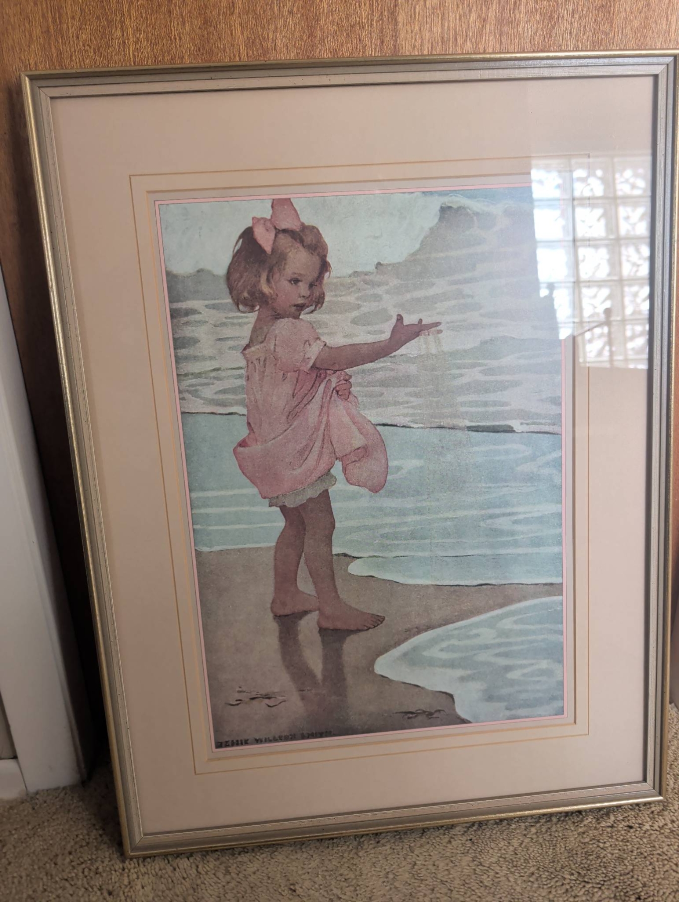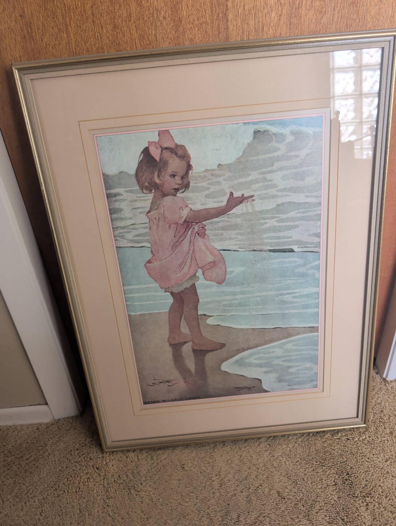 Framed reproduction artwork by Jessie Willcox Smith featuring a young girl by the sea. The piece is matted and set in a gold-tone frame, measuring approximately 22 inches in width and 28 inches in height. The back of the frame is labeled Windsor Decor of Canada. Includes wire hanging hardware for easy display. Notable slight wear is present on the artwork and frame.