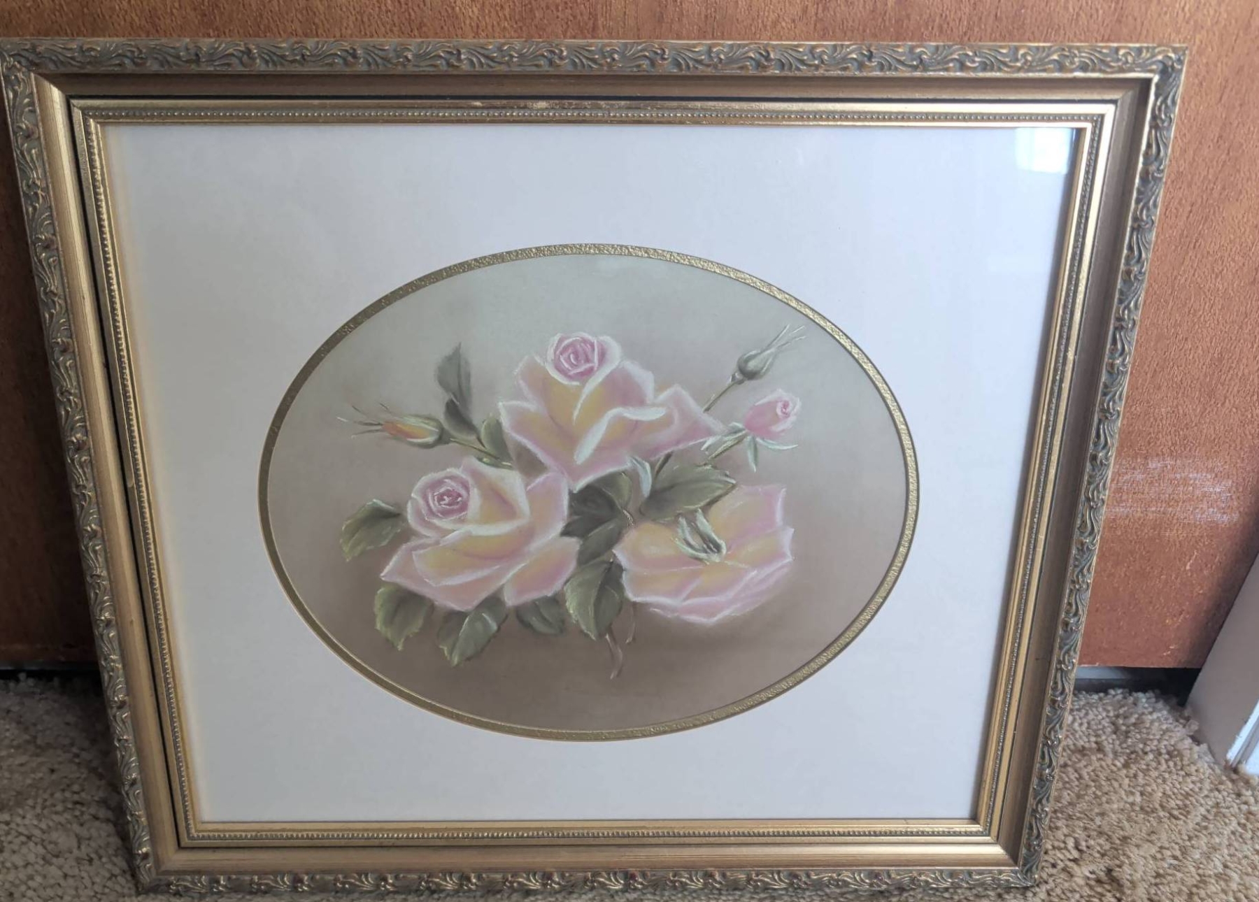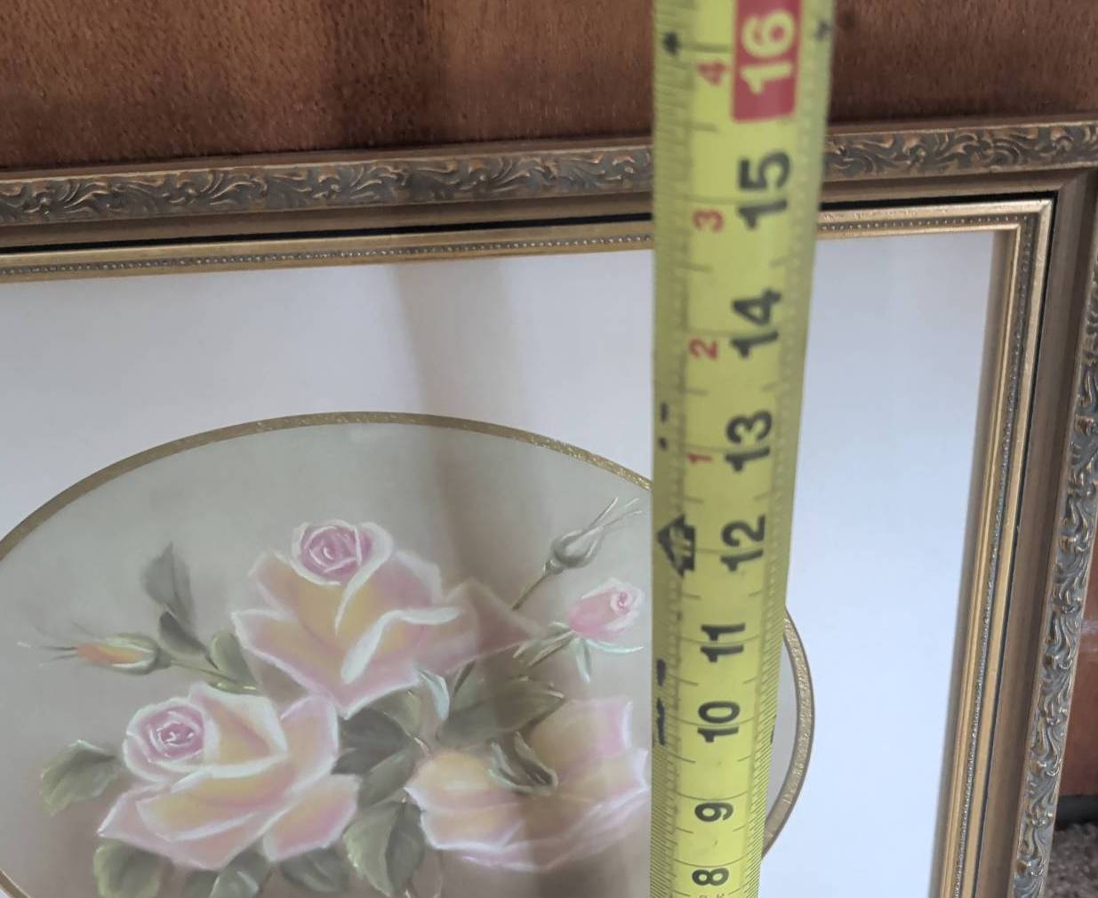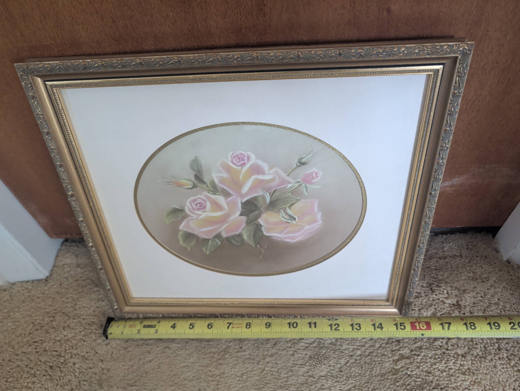 An elegant floral artwork featuring pink roses, signed by the artist (signature visible: possibly ‘Ruth Alexander’). Set in an ornate gold-tone frame with a detailed border. The artwork is protected by glass and measures approximately 17 inches wide and 15 inches tall. It includes a wire hanger on the back for easy wall mounting. A classic addition to any decor setting.