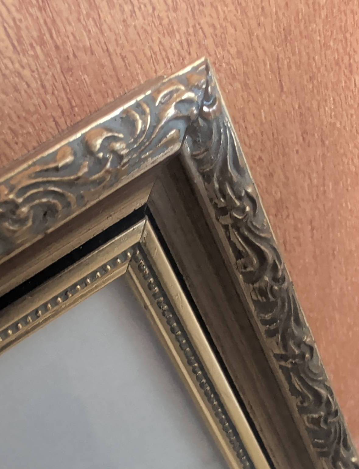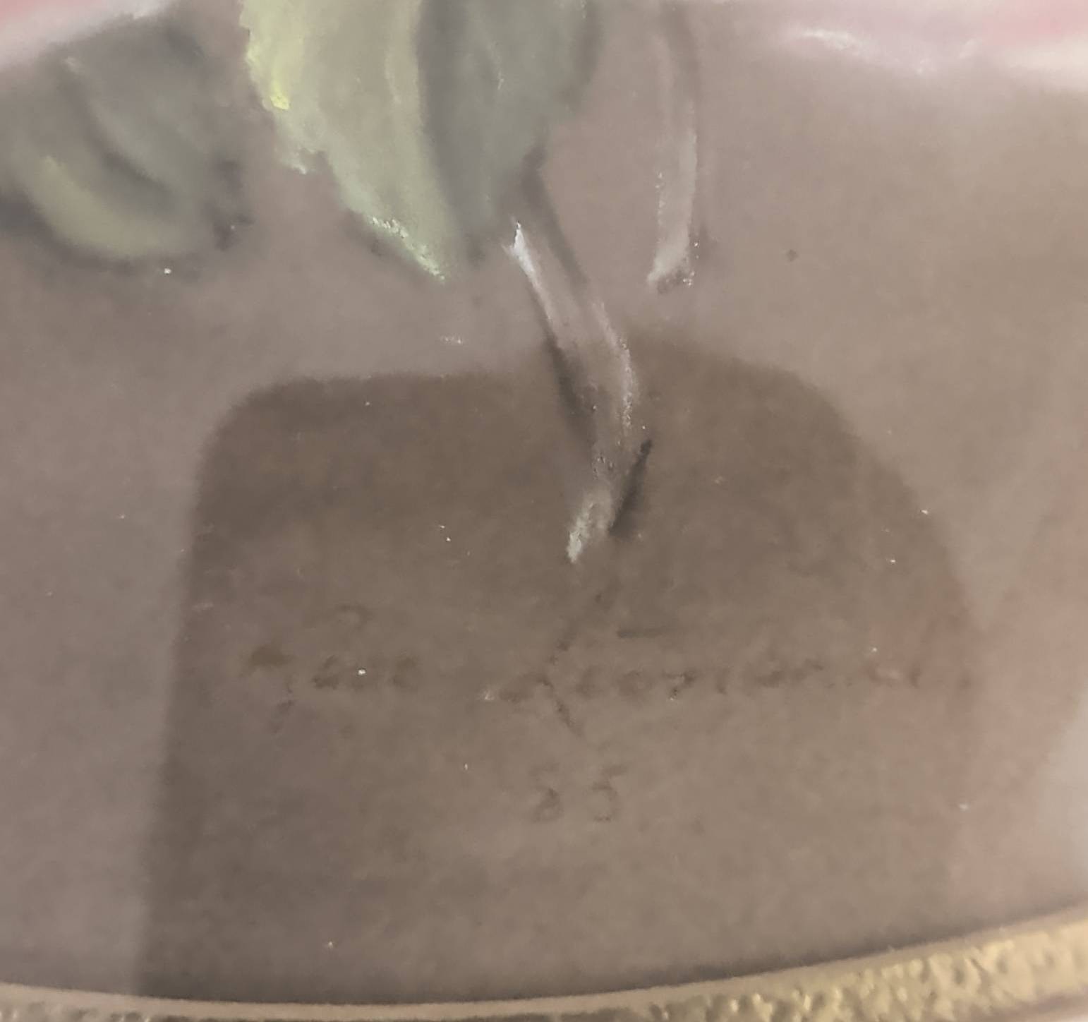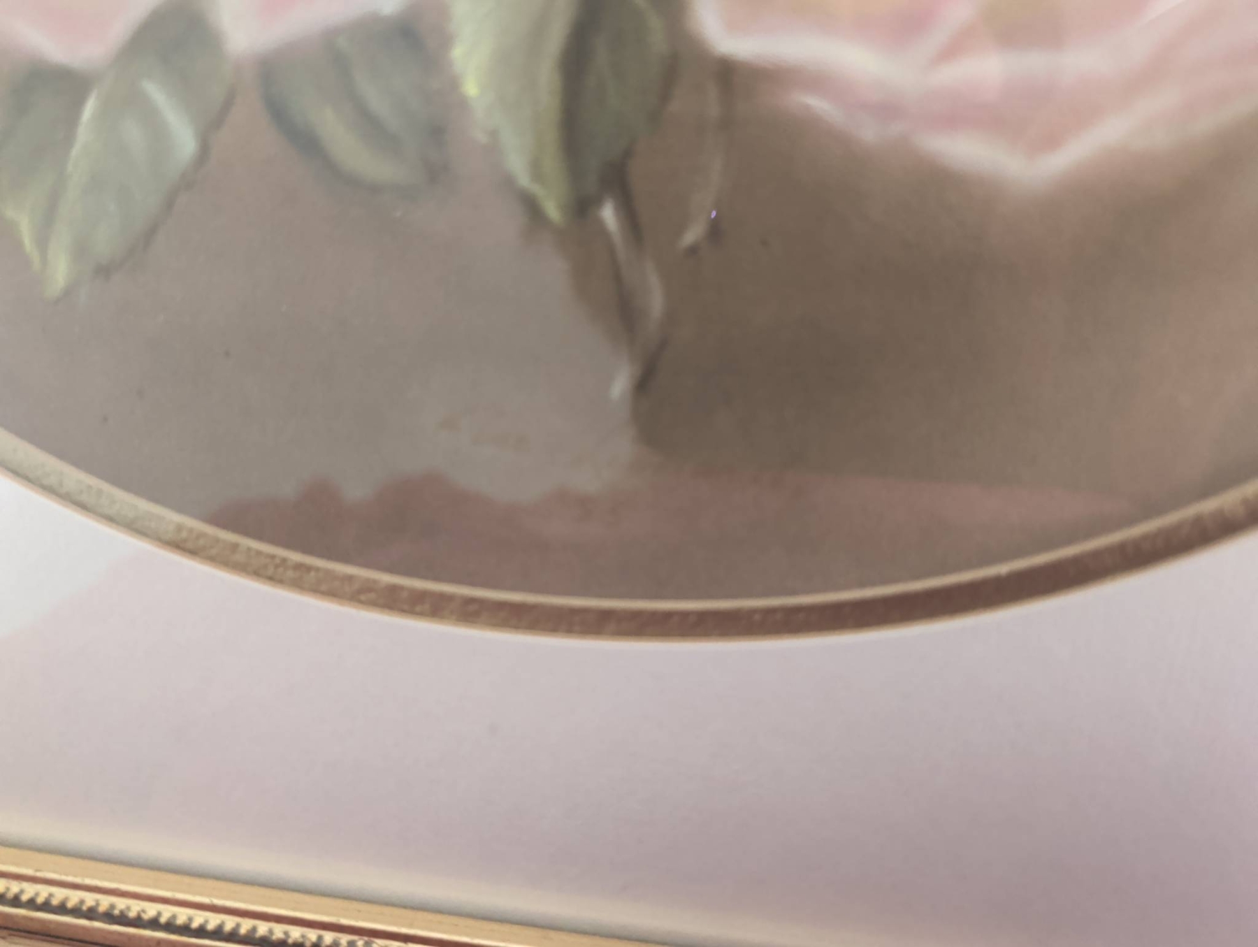 An elegant floral artwork featuring pink roses, signed by the artist (signature visible: possibly ‘Ruth Alexander’). Set in an ornate gold-tone frame with a detailed border. The artwork is protected by glass and measures approximately 17 inches wide and 15 inches tall. It includes a wire hanger on the back for easy wall mounting. A classic addition to any decor setting.