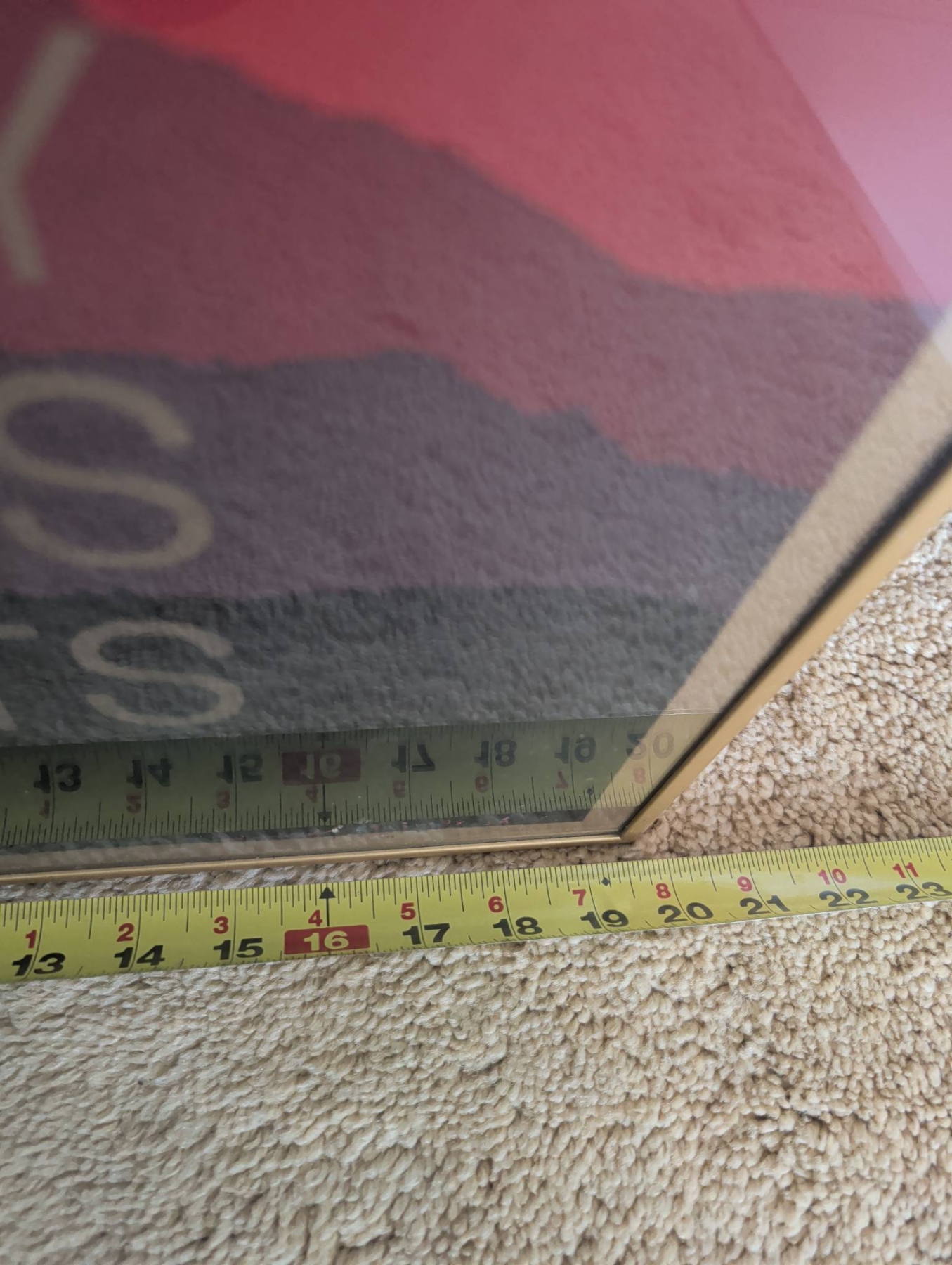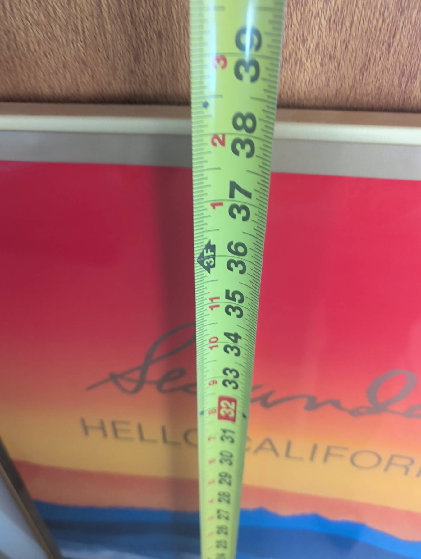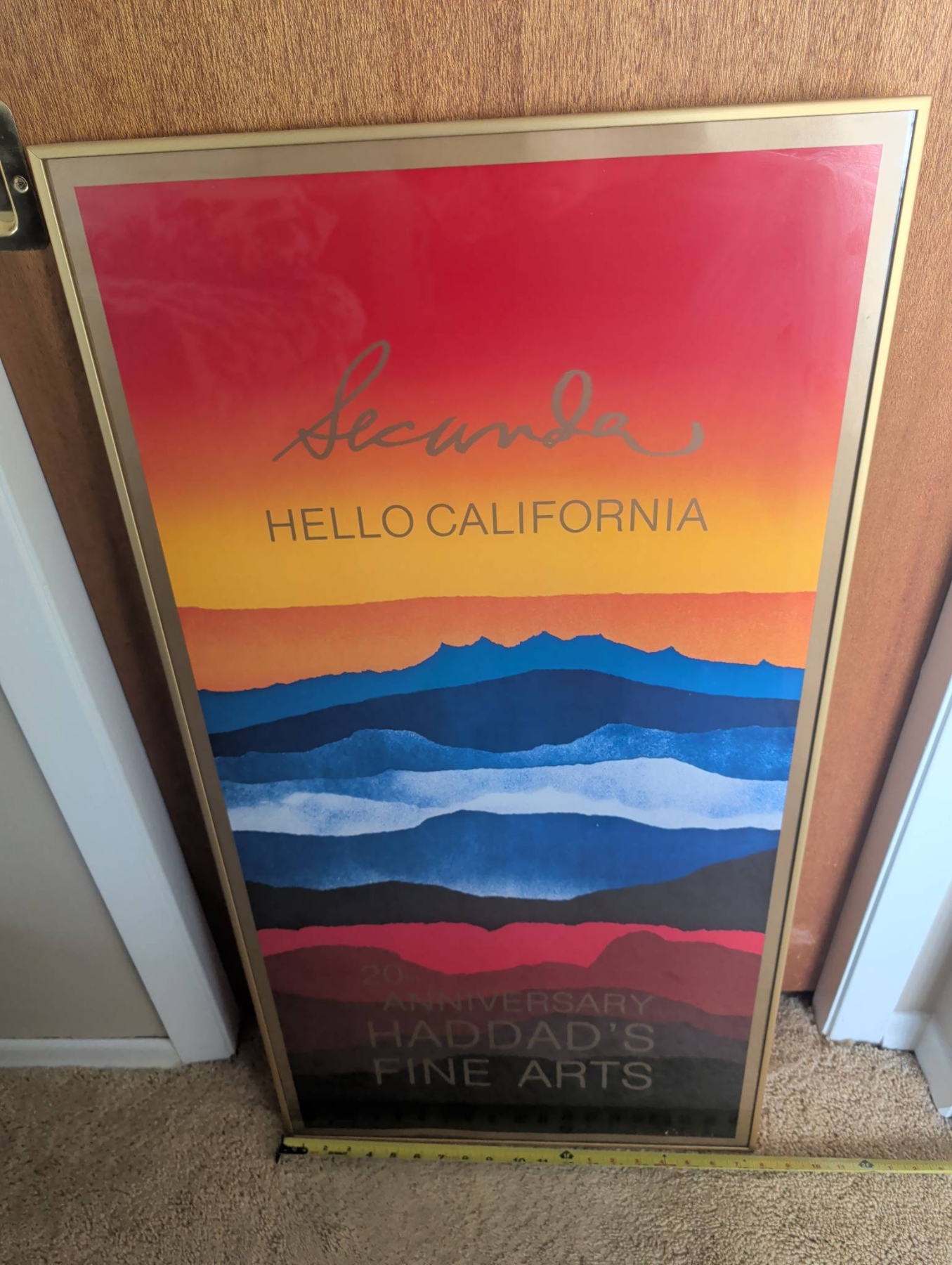 Framed artwork featuring vibrant ‘Hello California’ design, highlighting a layered mountainous aesthetic in warm tones. Positioned within a metallic frame, this piece measures approximately 37 inches in height and 17 inches in width. Includes rear hanging wire for convenient wall display. Excellent choice for enthusiasts of bold, colorful art or California-inspired themes.