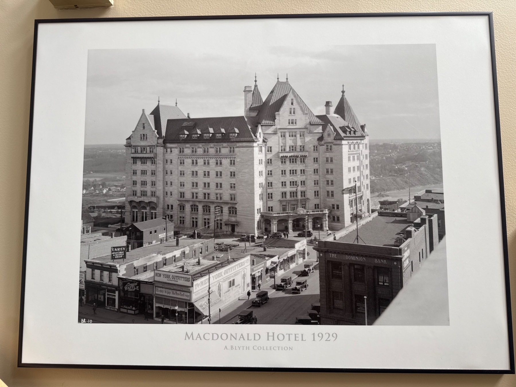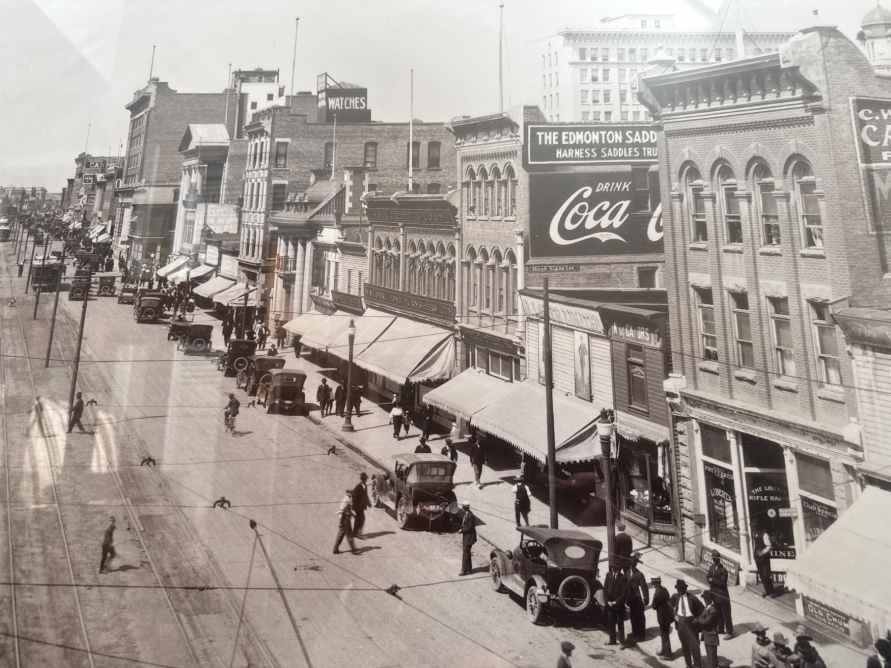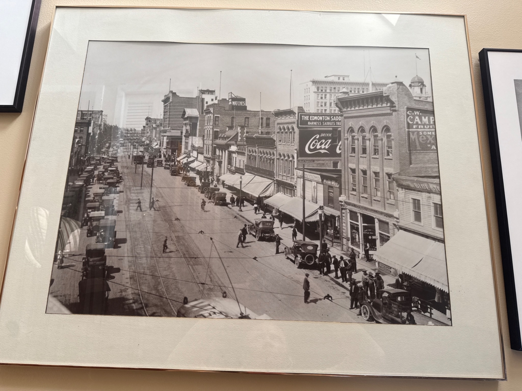 Two framed historical prints showcasing iconic Edmonton locations. The first print captures a bustling streetscape with visible period advertising and vintage automobiles, reflecting early 20th-century Edmonton life. The second print features the grand MacDonald Hotel dated 1929, an architectural centerpiece from the city's history. Both prints are professionally matted and framed, ready for display.
