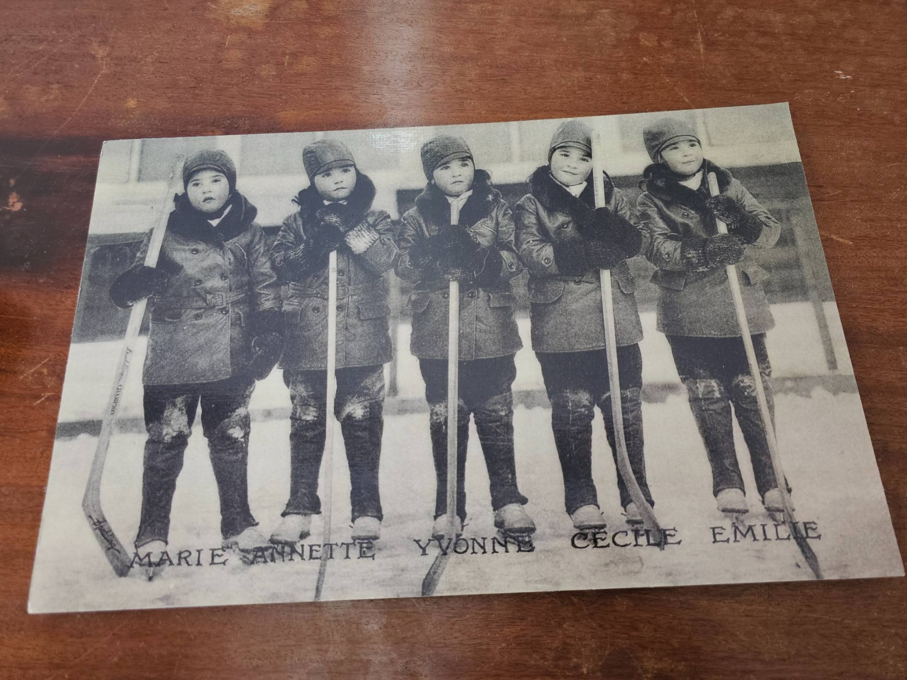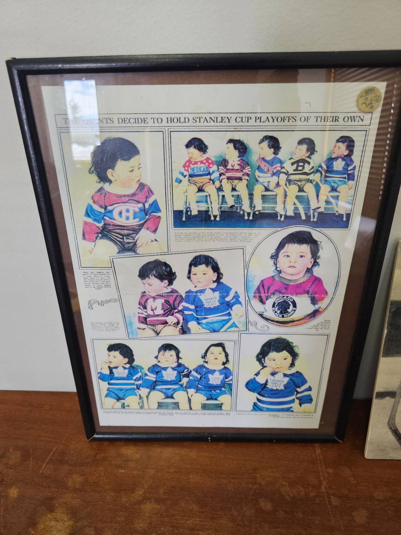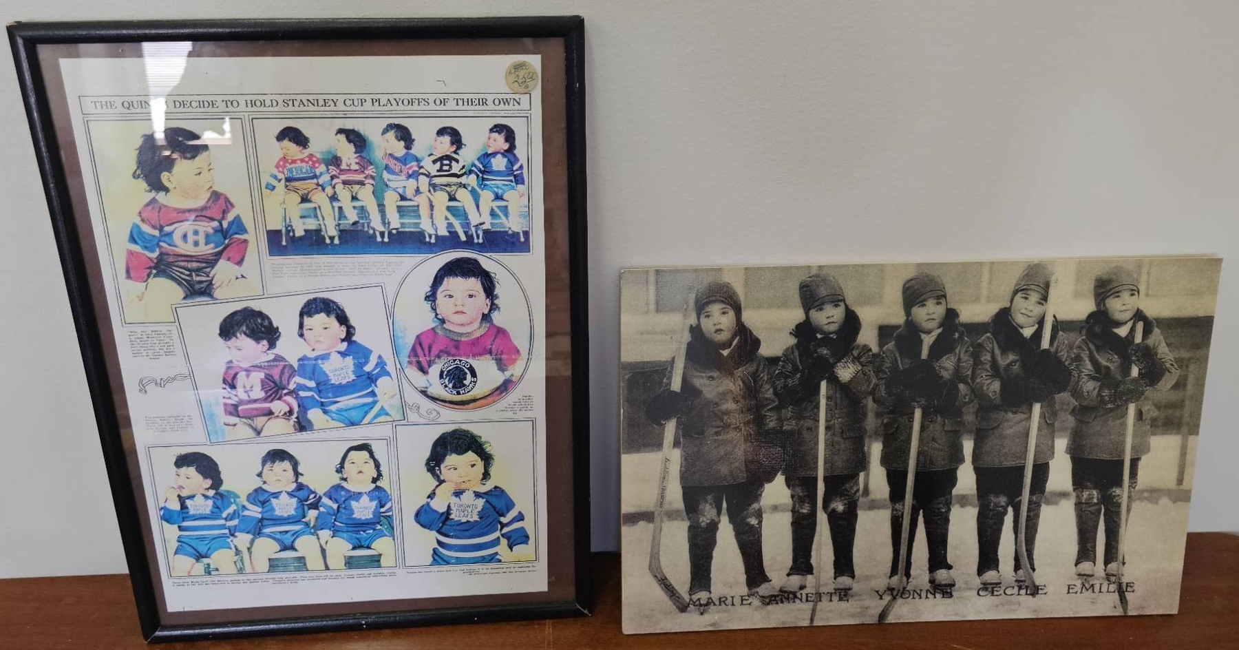 Two framed hockey-related images. The first is a printed newspaper or magazine feature depicting young children in hockey jerseys, framed under glass. The second image shows five young children standing outdoors posed with hockey sticks. The second is mounted on a photo board or canvas-like material. Both items show signs of age but appear intact and suitable for display.